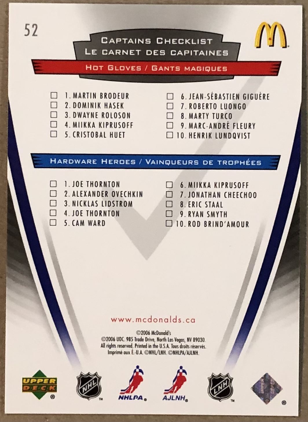 McDonald's #52 NHL, hockey, UD, regional, hall of fame