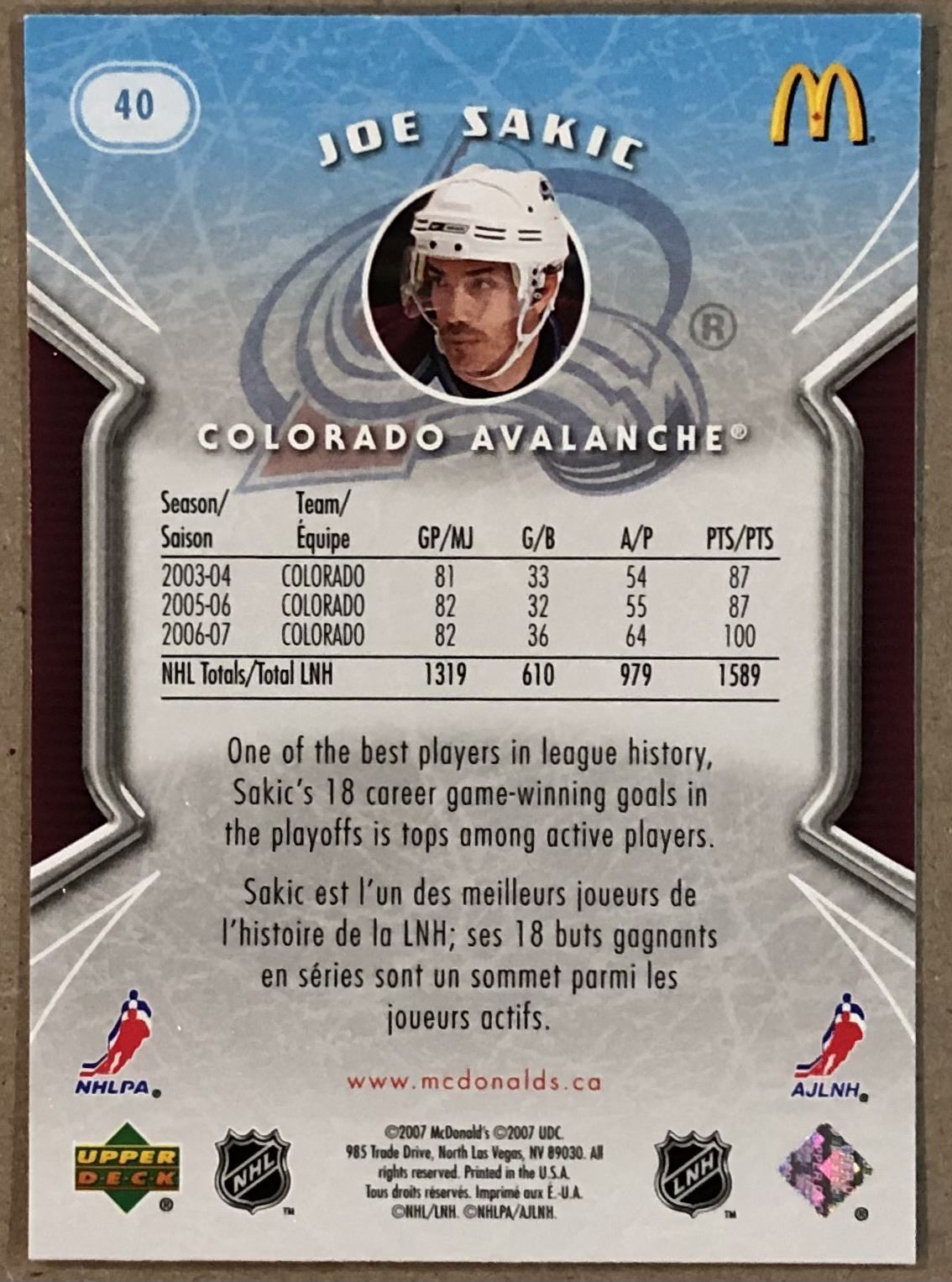 Lot 410 2007-08 UPPER DECK JOE SAKIC (HOF)