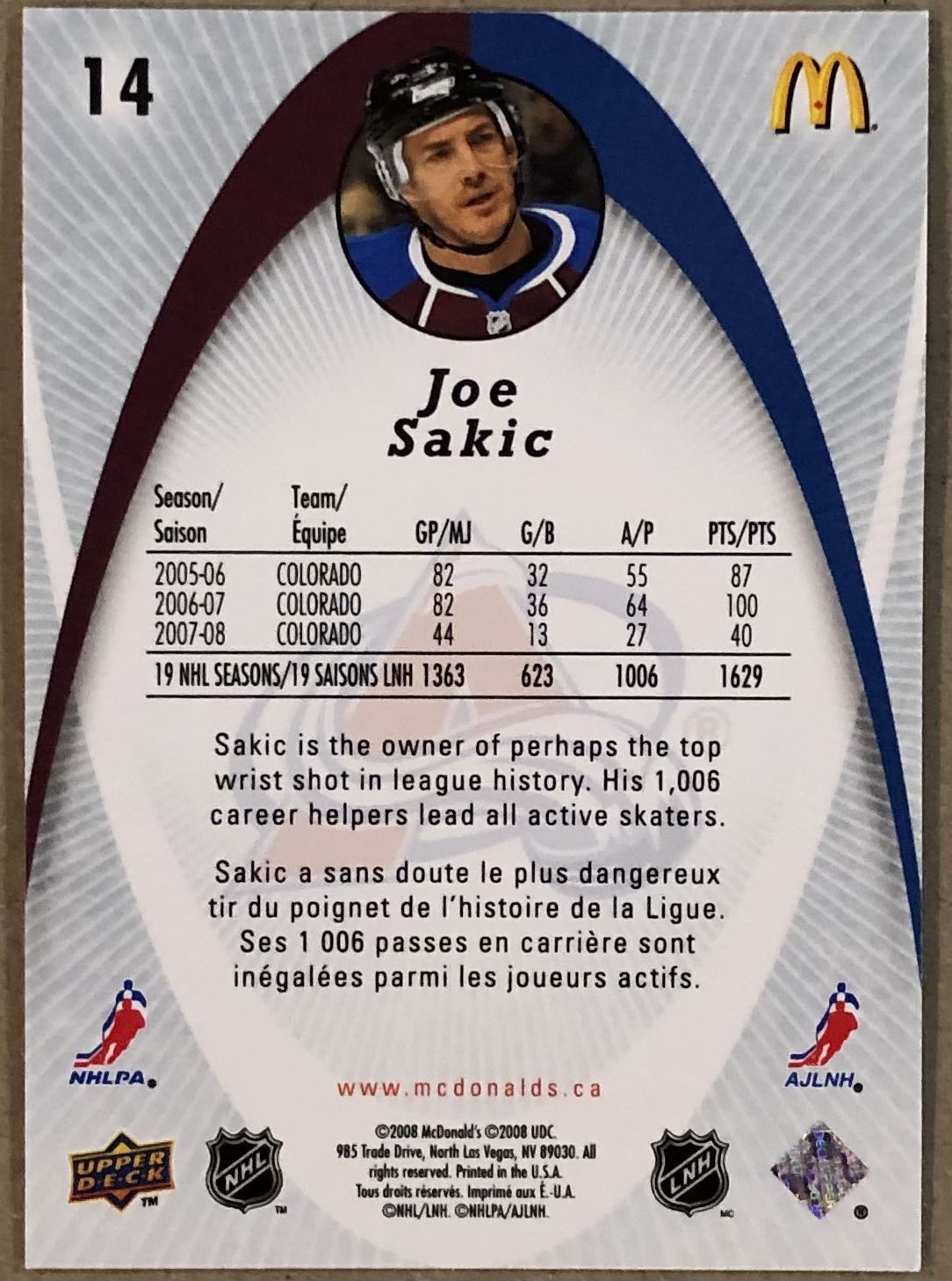 Lot 414 2008-09 UPPER DECK JOE SAKIC (HOF)