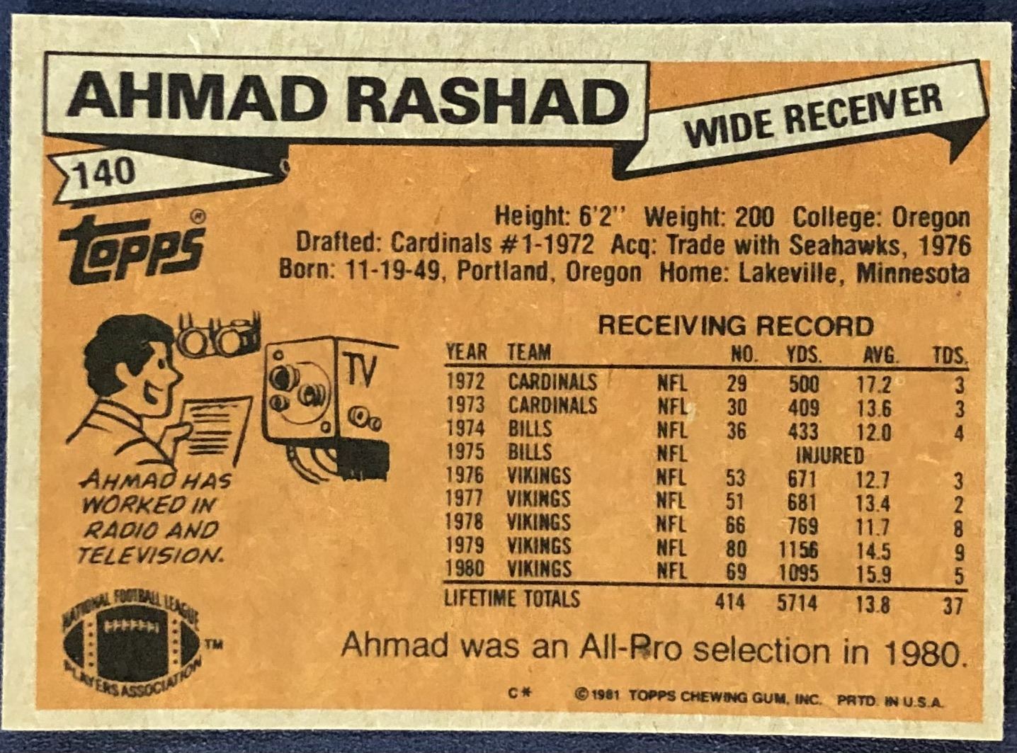 Lot 474 1981 TOPPS NFL AHMAD RASHID