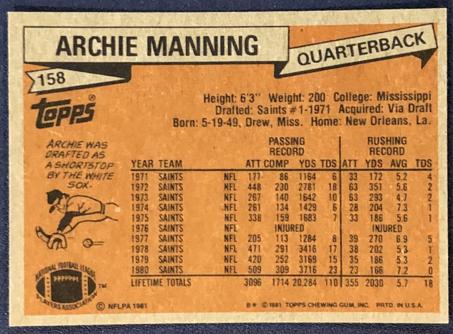 Lot 479 1981 TOPPS NFL ARCHIE MANNING