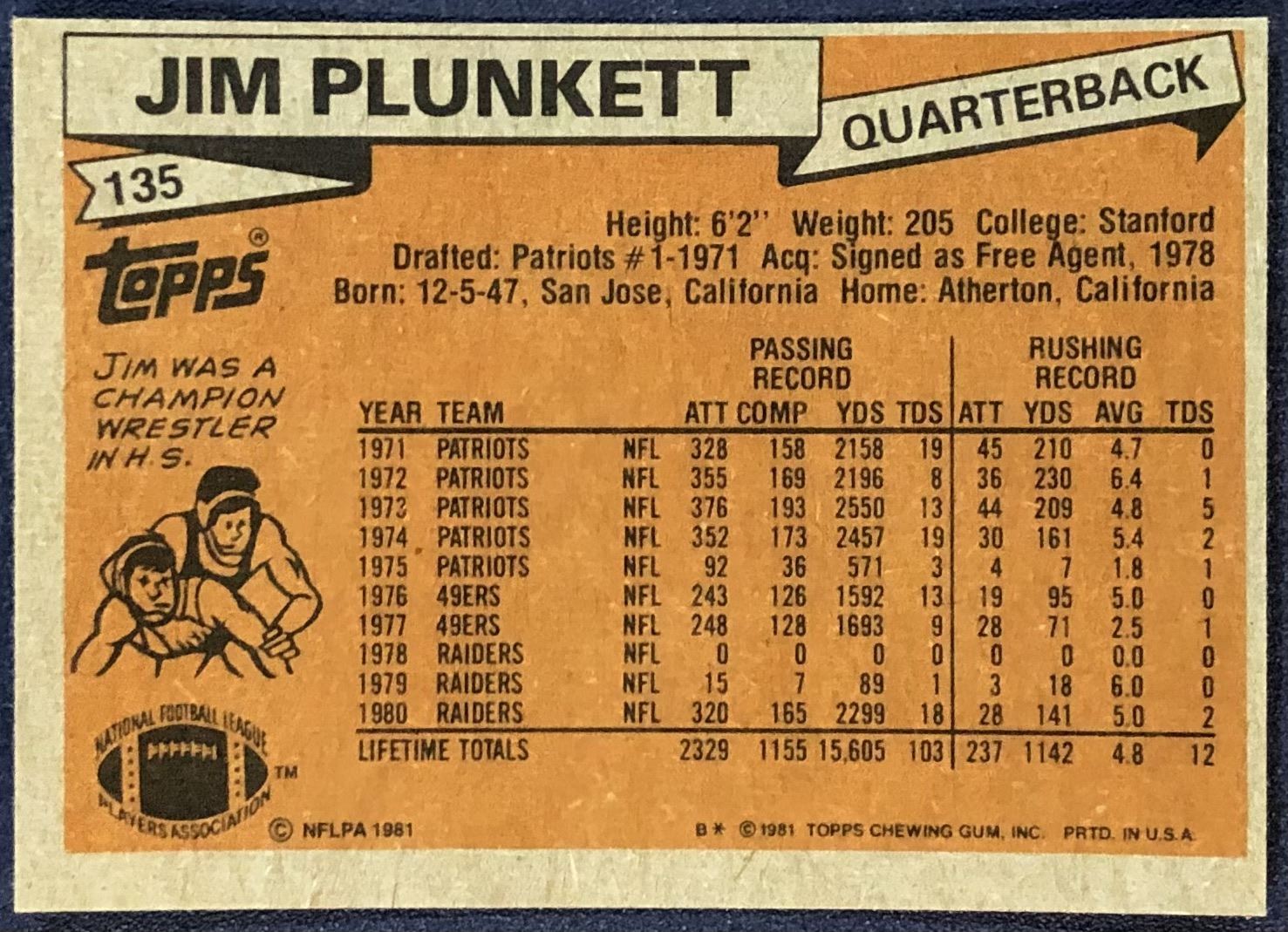 Lot 531 1981 TOPPS NFL JIM PLUNKETT