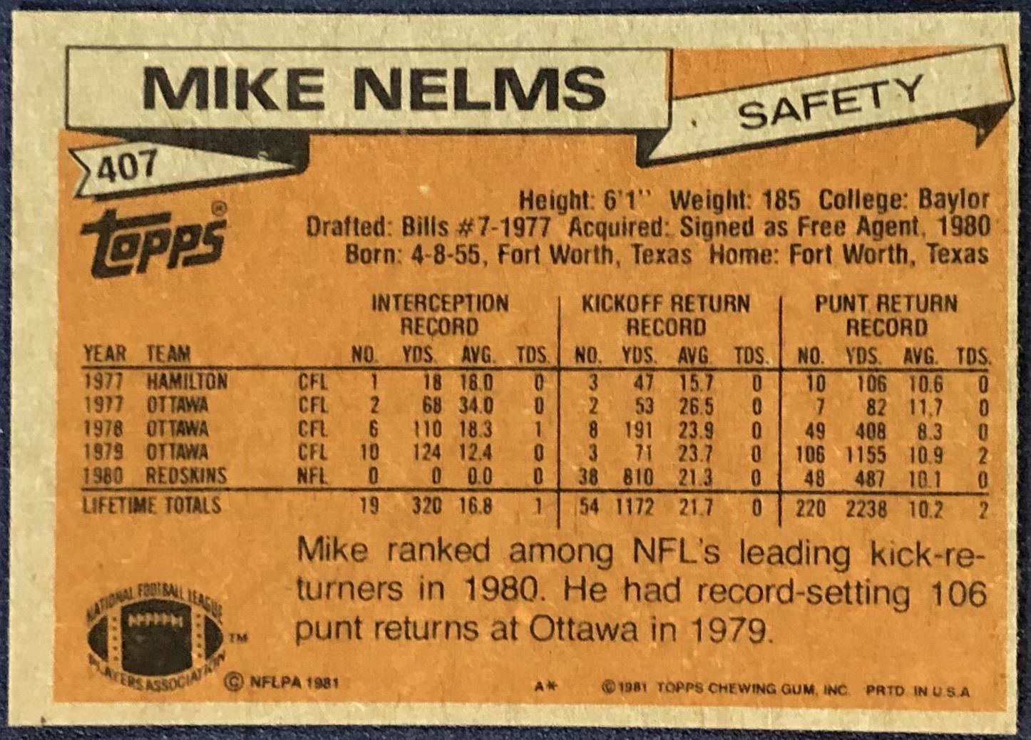 Lot 561 1981 TOPPS NFL MIKE NELMS ROOKIE CARD