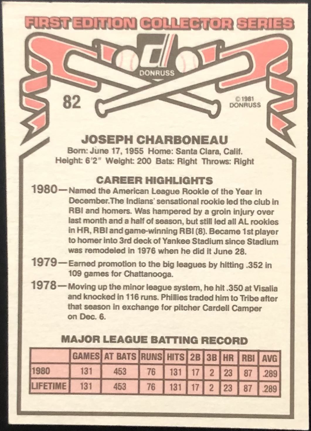 Lot 613 1981 DONRUSS JOE CHARBONEAU ROOKIE CARD