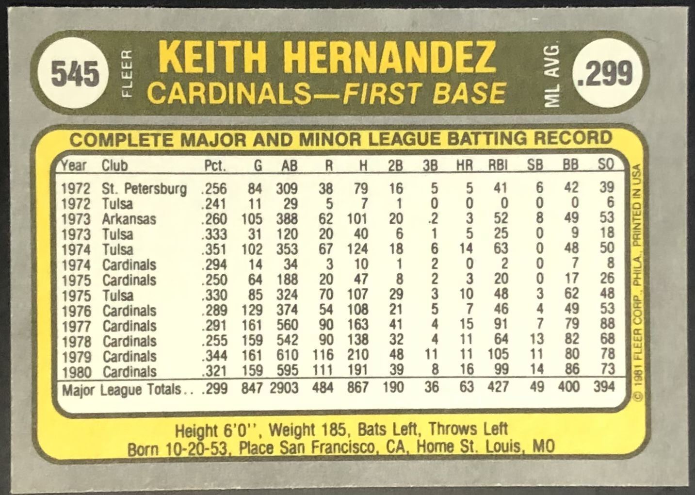 Lot 617 1981 FLEER KEITH HERNANDEZ (HOF)
