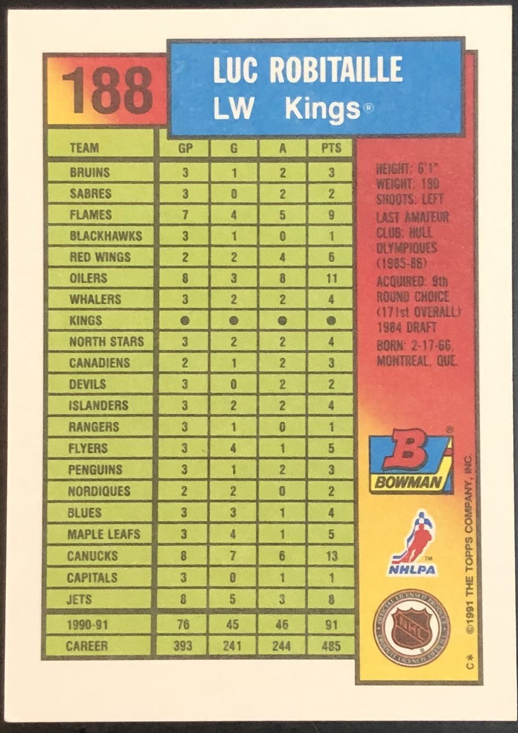 Lot 703 1991-92 BOWMAN LUC ROBITAILLE (HOF)
