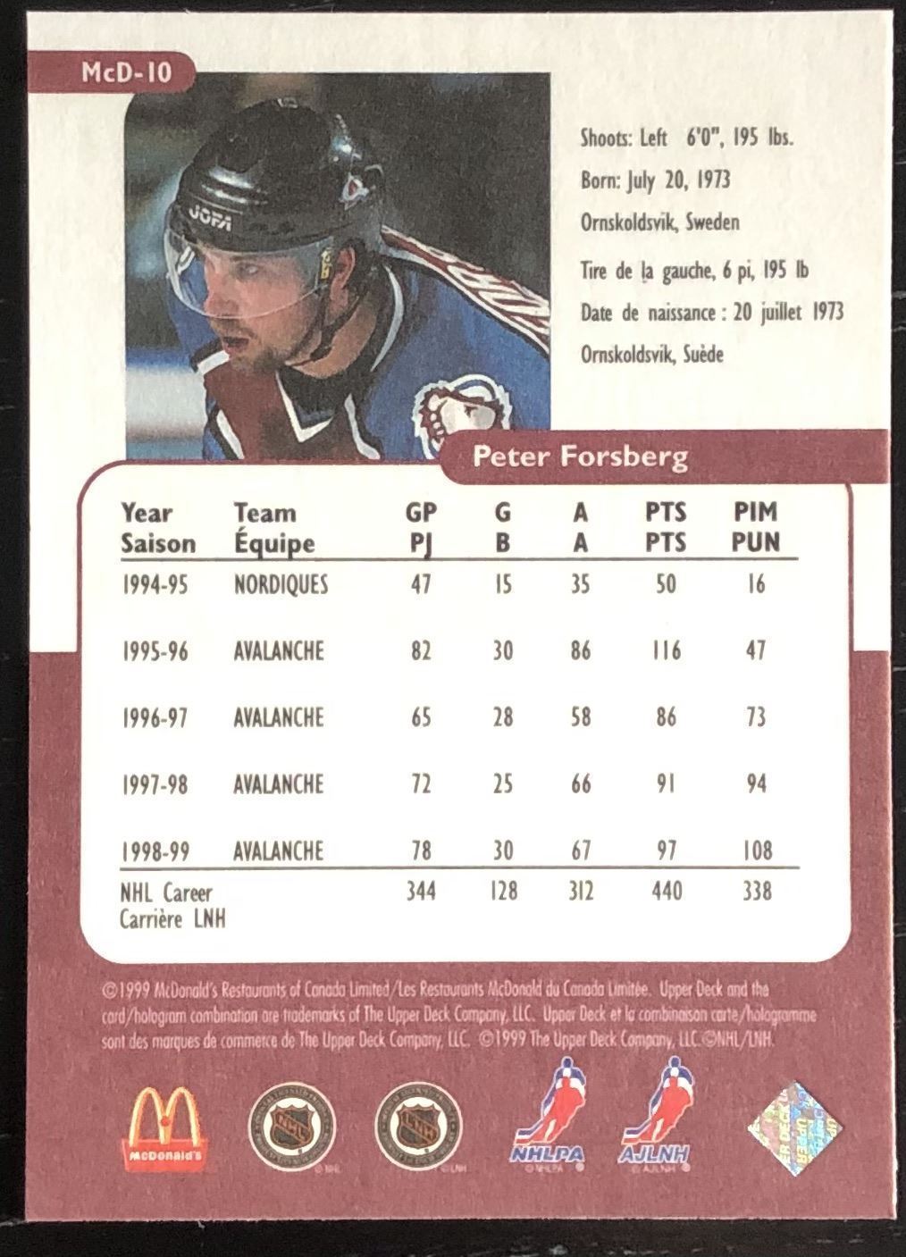 Lot 767 1999-2000 UPPER DECK RETRO PETER FORSBERG (HOF)