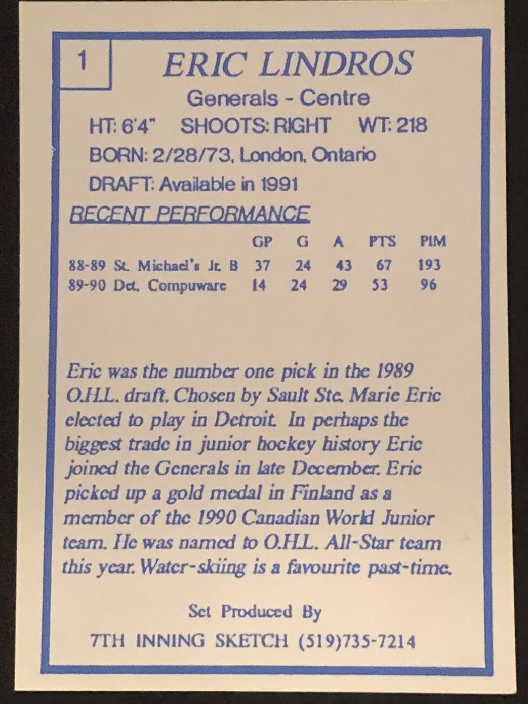 Team set, featuring first card of HOF'er Eric Lindros, produced by 7th Inning Sketch.