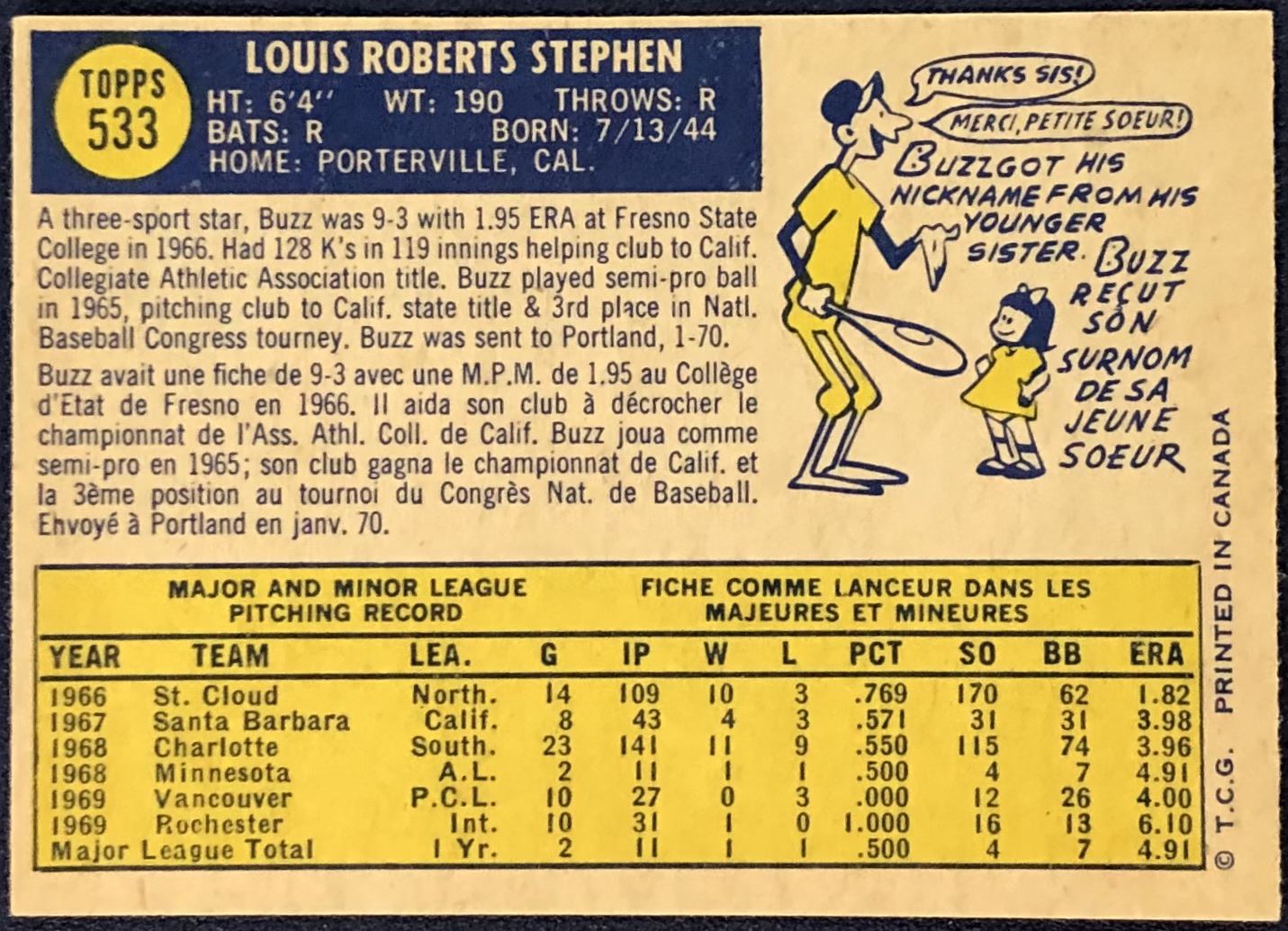 Lot 804 1970 O-PEE-CHEE BUZZ STEPHEN ROOKIE CARD