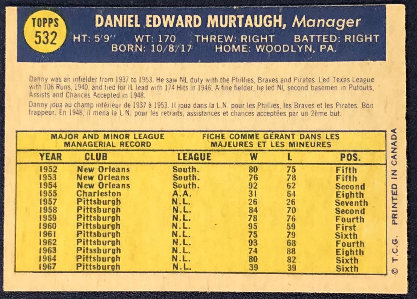 Lot 806 1970 O-PEE-CHEE DANNY MURTAUGH