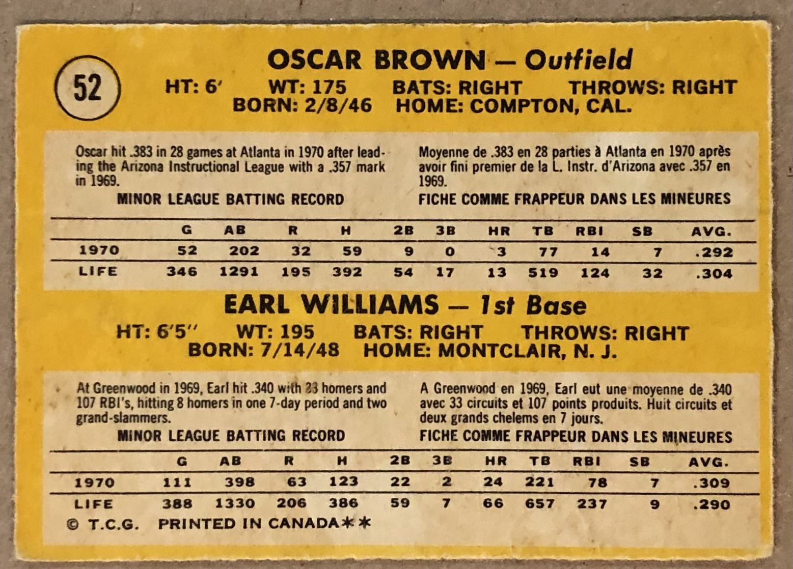 Lot 850 1971 O-PEE-CHEE EARL WILLIAMS ROOKIE CARD