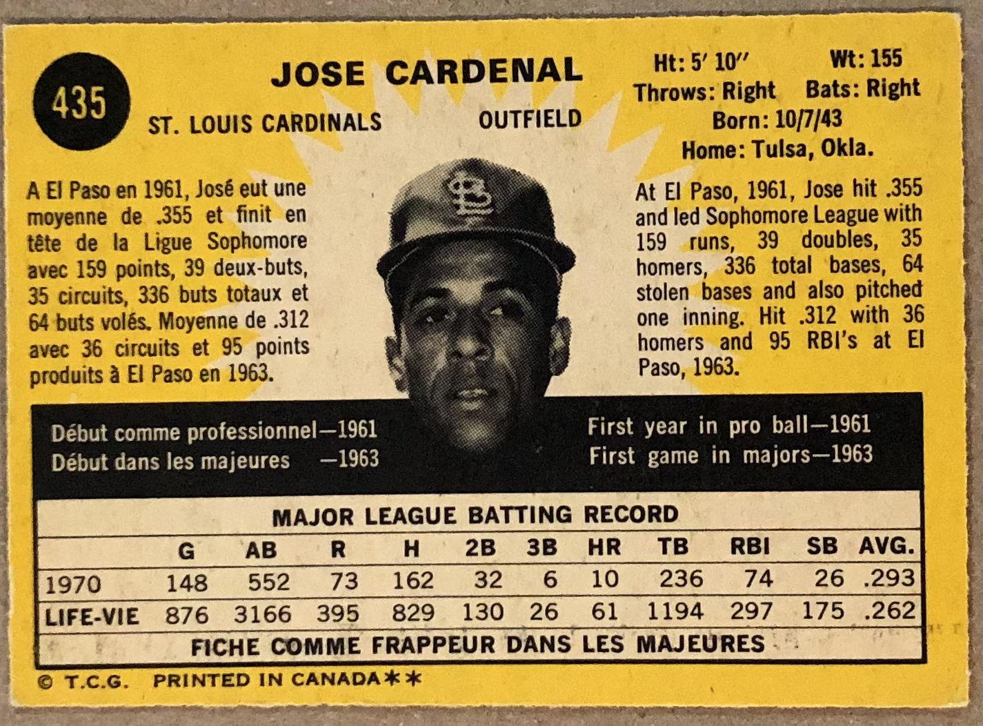 Lot 858 1971 O-PEE-CHEE JOSE CARDENAL