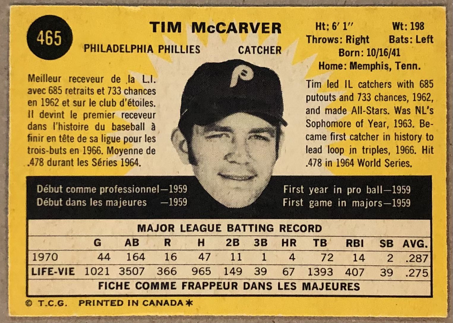 Lot 881 1971 O-PEE-CHEE TIM McCARVER