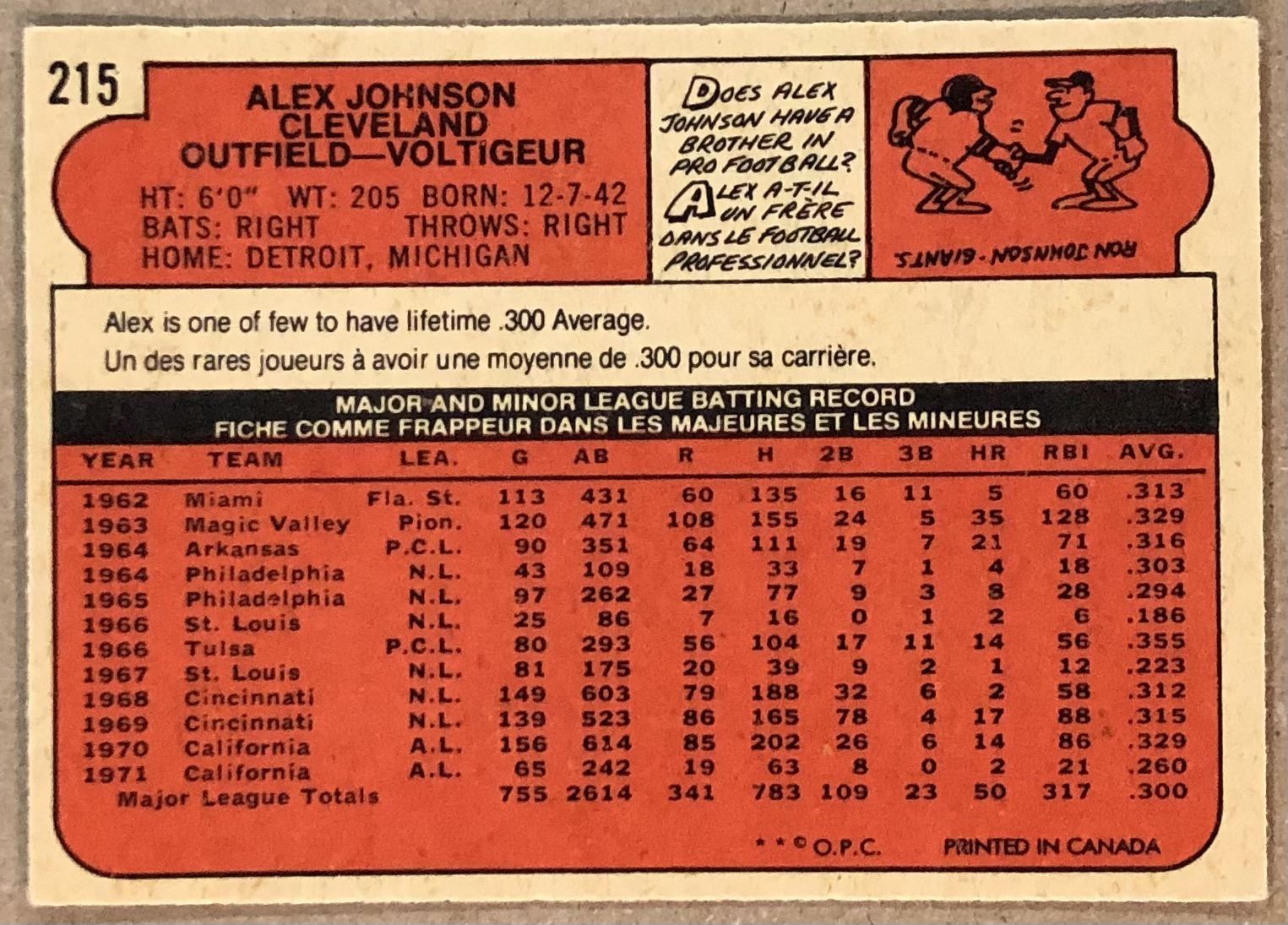 Lot 891 1972 O-PEE-CHEE ALEX JOHNSON