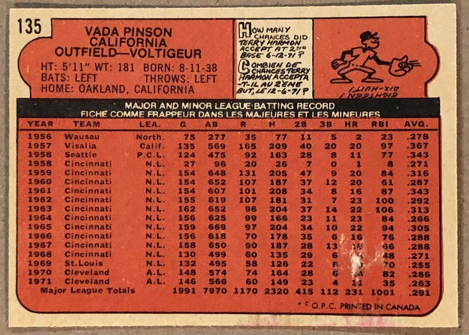 Lot 924 1972 O-PEE-CHEE VADA PINSON