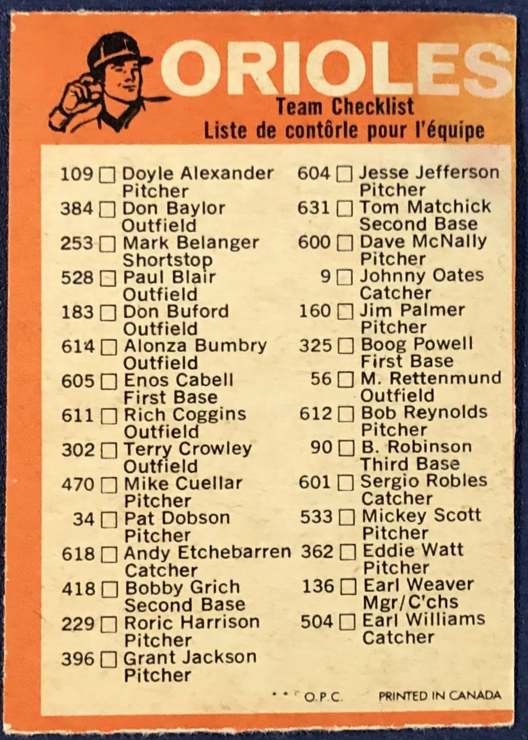 1973 O-PEE-CHEE BALTIMORE ORIOLES