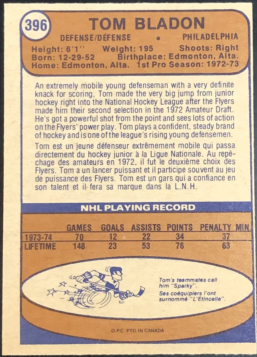Lot 1040 1974-75 O-PEE-CHEE TOM BLADON ROOKIE CARD