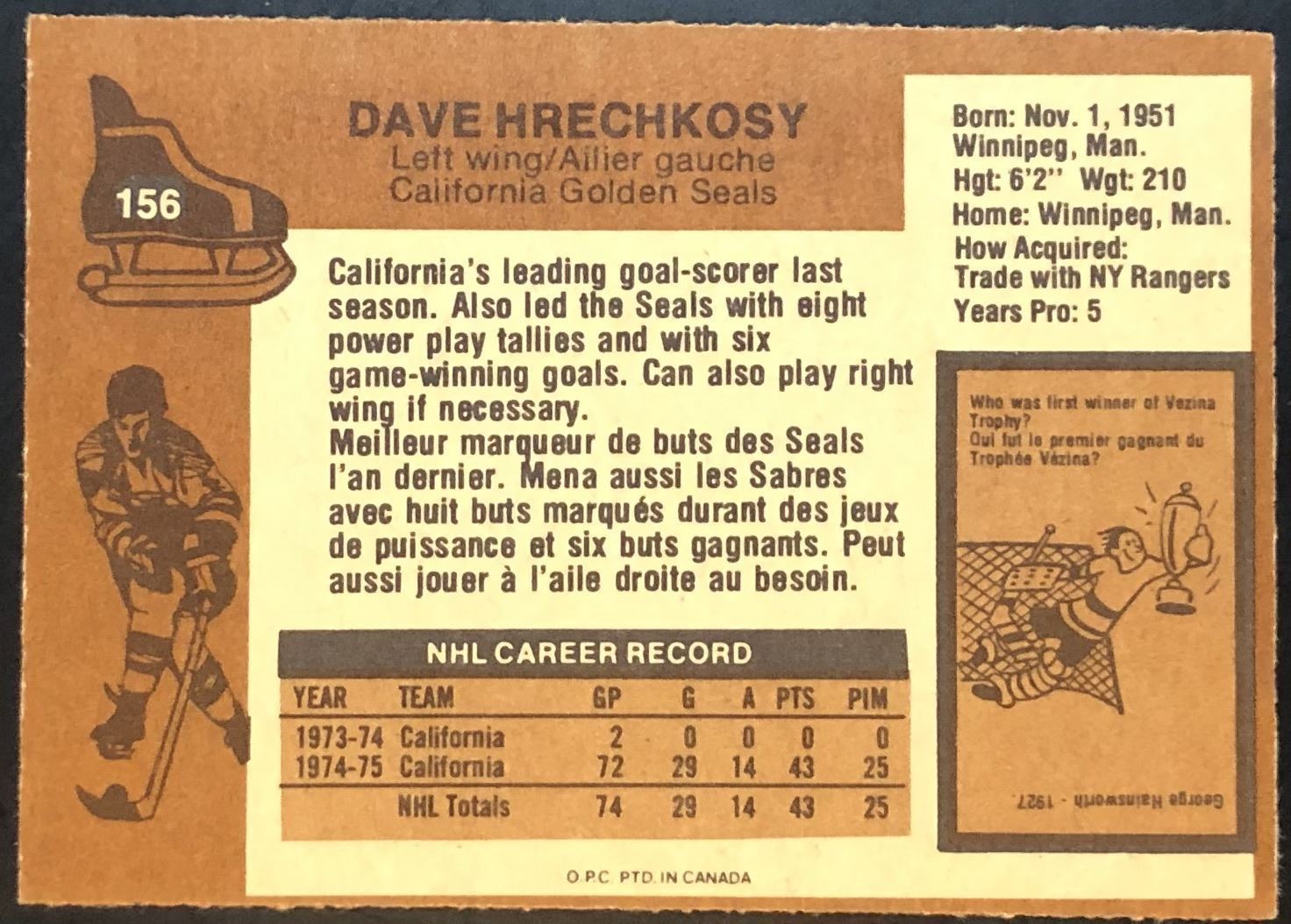 Lot 1048 1975-76 NHL O-PEE-CHEE DAVE HRECHKOSY ROOKIE CARD