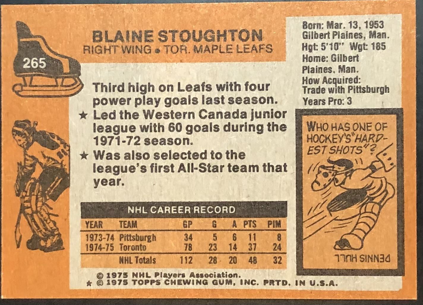 Lot 1052 1975-76 NHL TOPPS BLAINE STOUGHTON ROOKIE CARD