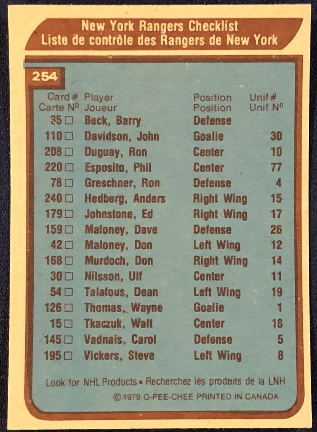 Lot 1183 1979-80 O-PEE-CHEE NEW YORK RANGERS