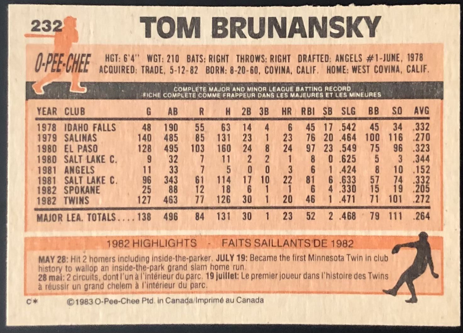 Lot 1341 1983 O-PEE-CHEE TOM BRUNANSKY - SIGNED