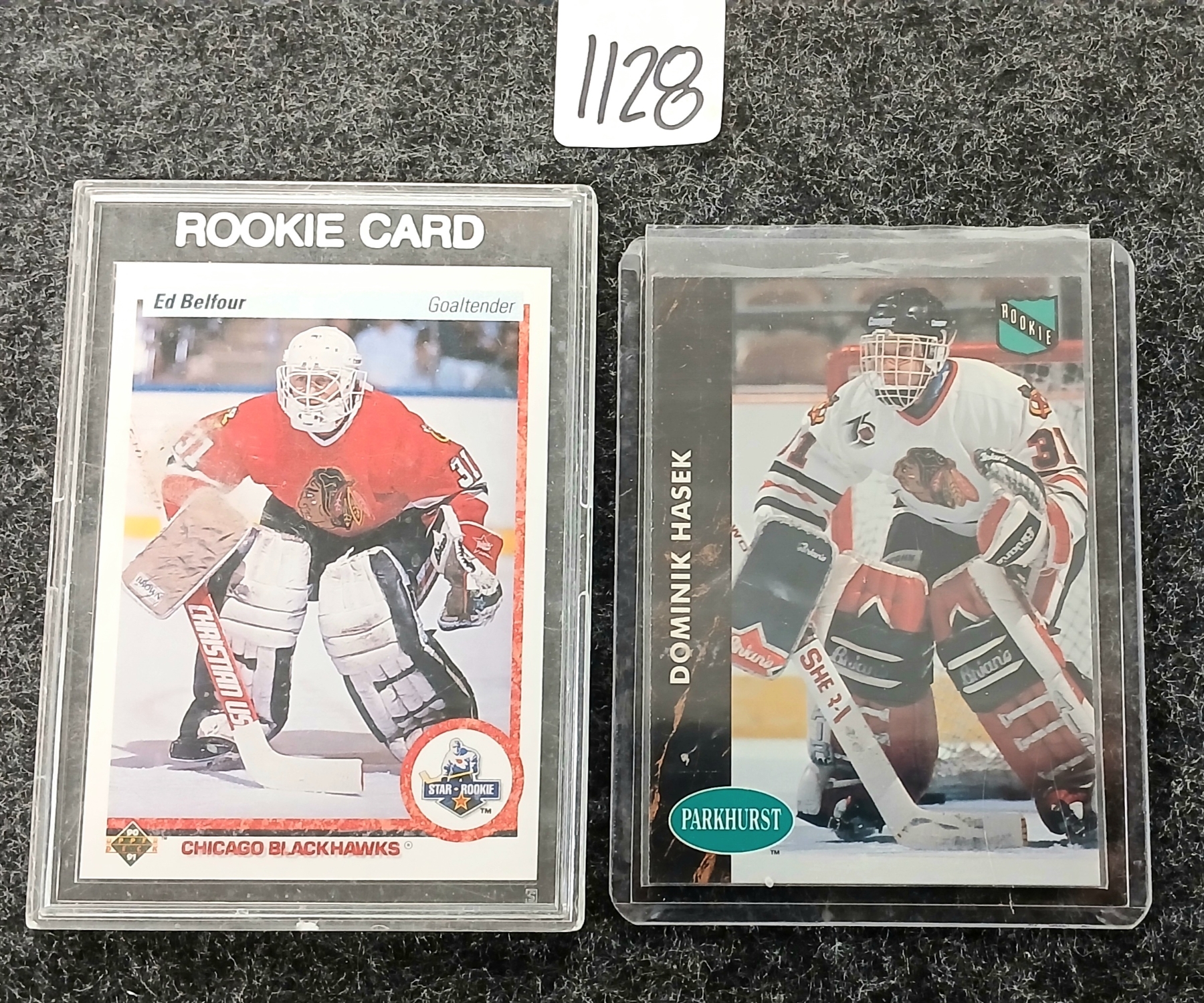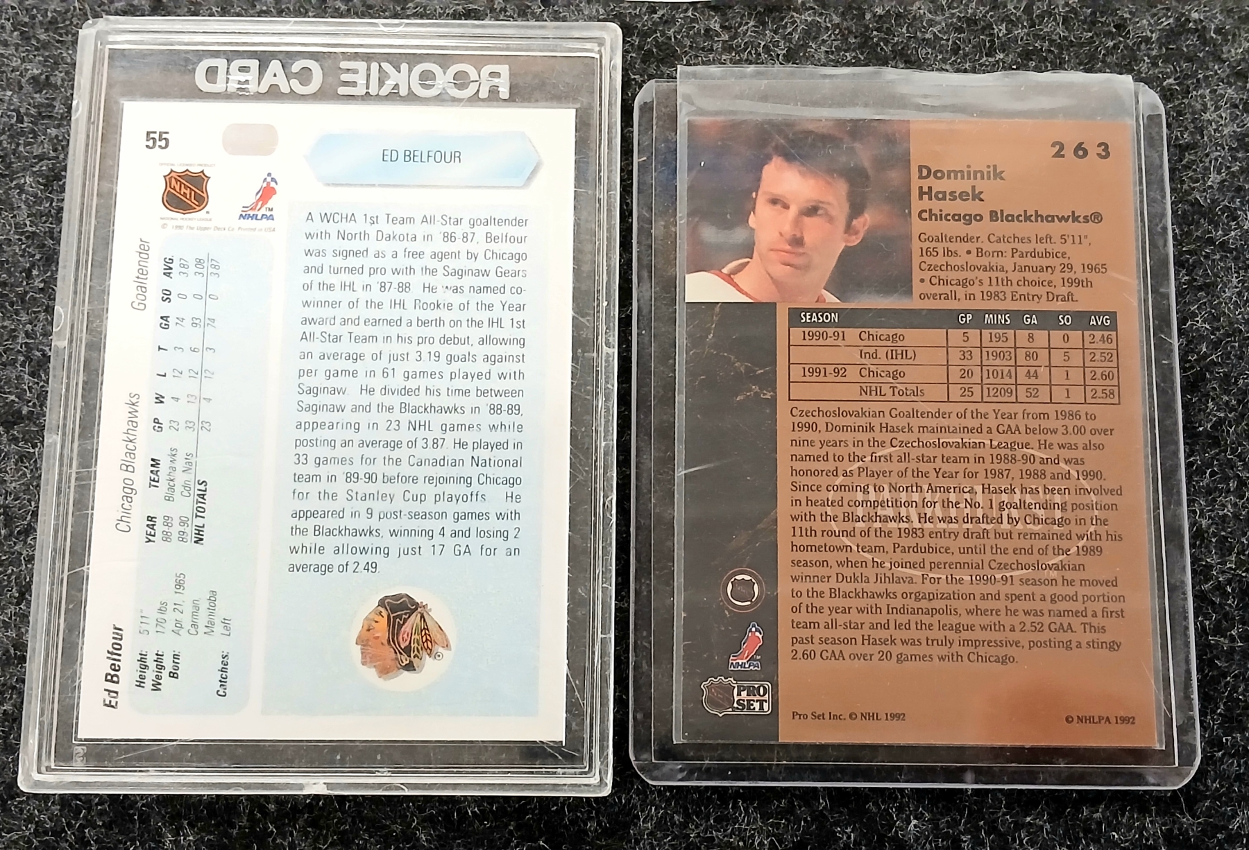 Lot 1128 LOT OF 2 - 1989/90 #55 ED BELFOUR & 1991/92 #264 DOMINIK HASEK ROOKIE U.D & P.H. HOCKEY CARDS