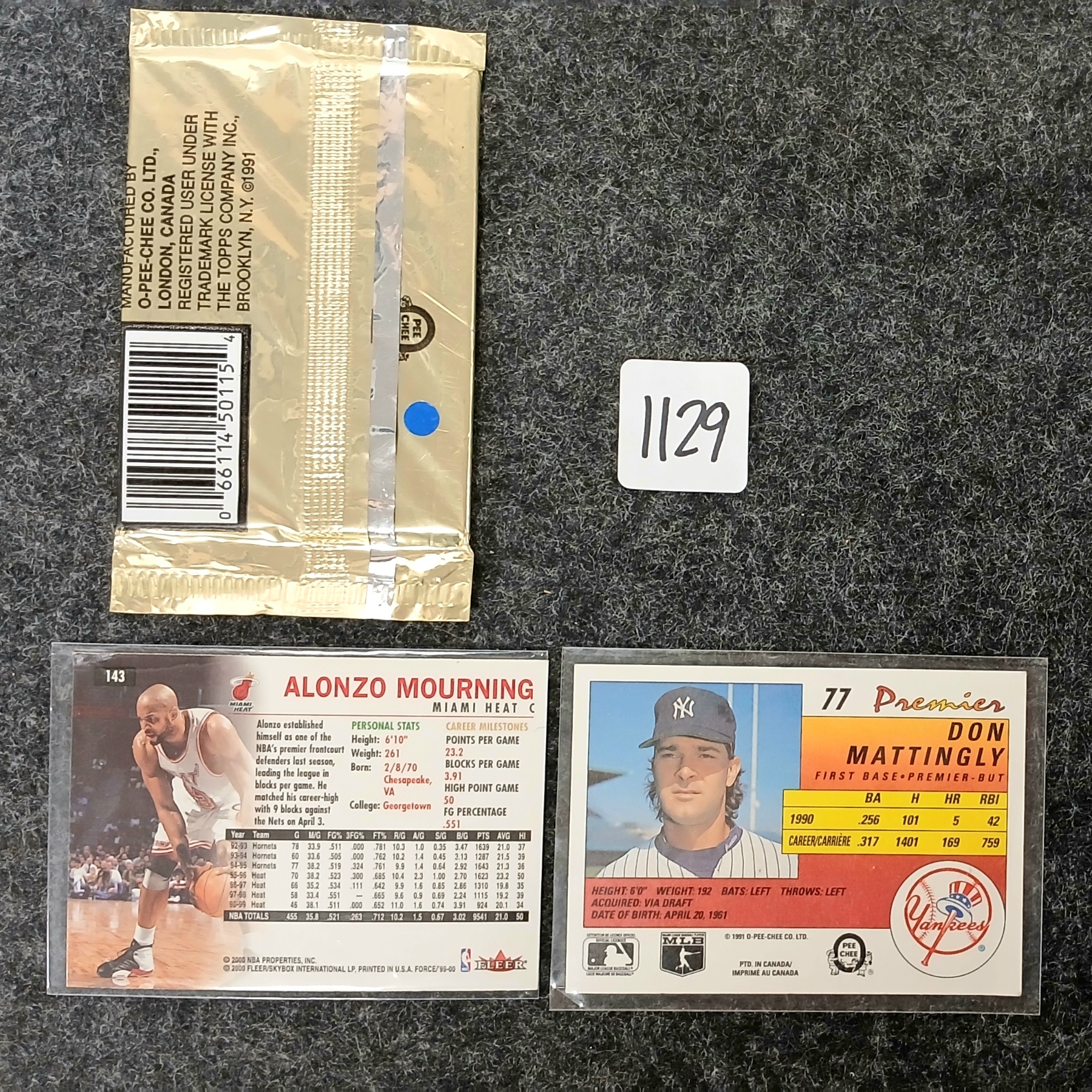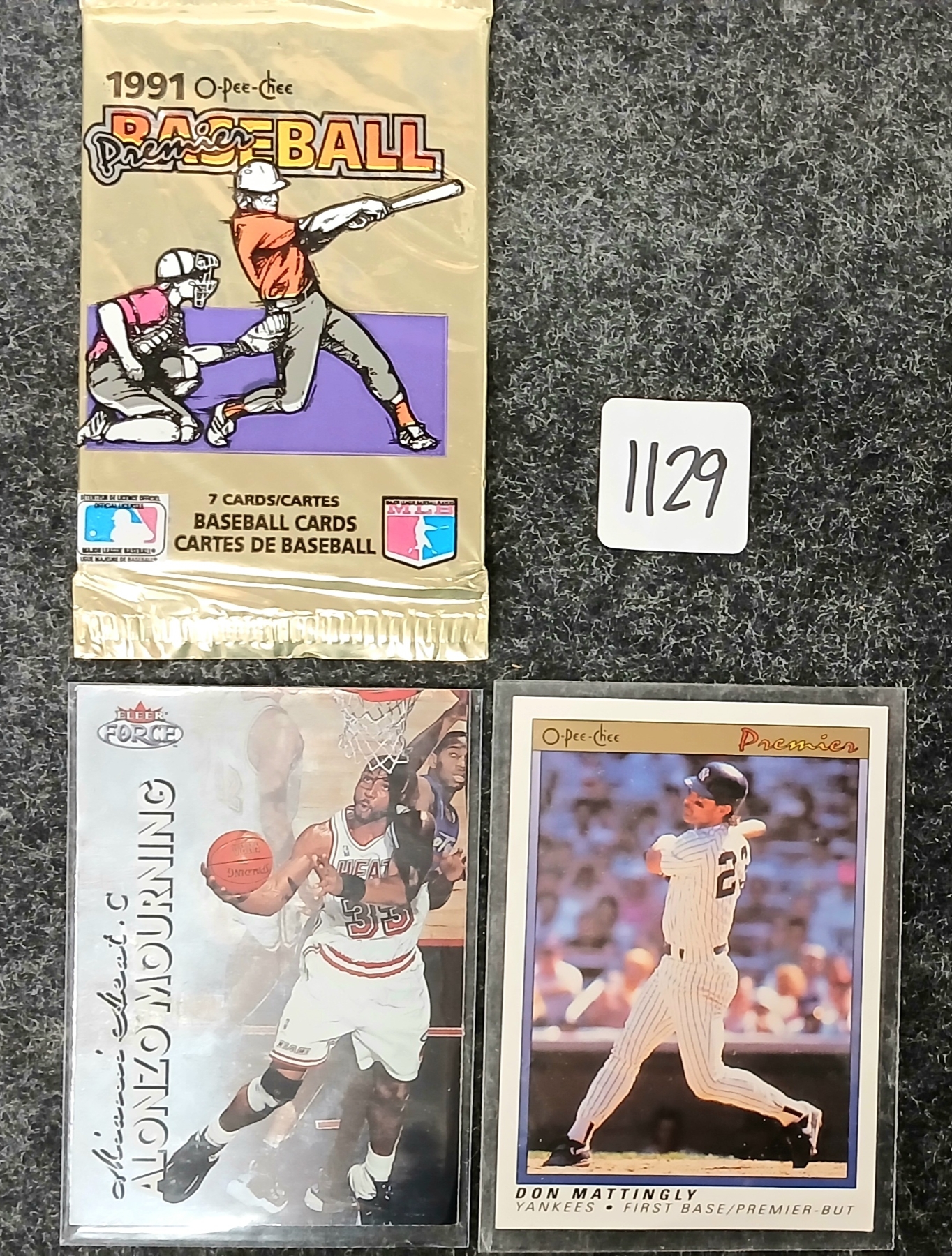Lot 1129 LOT OF 3 - 1991 PREMIER BASEBALL PACK, #77 MATTINGLY YANKEES PREMIER & #143 MOURNING BASKETBALL