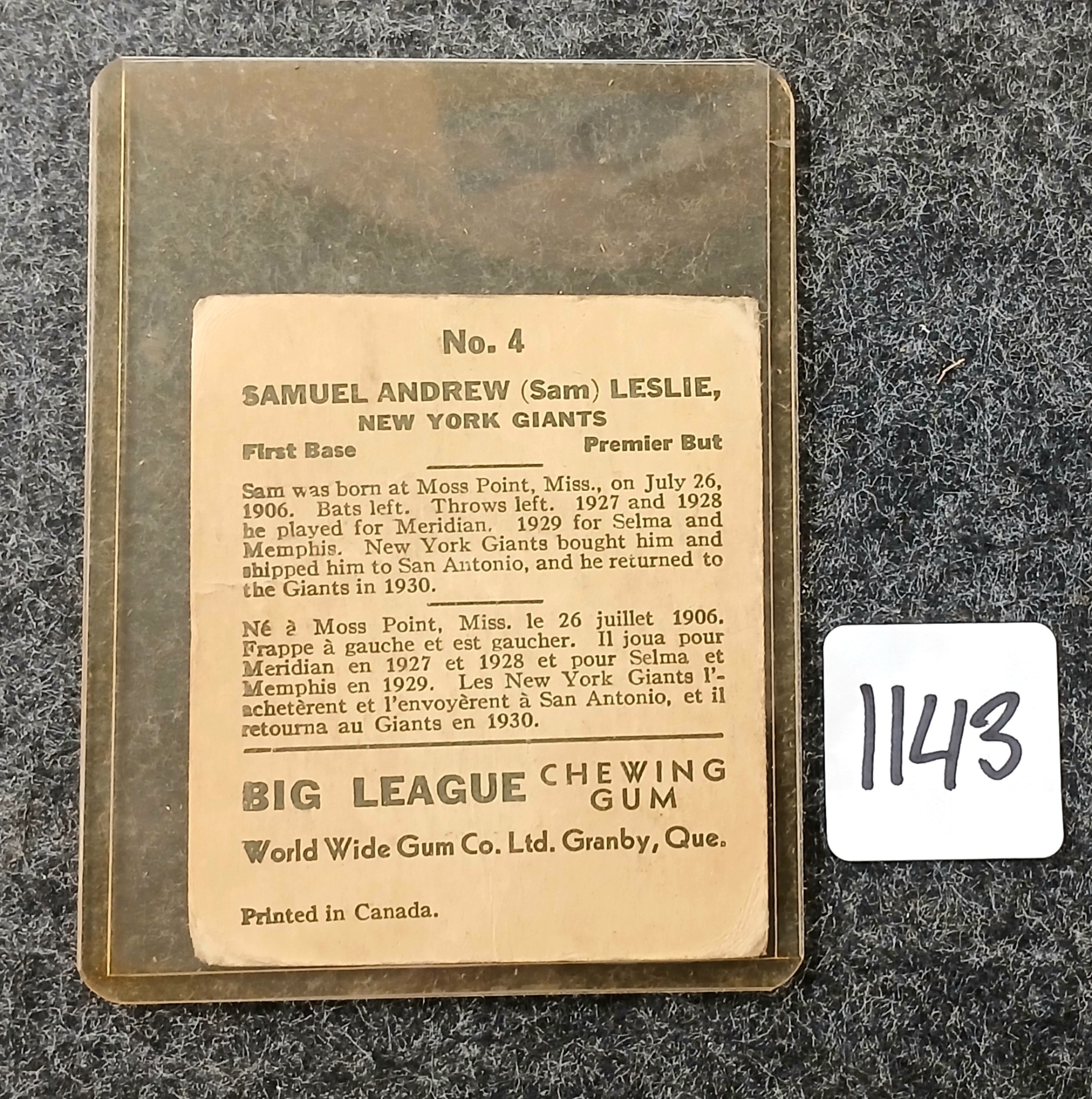 Lot 1143 1936 #4 SAM LESLIE NEW YORK GIANTS - BIG LEAGUE BASEBALL CHEWING GUM CARD
