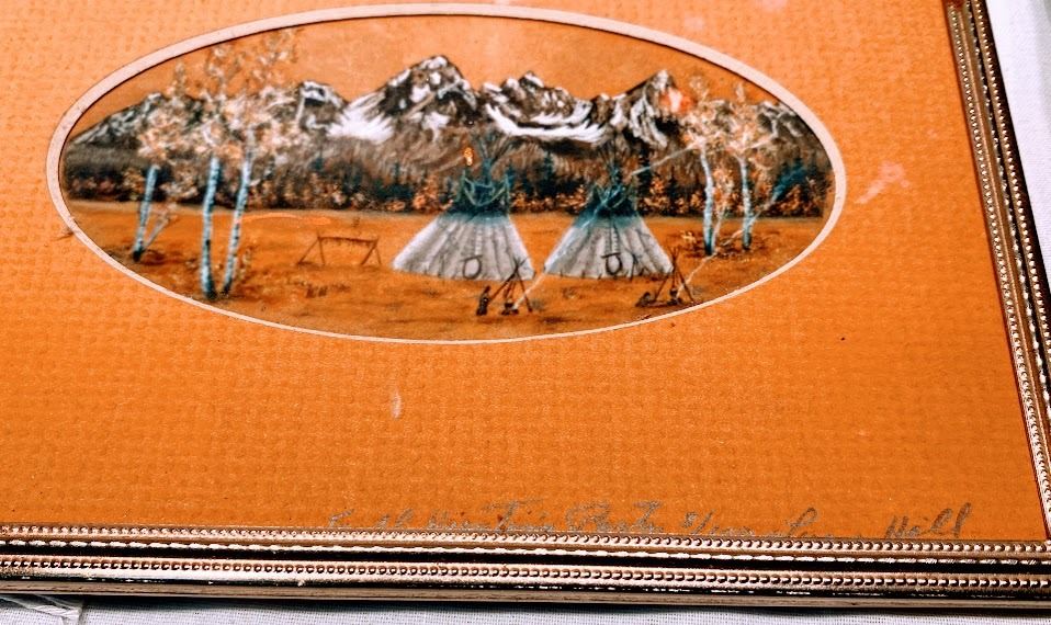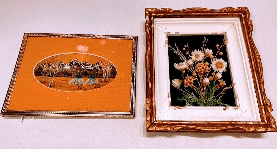 Lot 1042 2 Vintage Art Pieces - Native American Scene and Real Dried Flower Botanical Art
