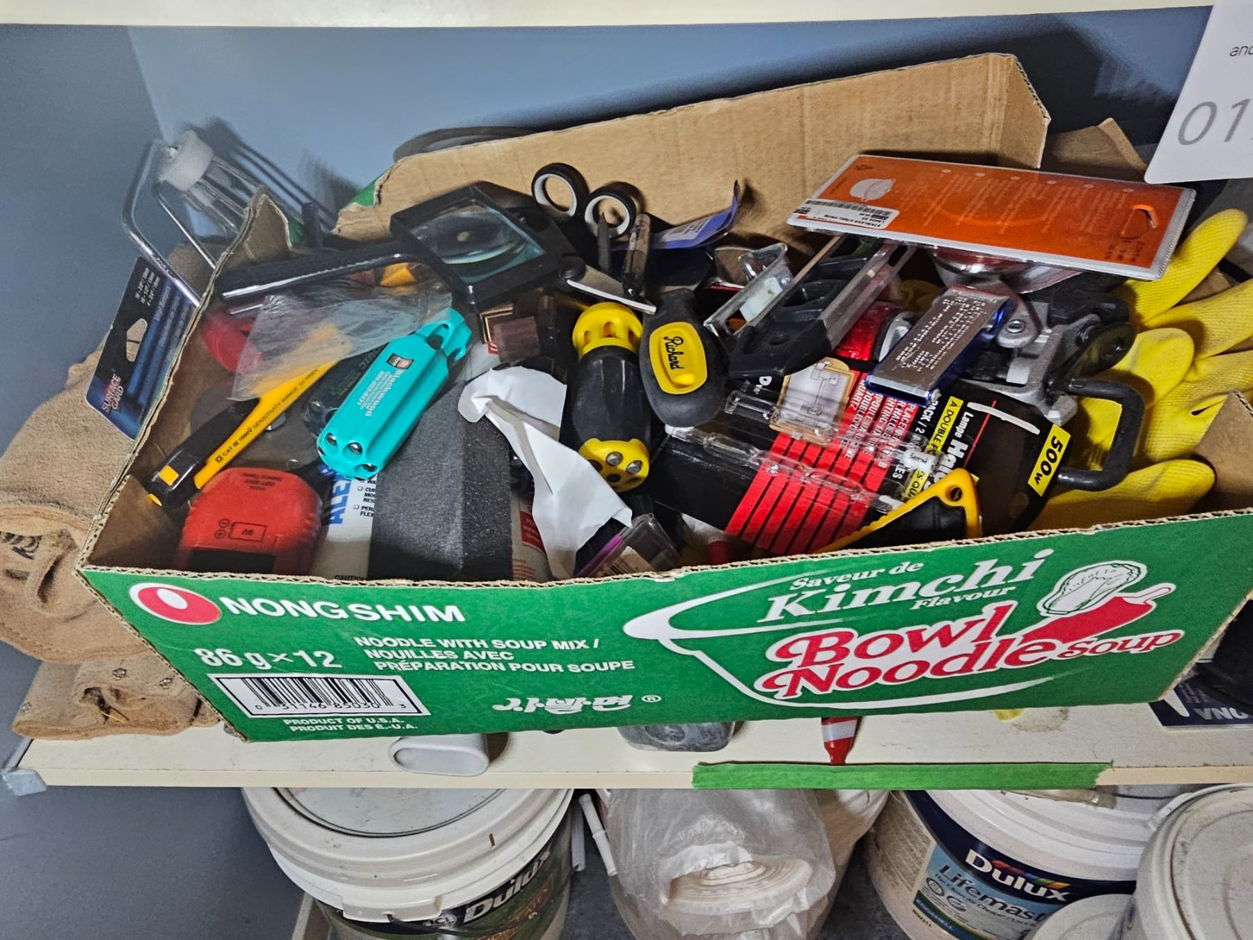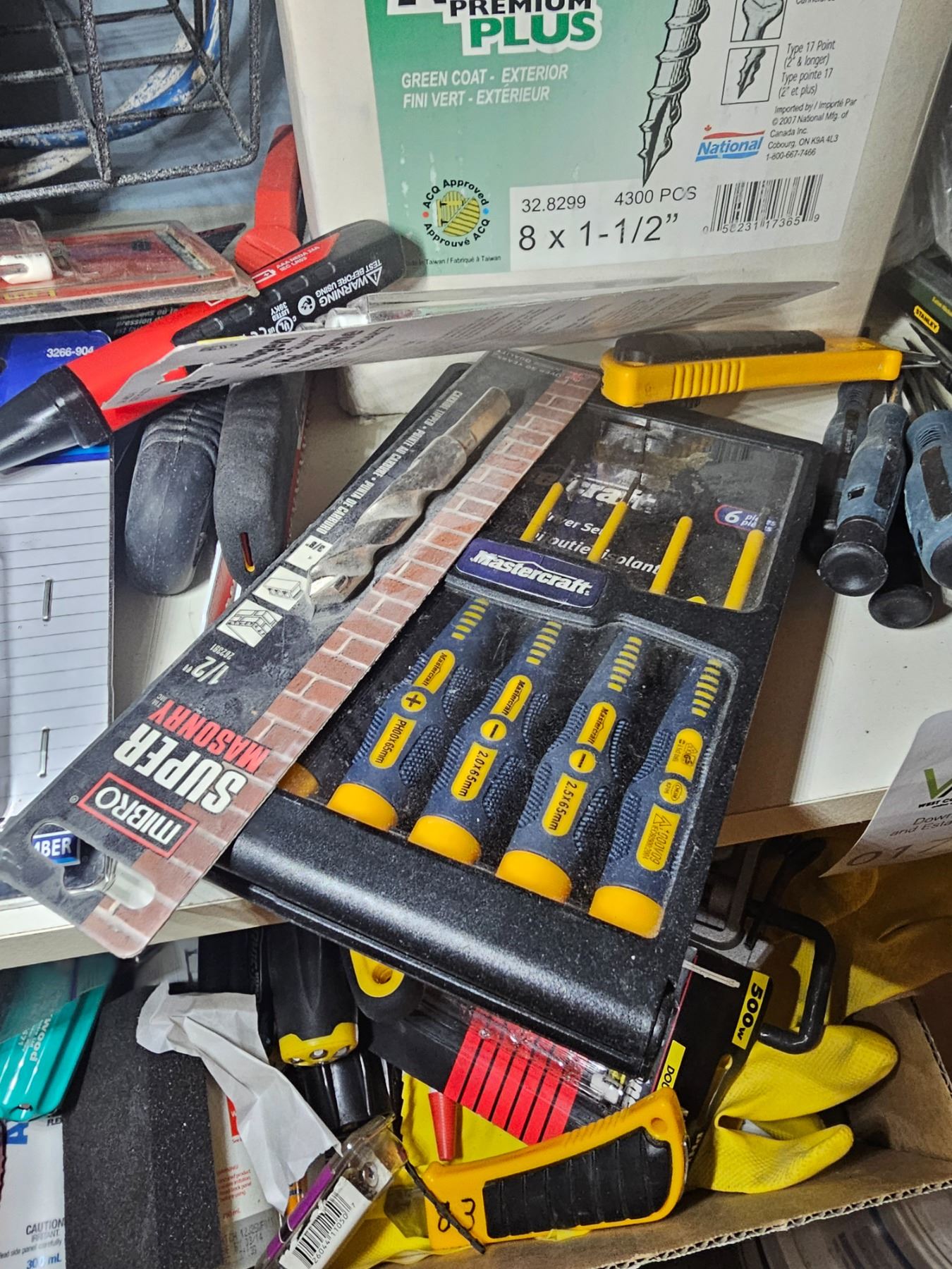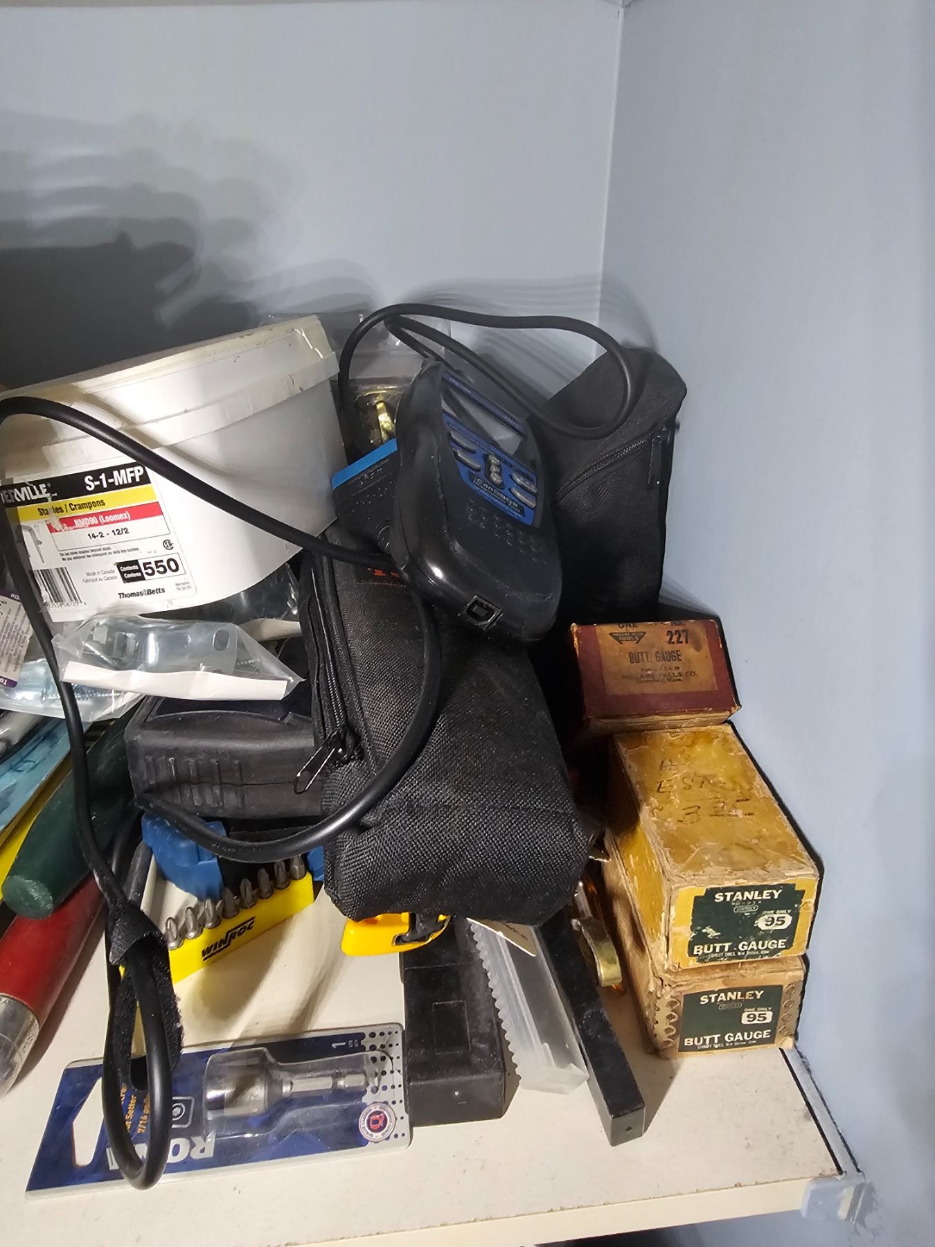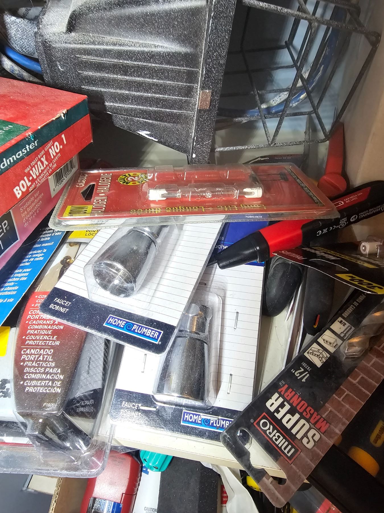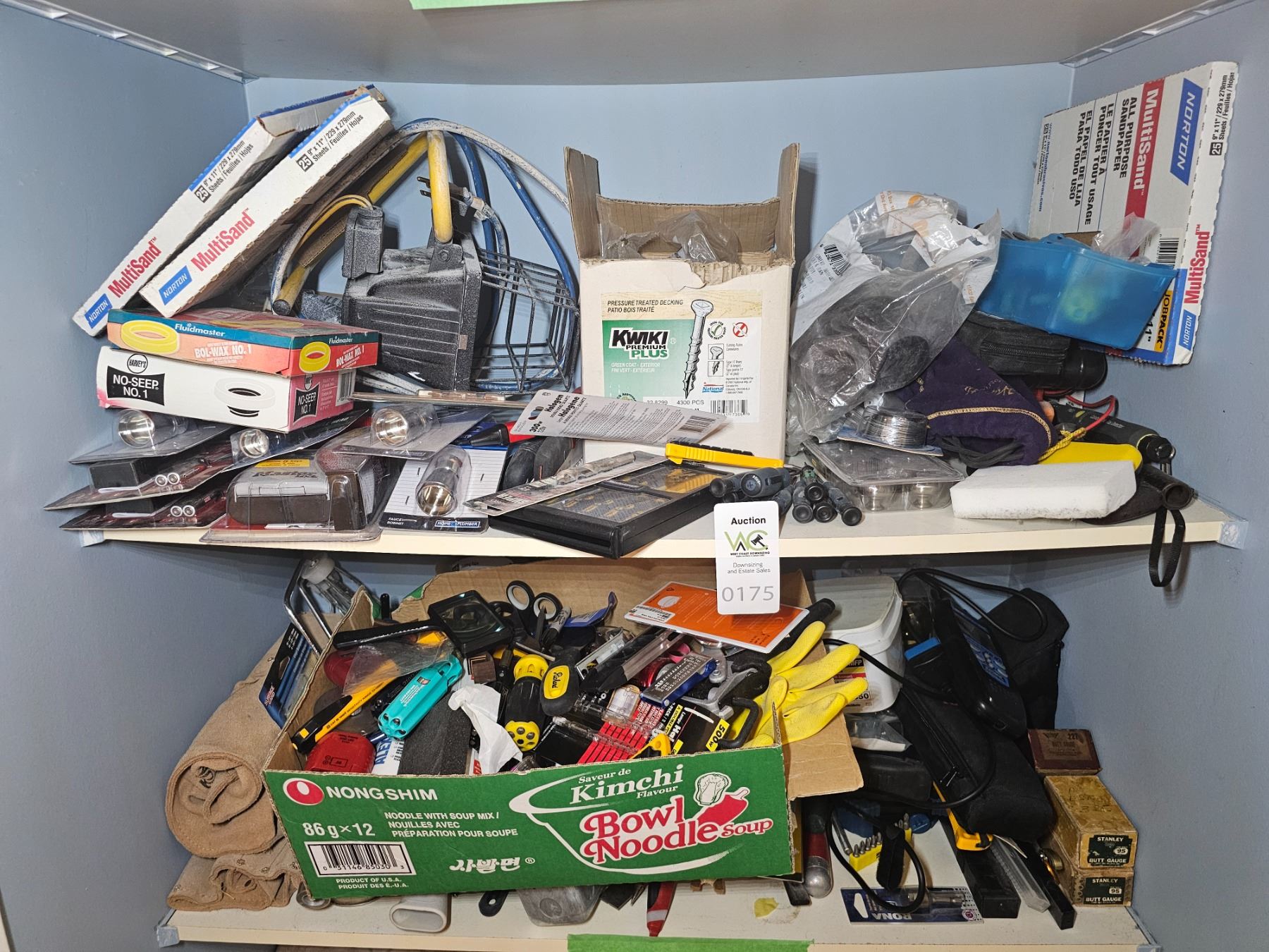 2 shelves of harsware, sand paper, work lite, Mibro super masonary tools, plumbing supplies, volt meter and more. Pickup at 9 am