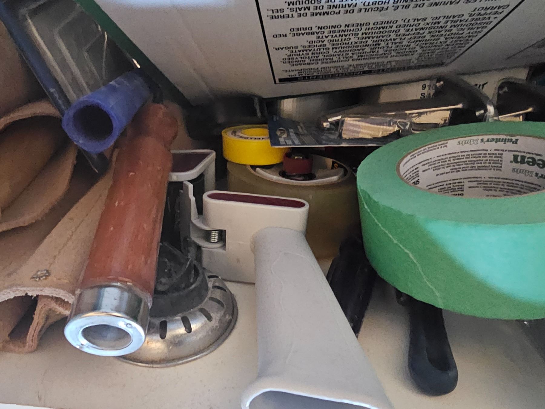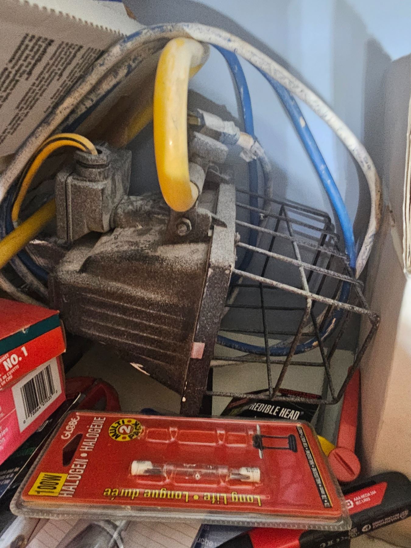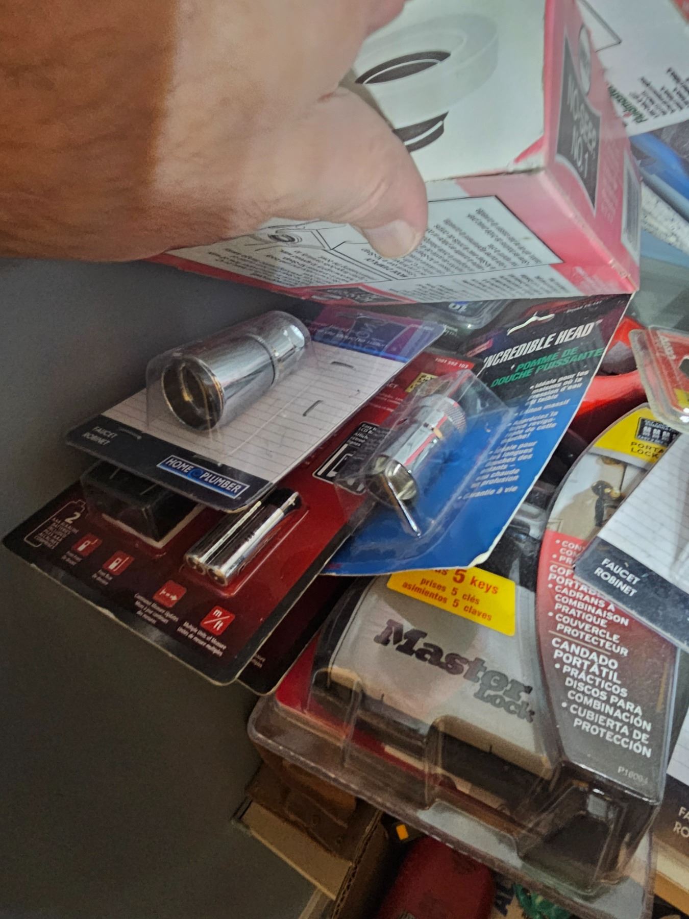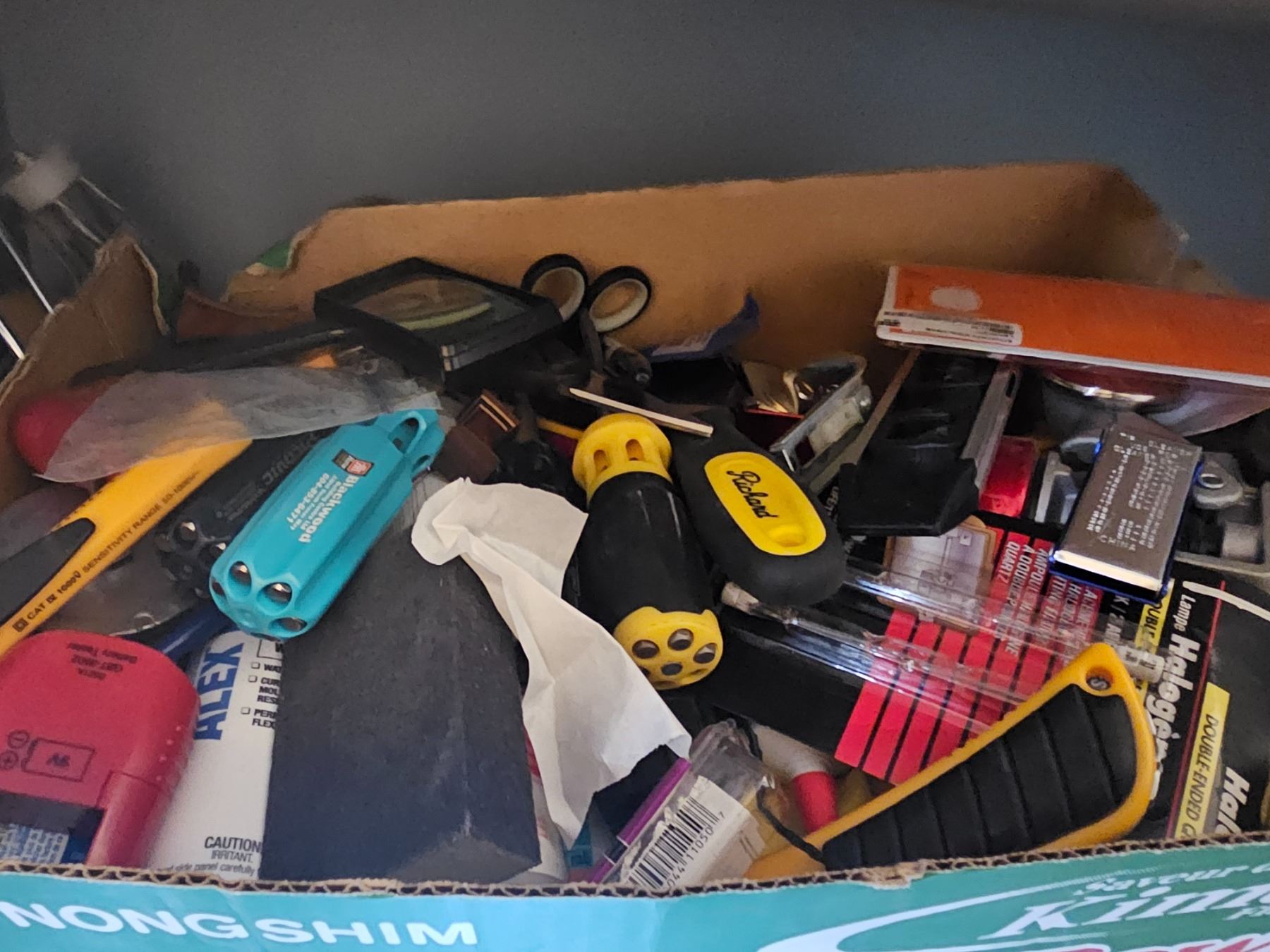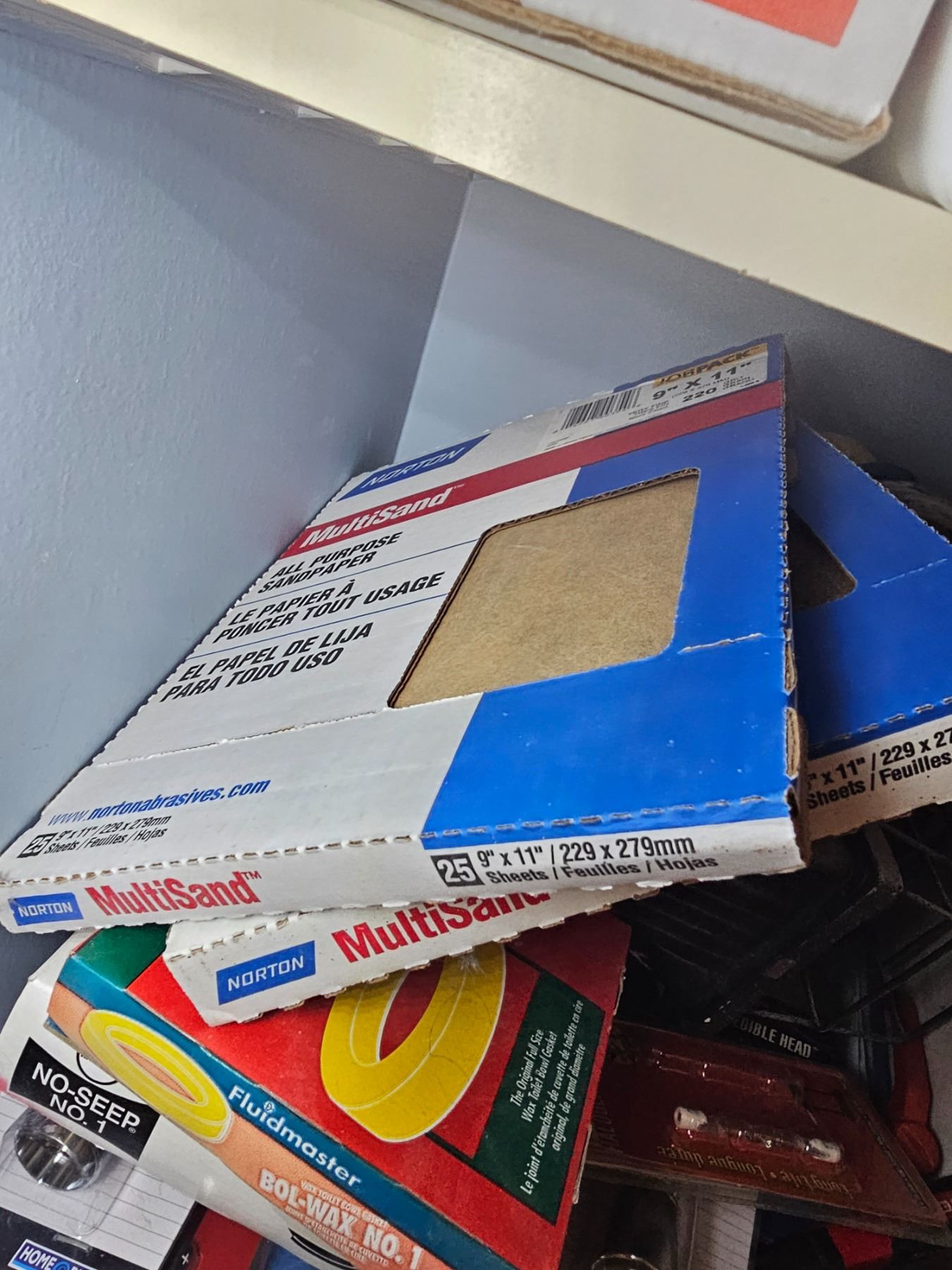 2 shelves of harsware, sand paper, work lite, Mibro super masonary tools, plumbing supplies, volt meter and more. Pickup at 9 am