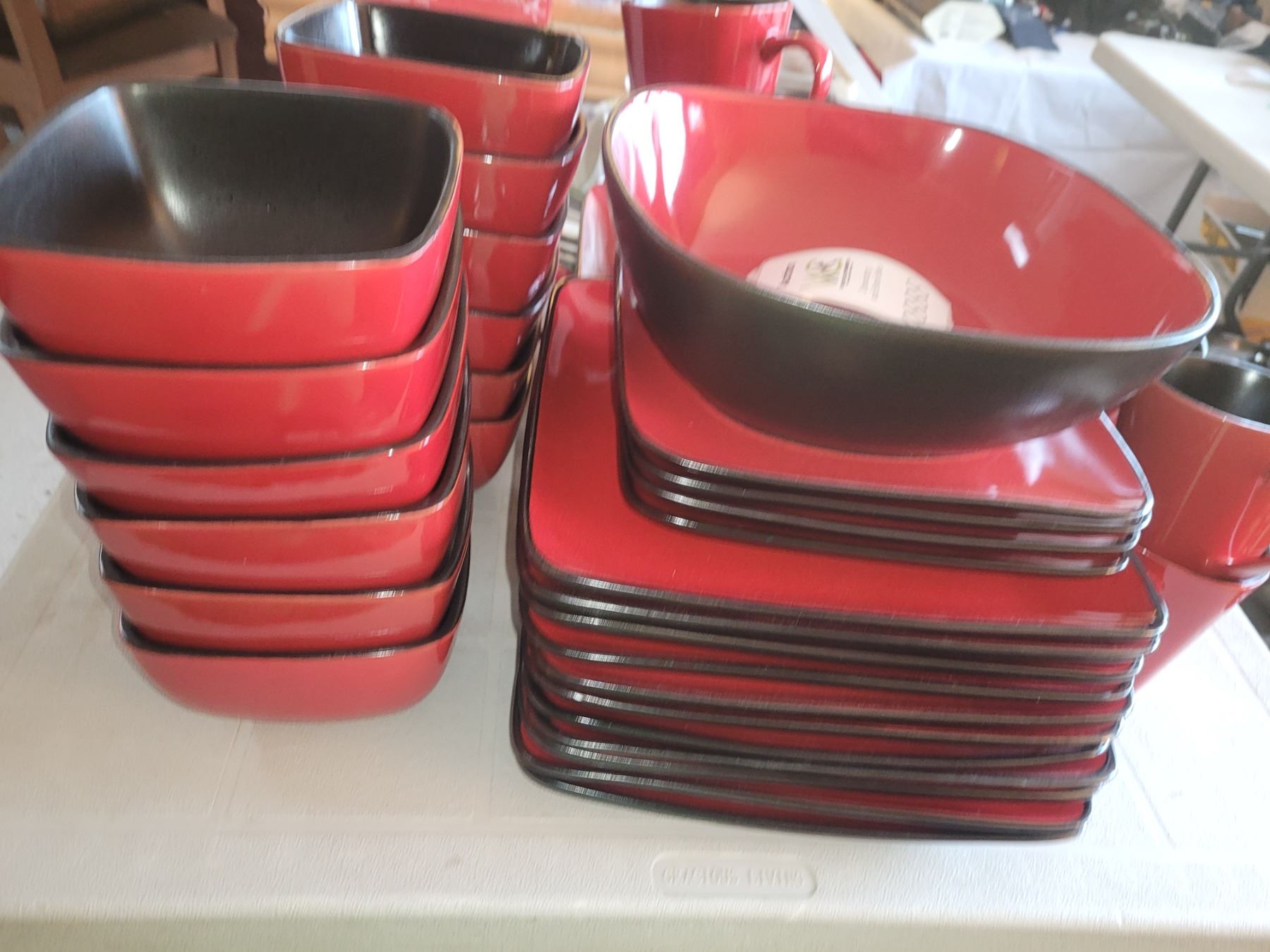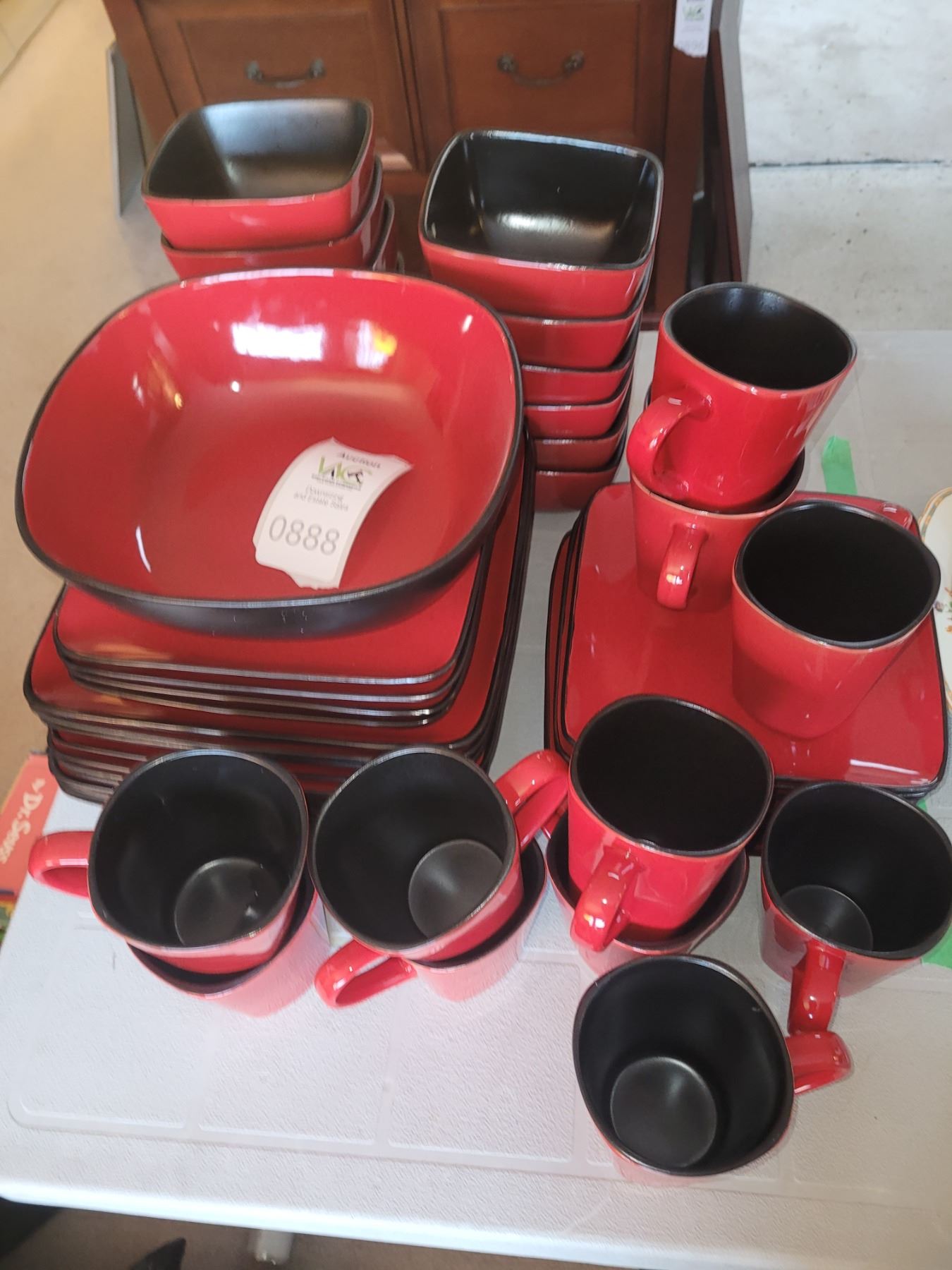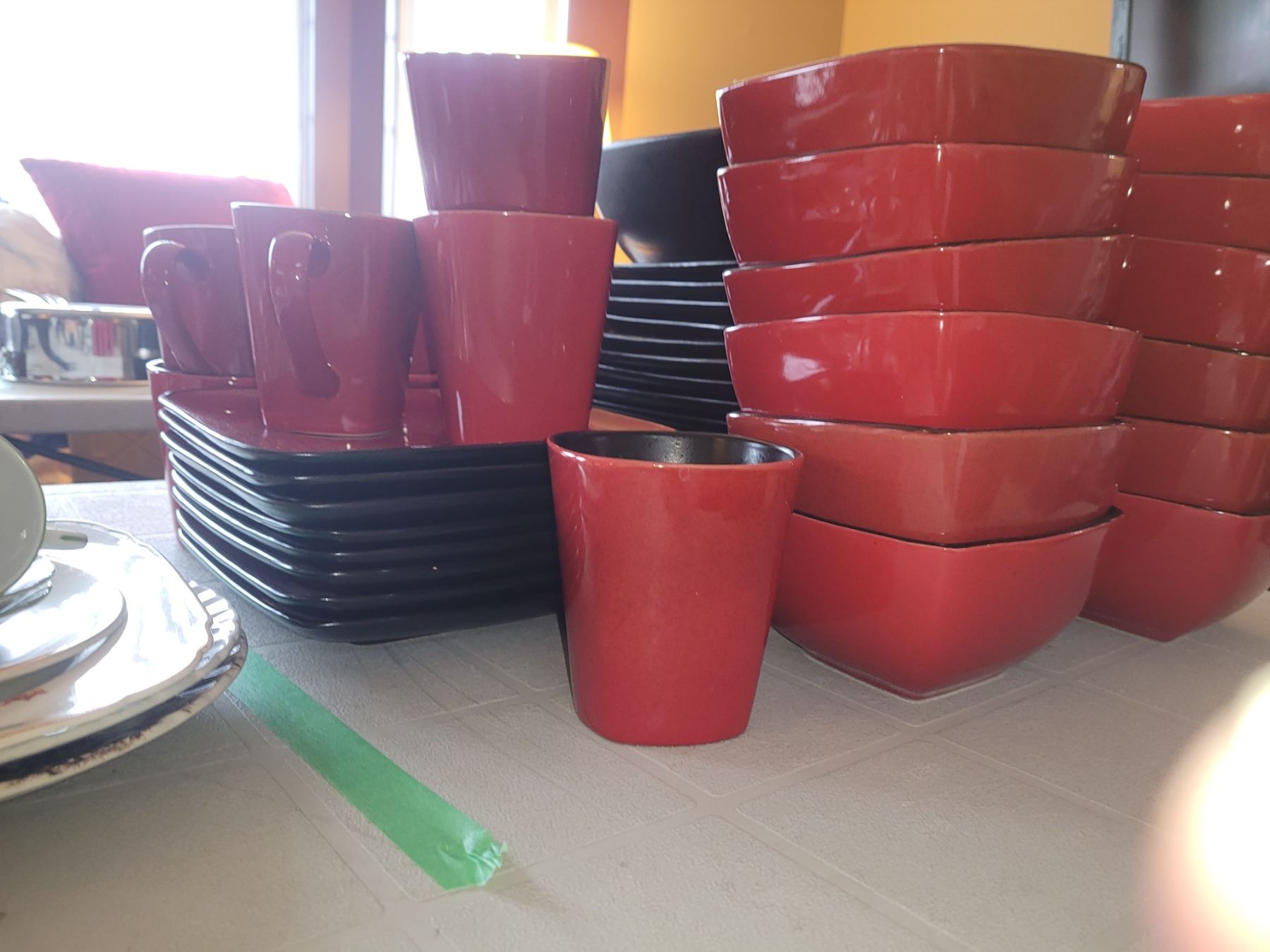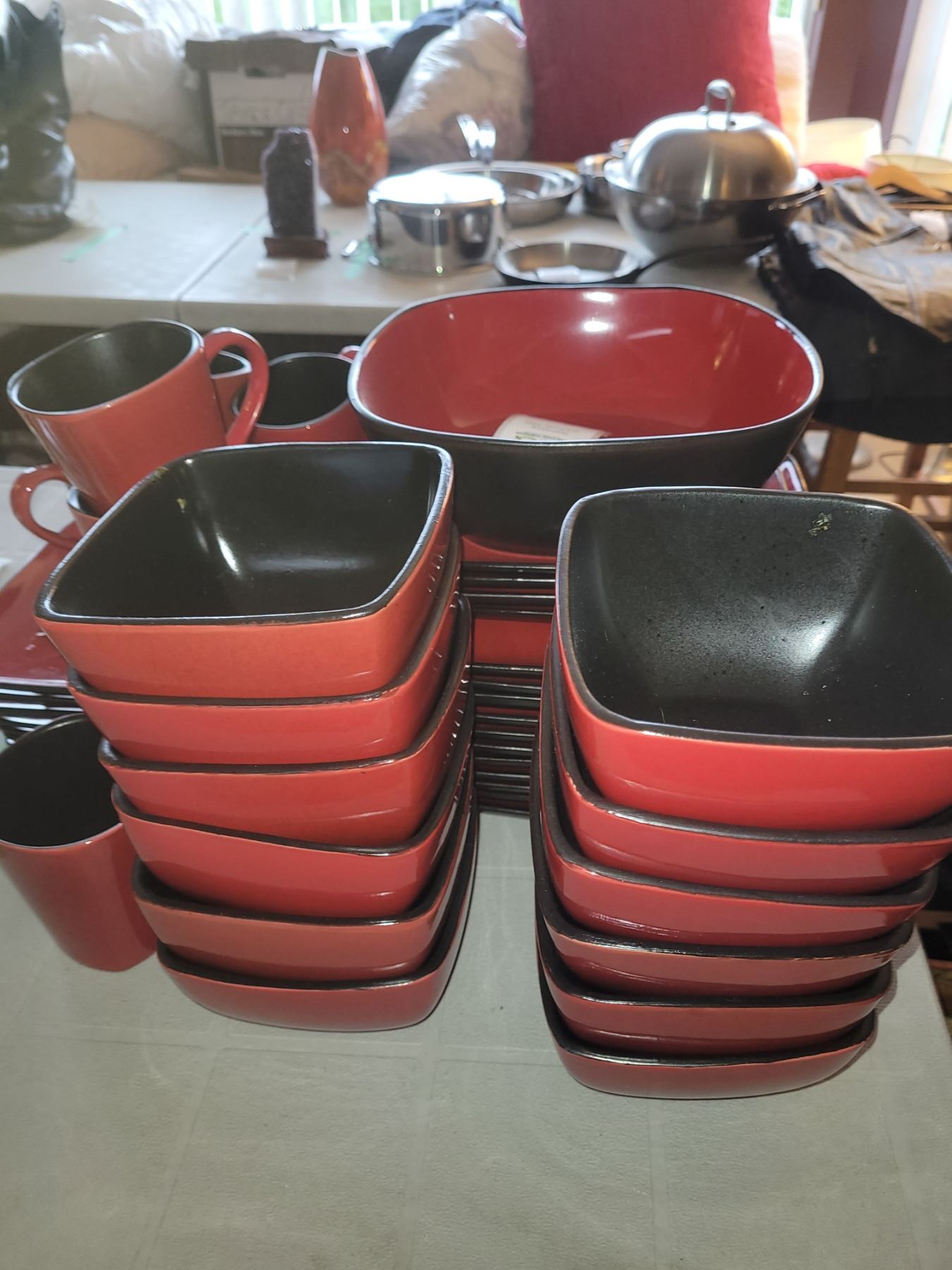 Black and red, 11 dinner plates, 12 mugs, 12 bowls, 12 salad, 1 large bowl. Pick up 9-10. Bring packing material.