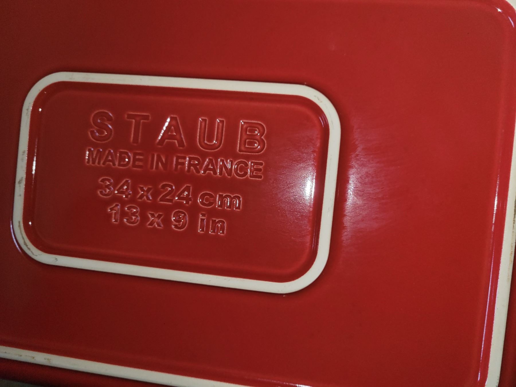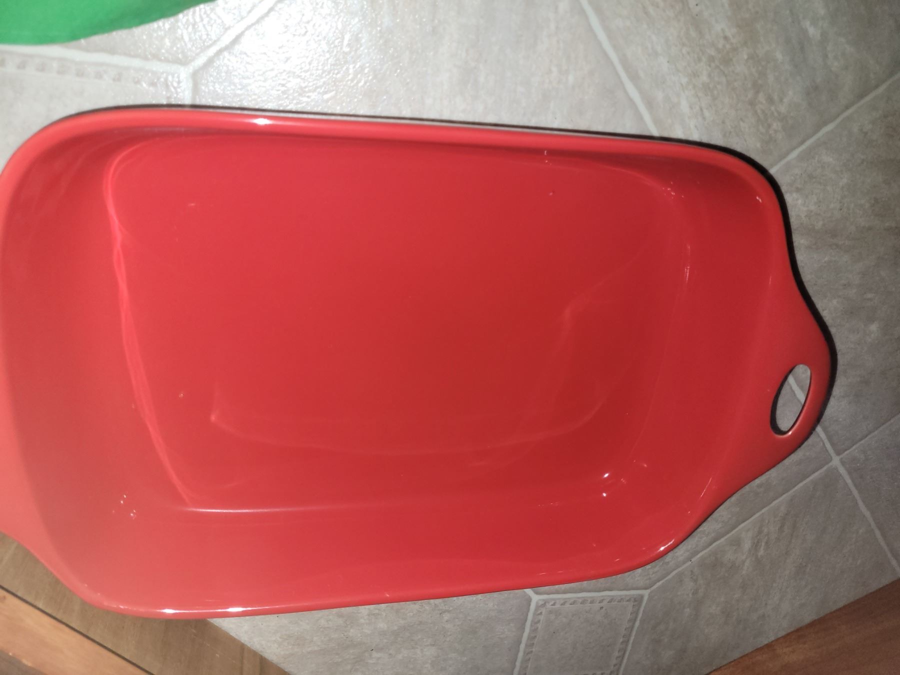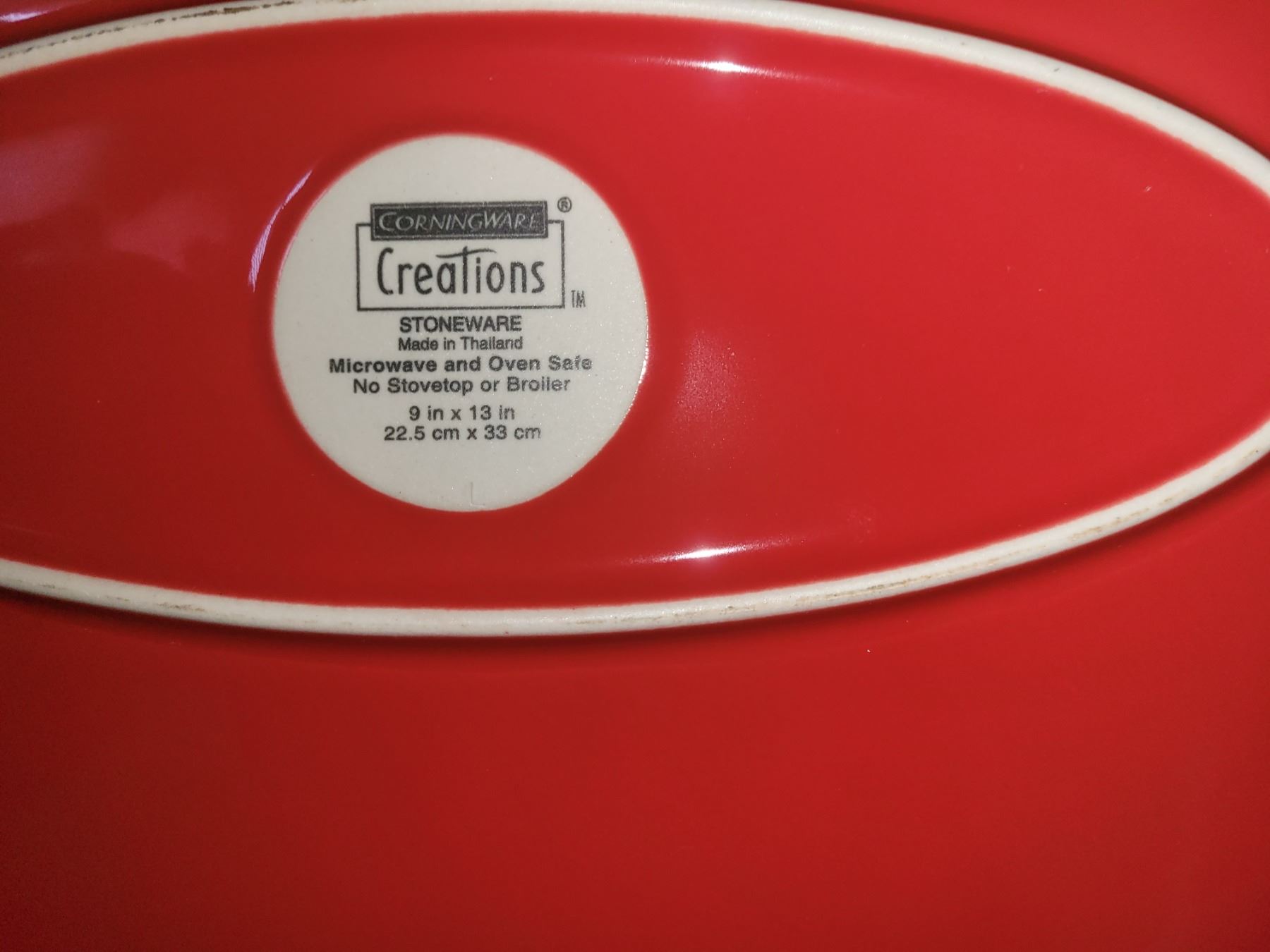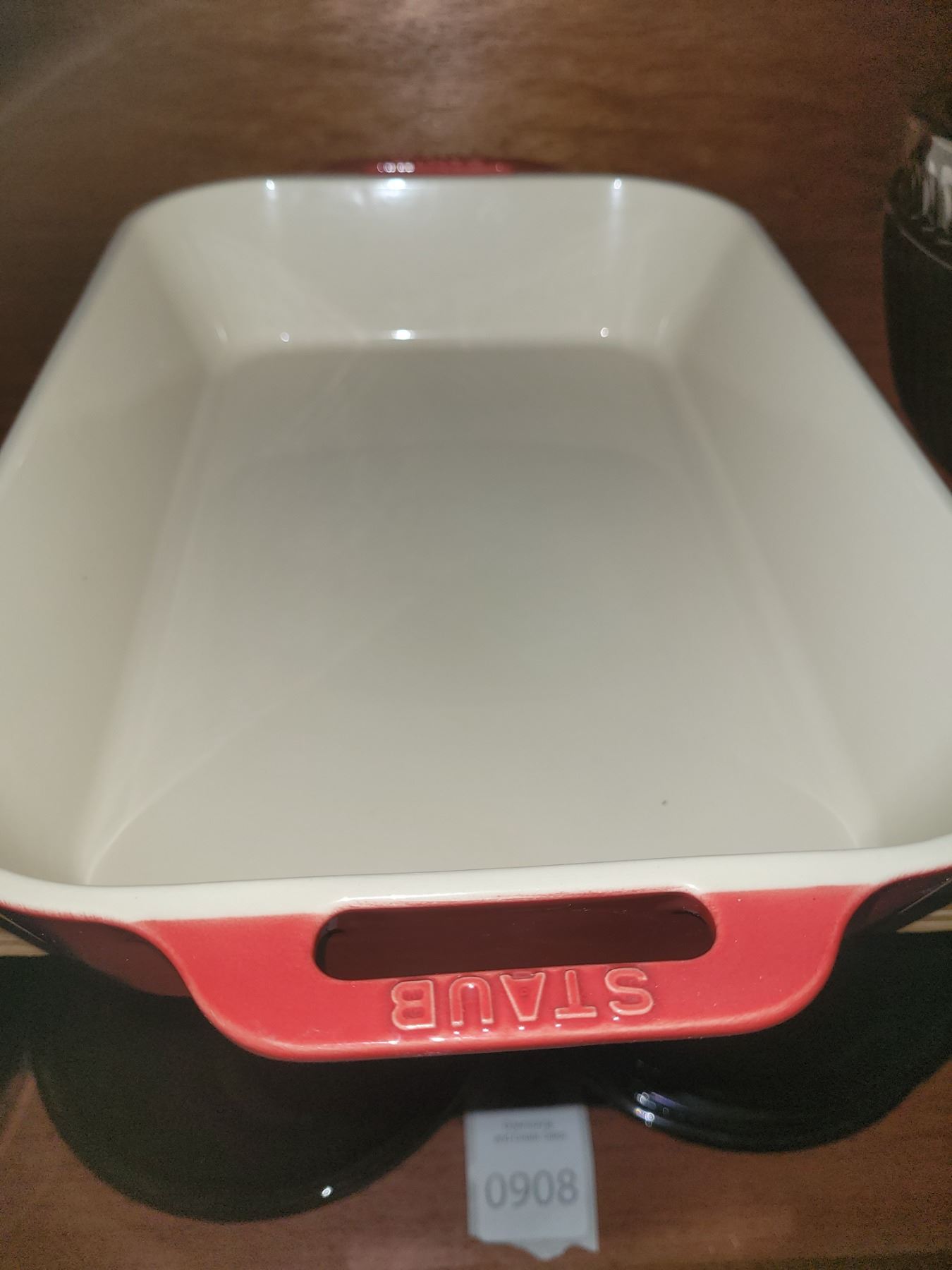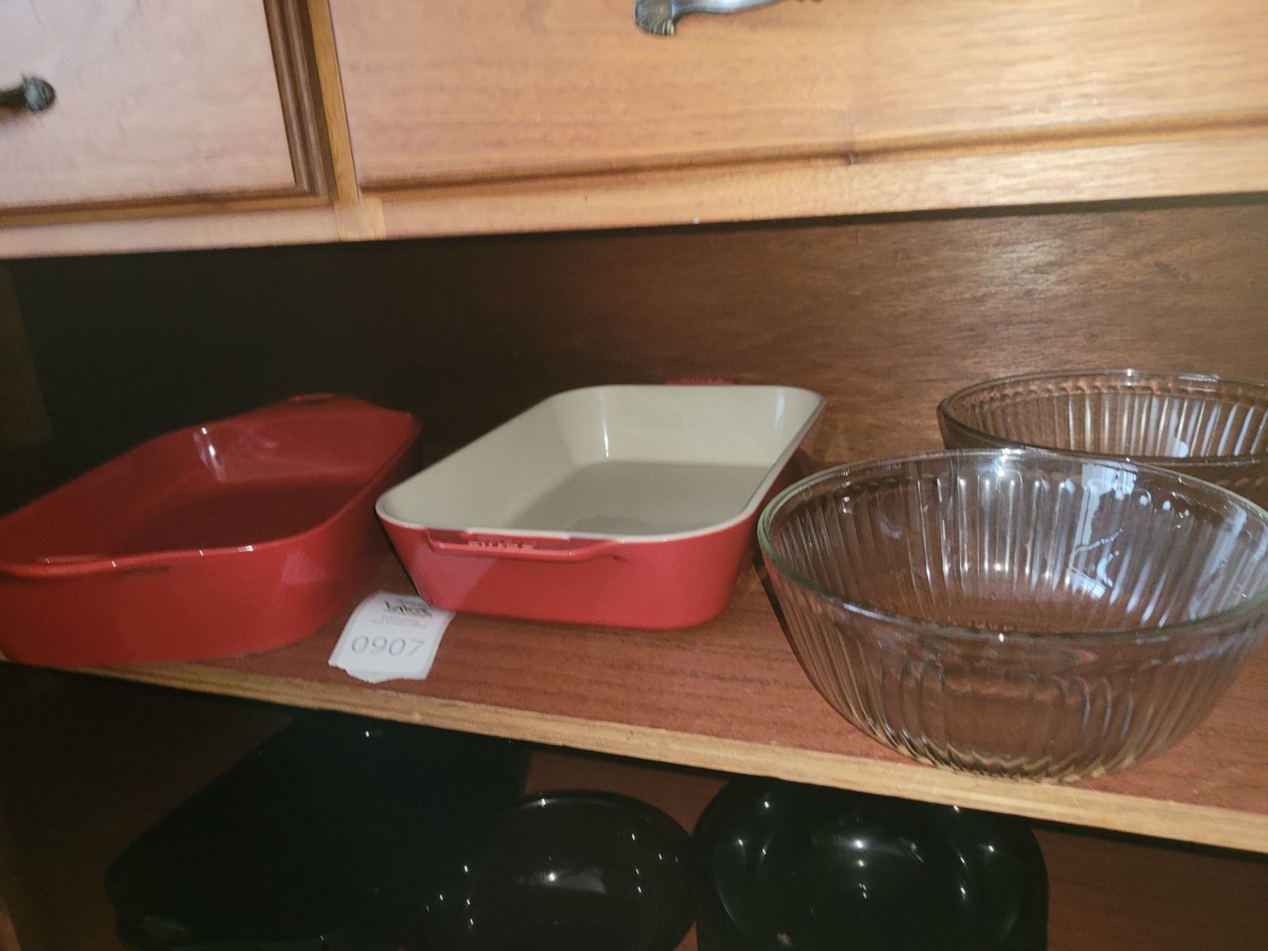 Staub red casserole, red Corning ware casserole, Pyrex serving bowls. Pick up 9-10