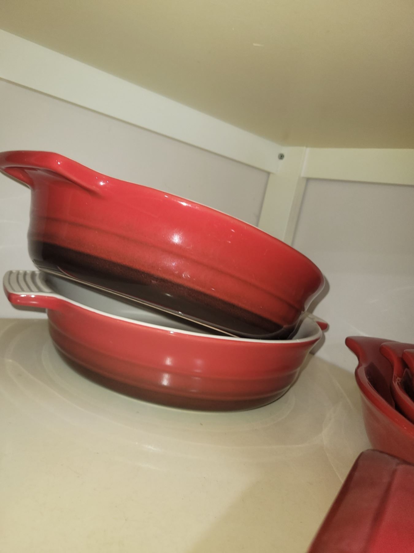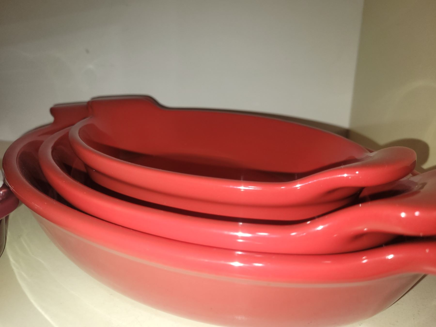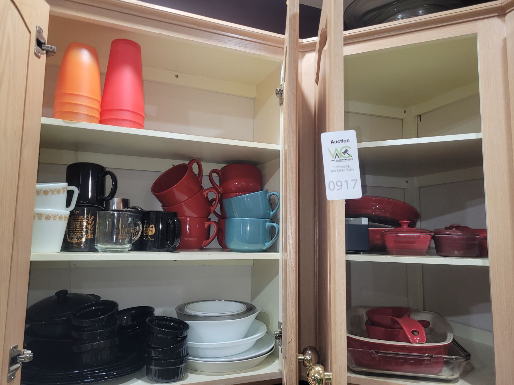 Collection of soup and drinking mugs, 6 black Corelle made in France, plates, 4 fruit dishes. Includes red casseroles, a Spiromatic. Pick up 9-10