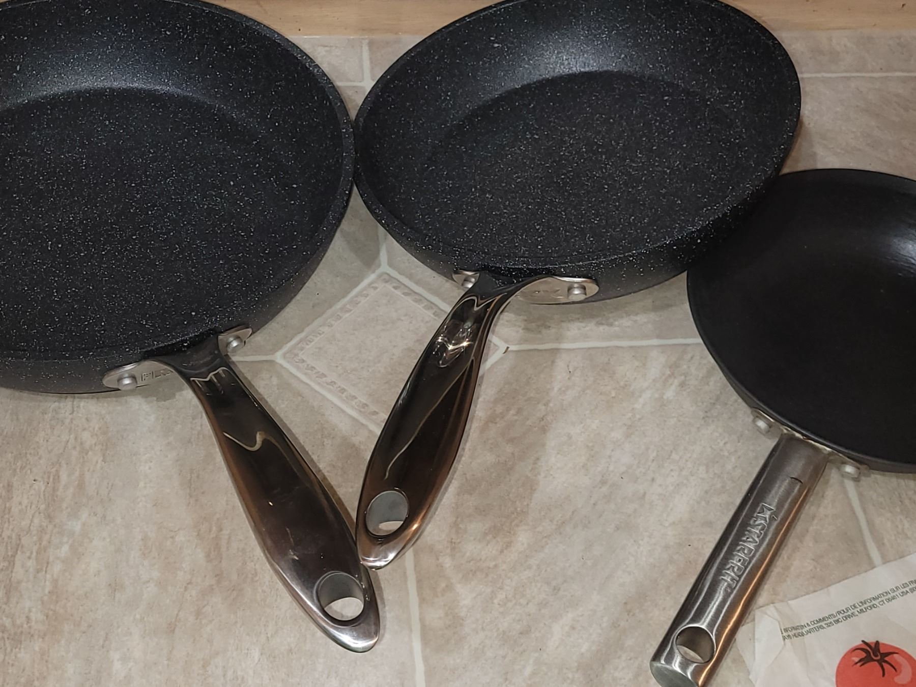 Set of stainless steel pots. The Rock fry pan and Starfrit fry pans. Wok. Pickup at 9 am