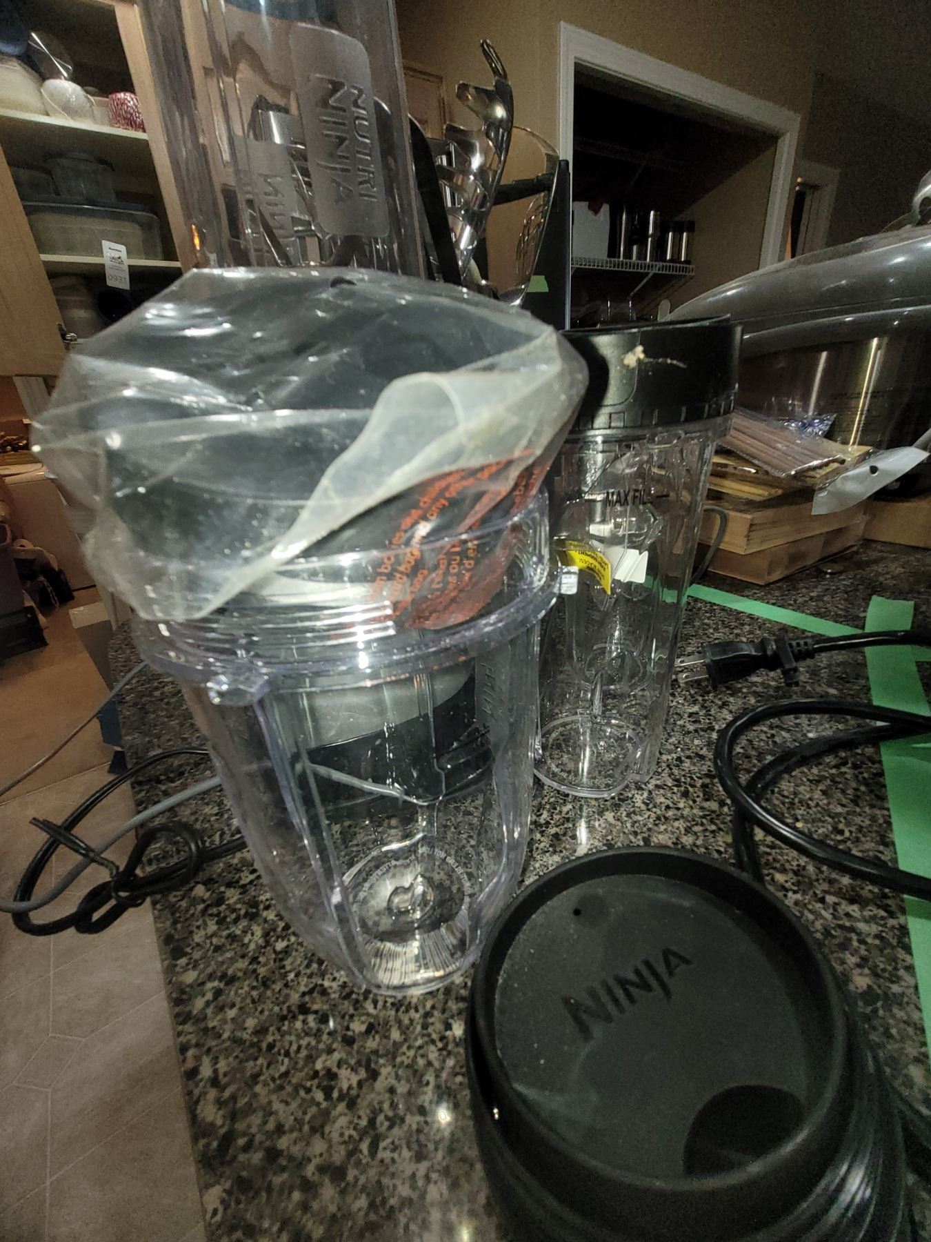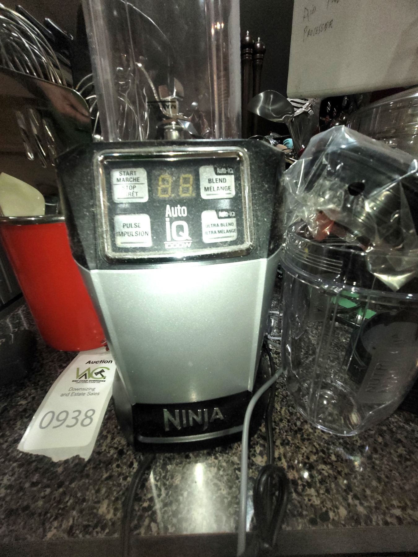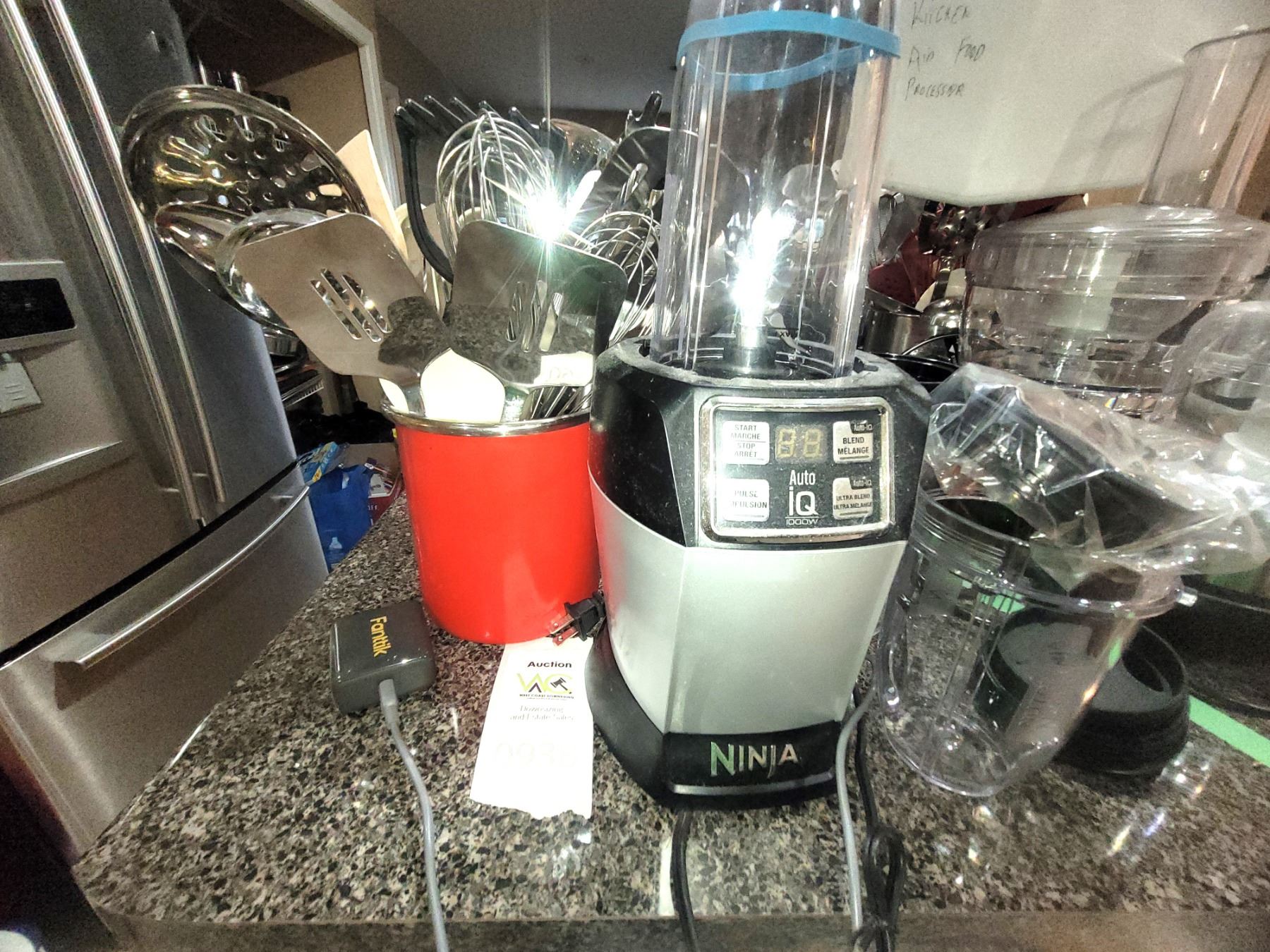 Ninja ultra blend with cups, red metal pot with kitchen utensils. Pickup at 9 am