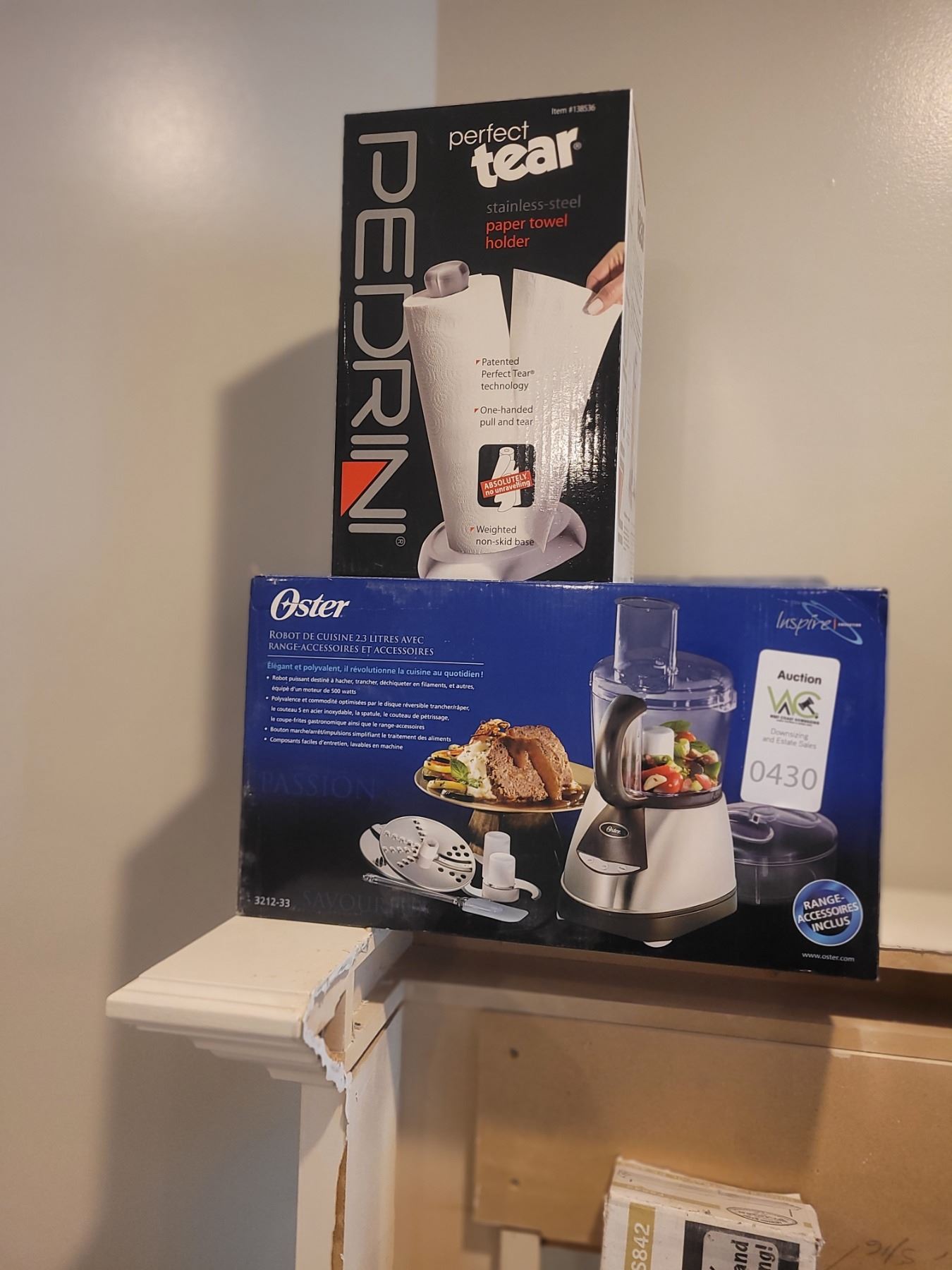 Pedrini paper towel holder,new. Oster food processor new. Pickup at 12 pm