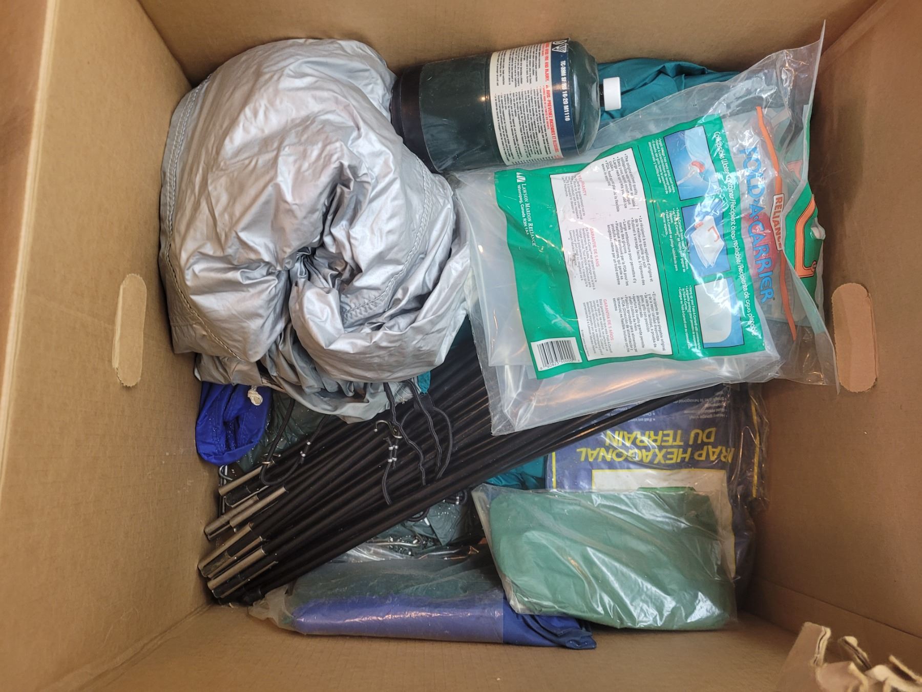 Igloo rolling cooler. Collapsible water container. Camping stove. Tent, tarp and pegs.condition unknown. Pickup at 11 am