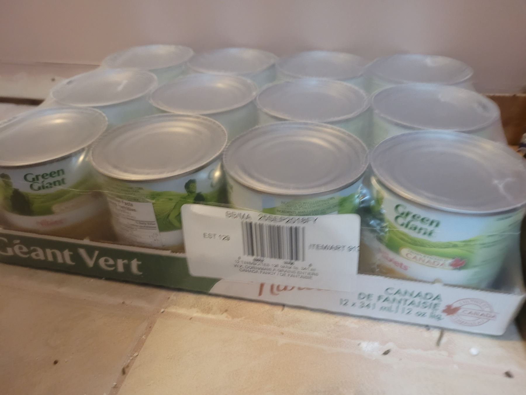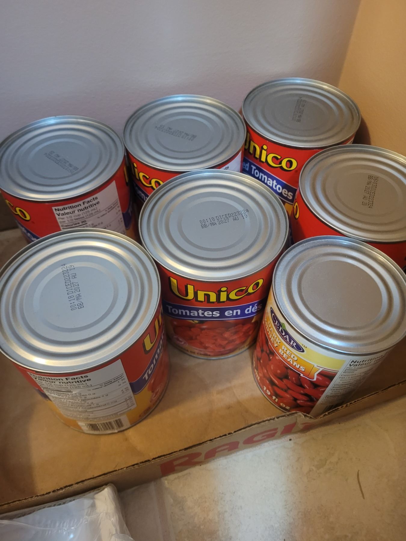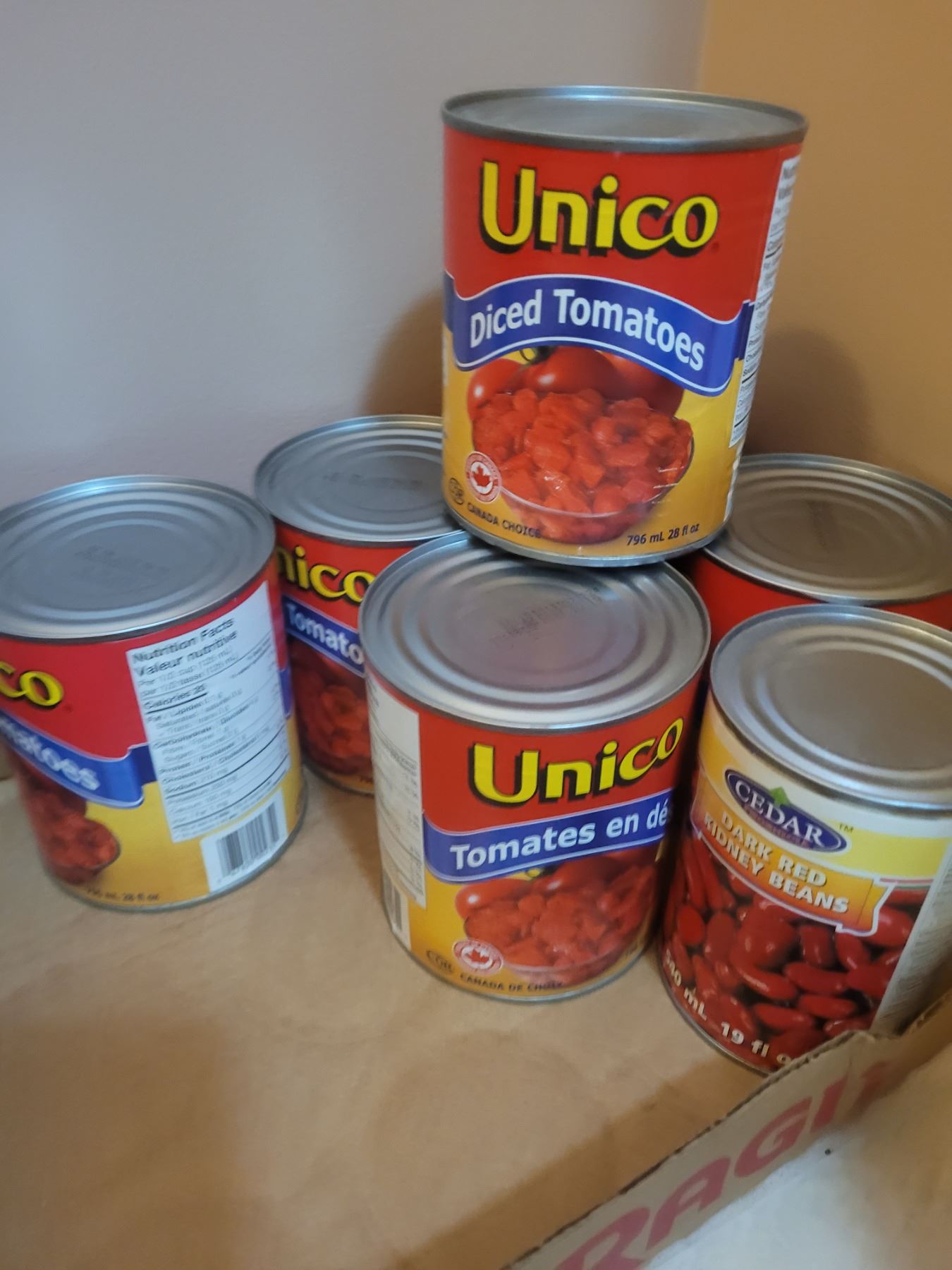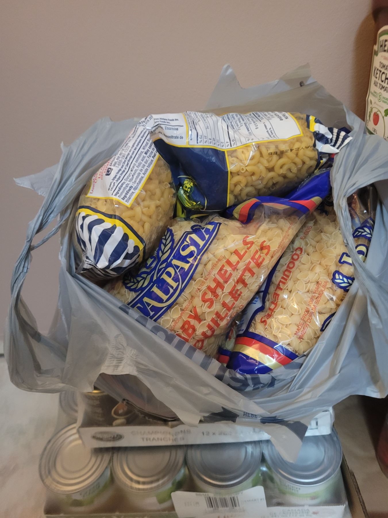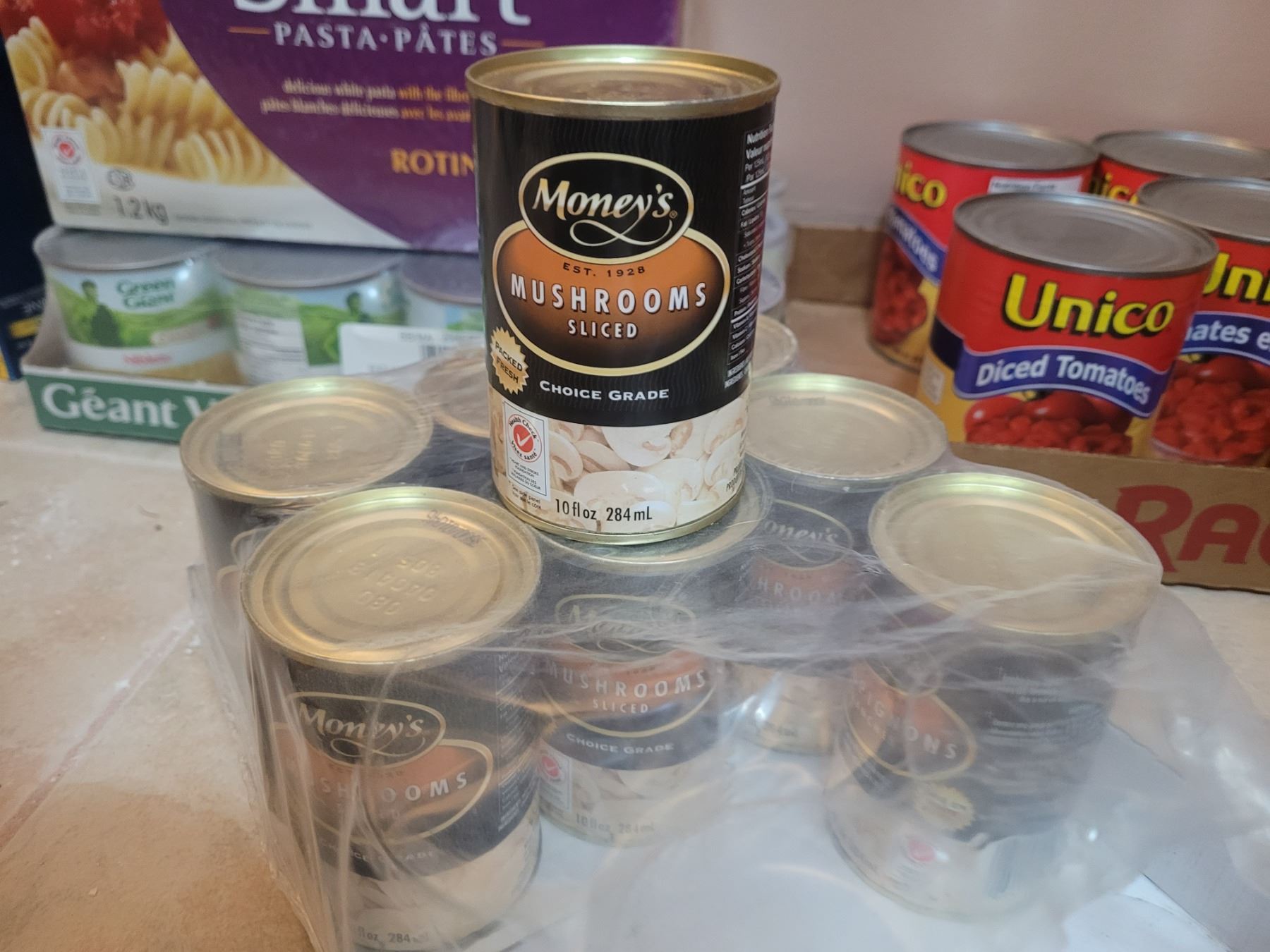 Flats of tinned food. Boxes of pasta. Pickup at 11 am