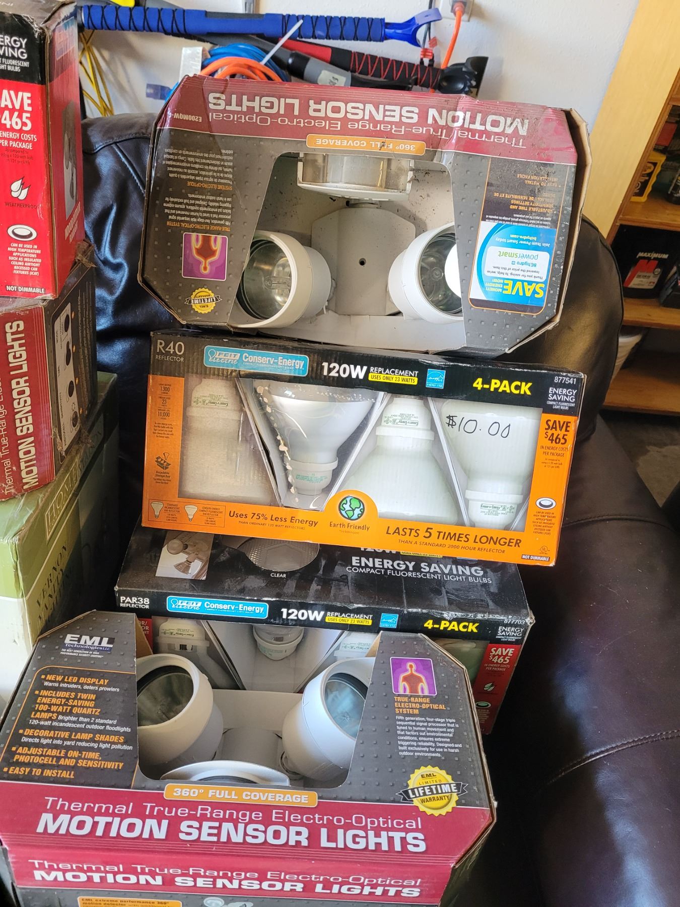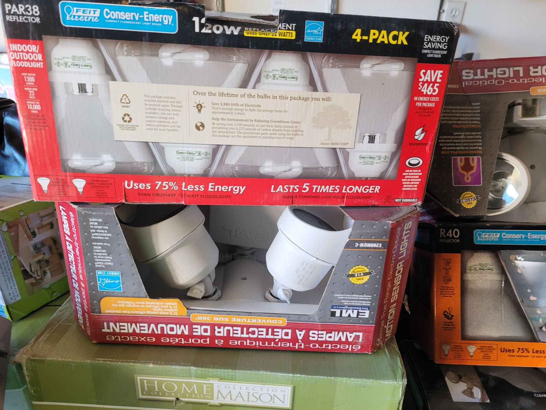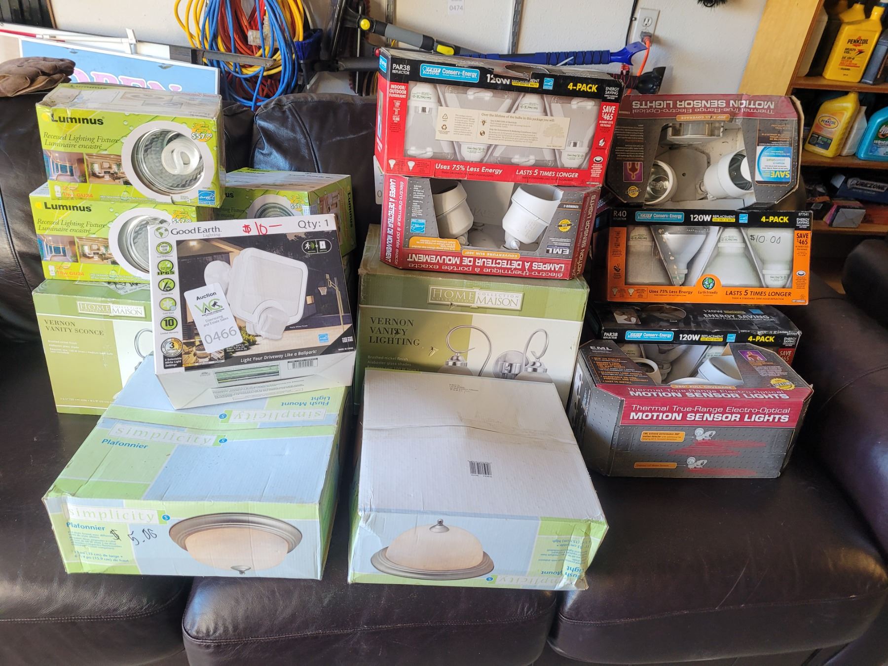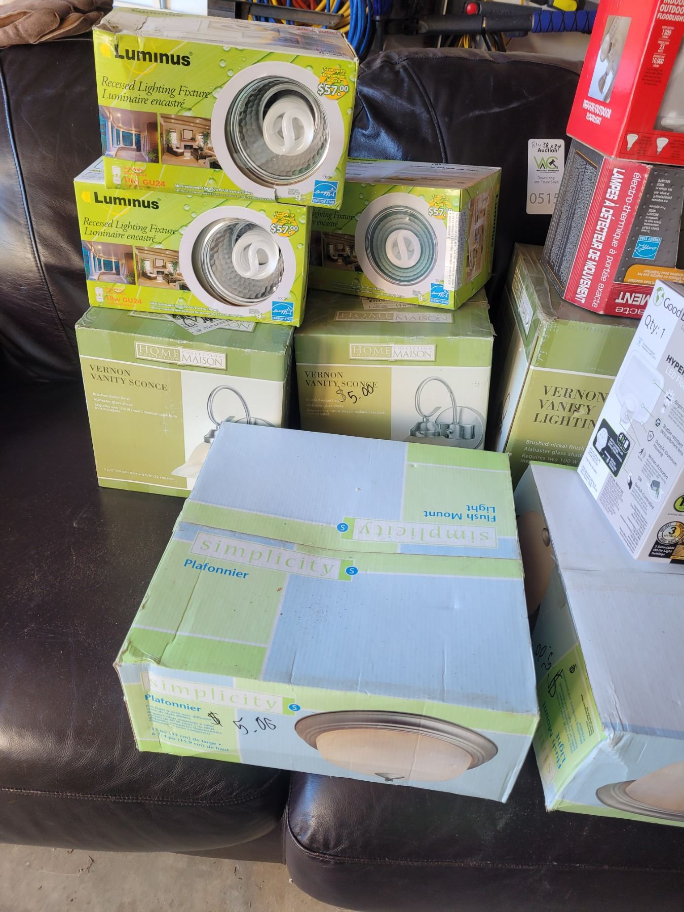 Large assortment of indoor ceiling lights, recessed lighting fixtures, motion sensor lights and bulbs. Pickup at 2 pm