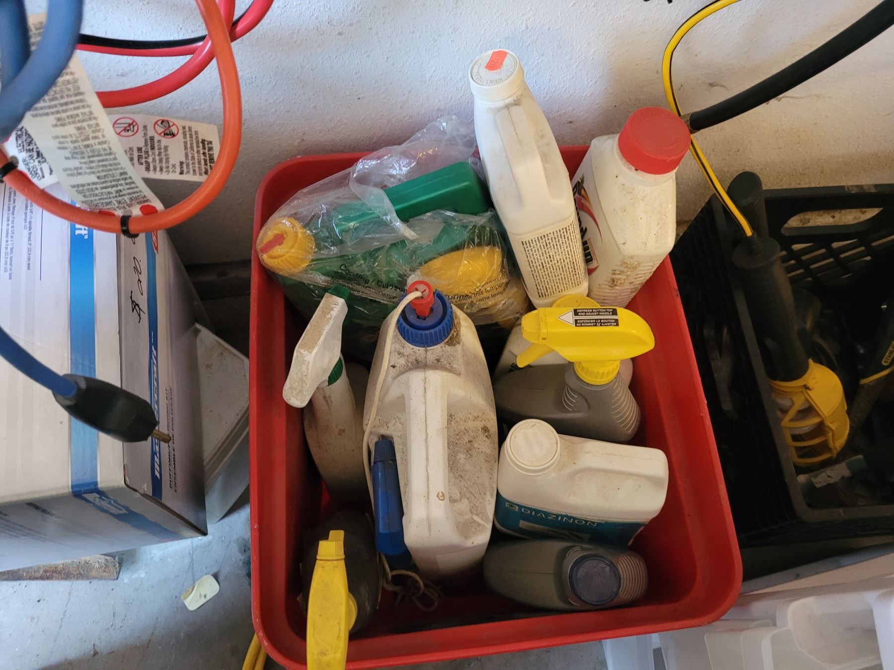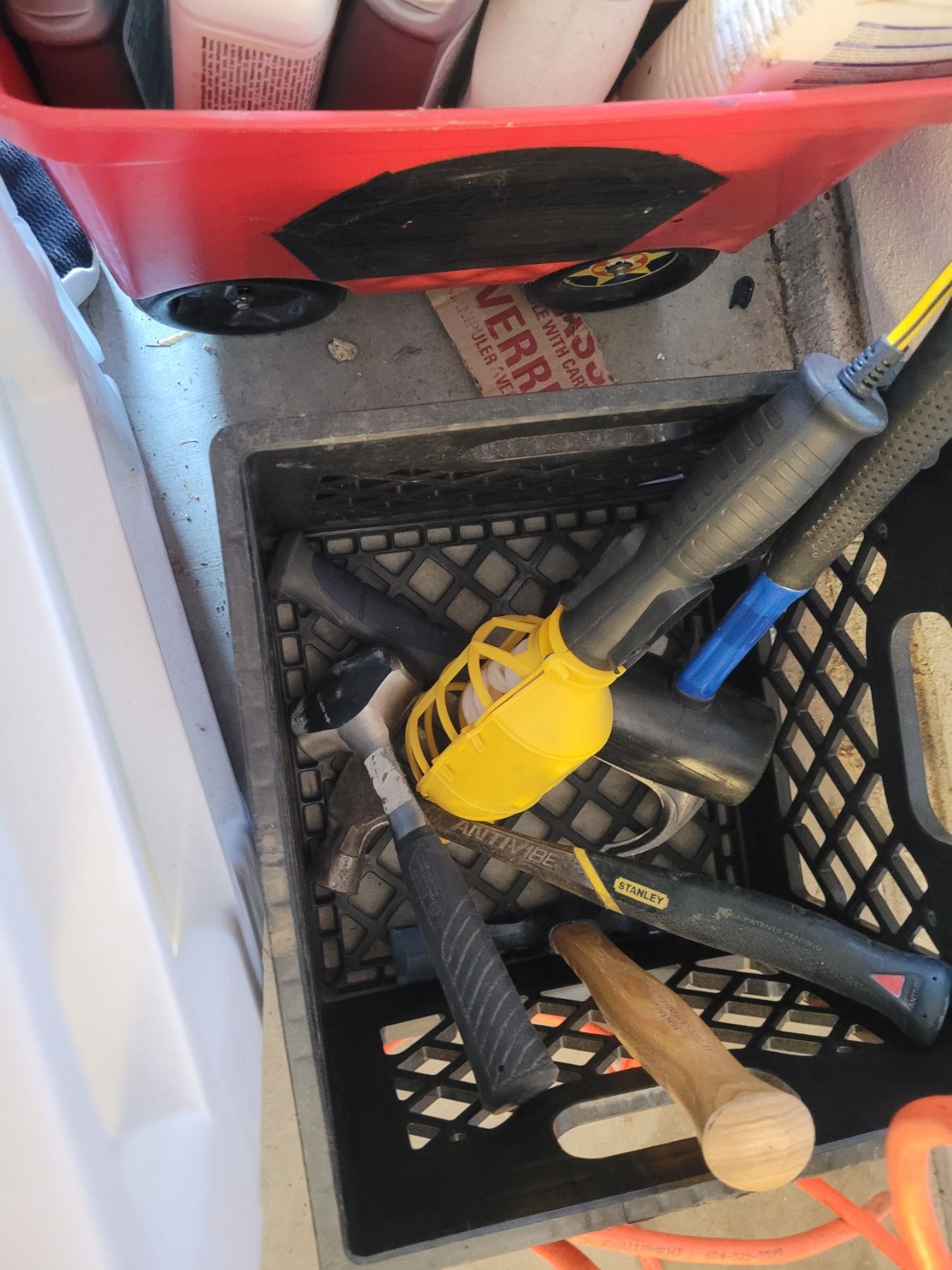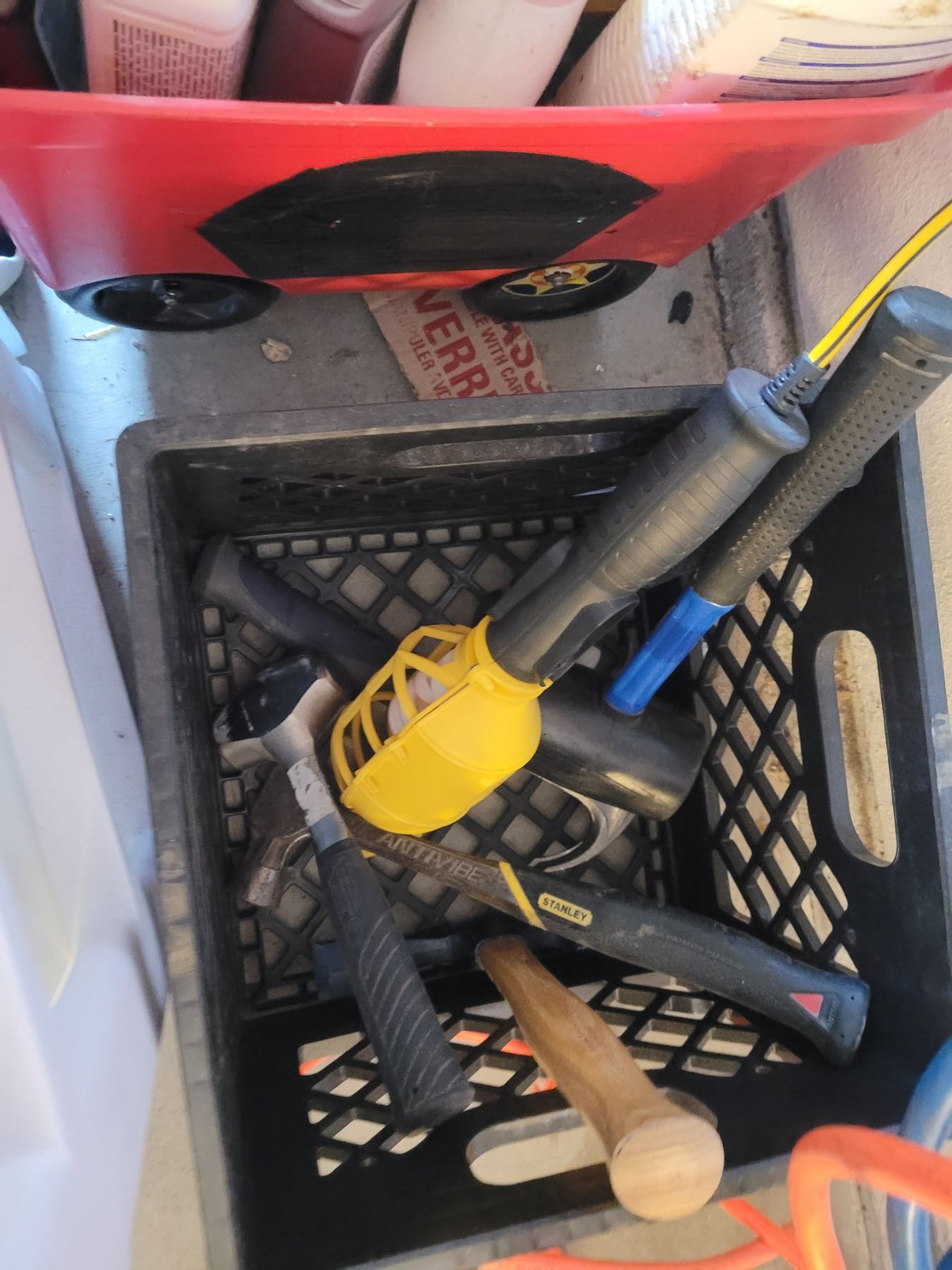 Electrical cords, auto brush, scrapers. Garden & household fluids, hammers. Pickup at 2:30