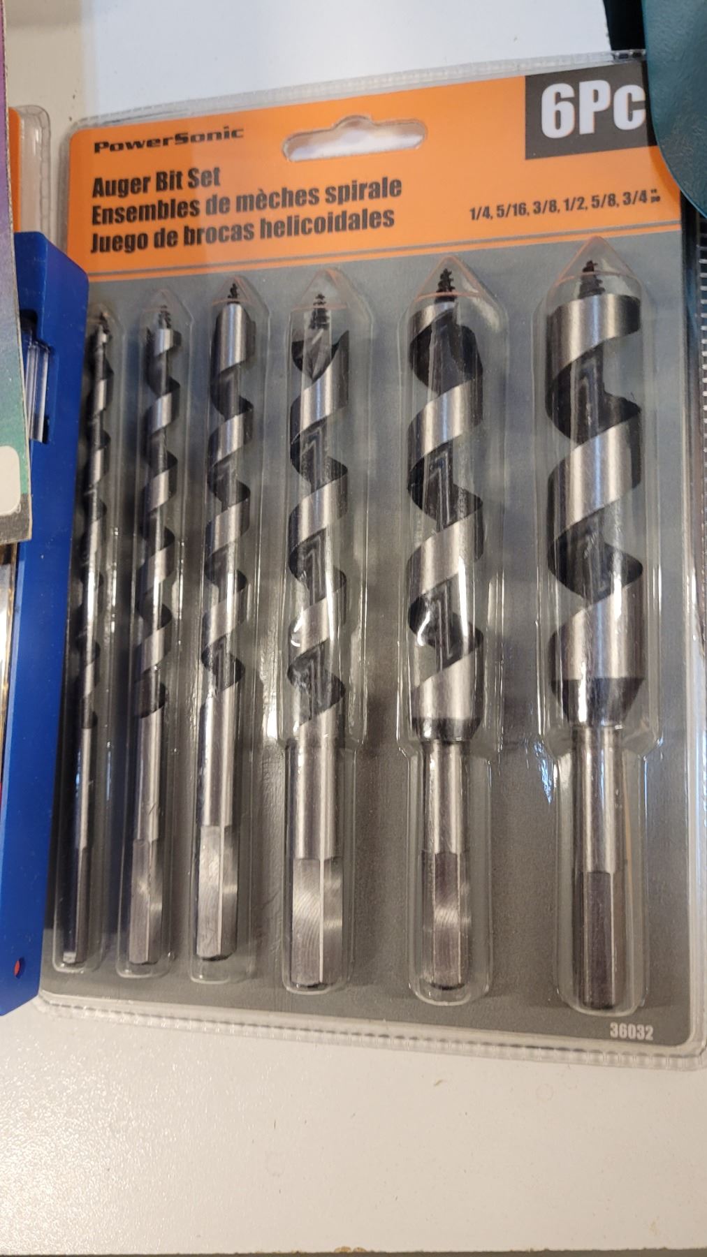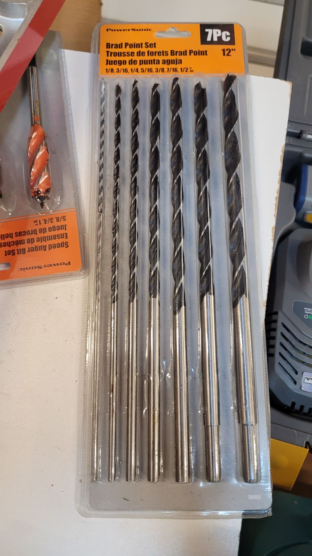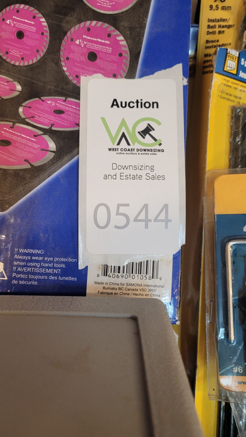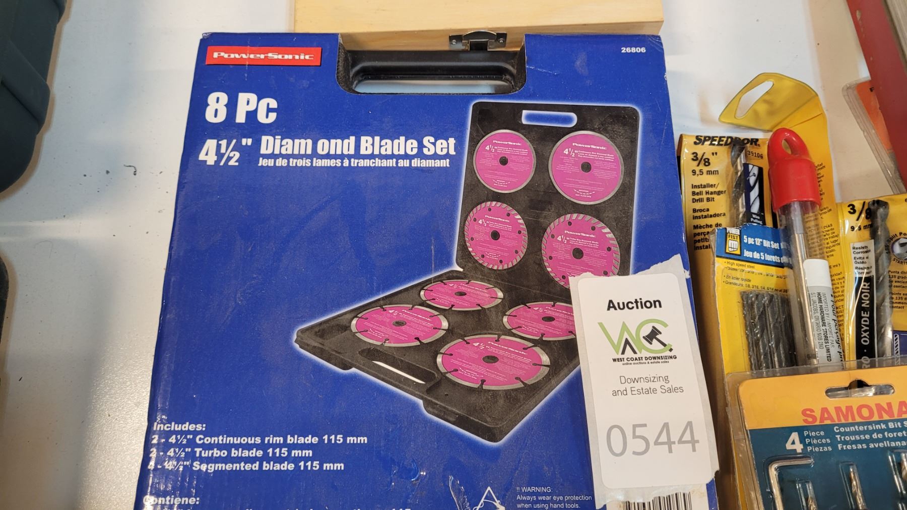 Auger bits, Brad point bits, power sonic 8 pace Diamond blade set. Mastercraft propane, levels torch. Pickup at 2 pm