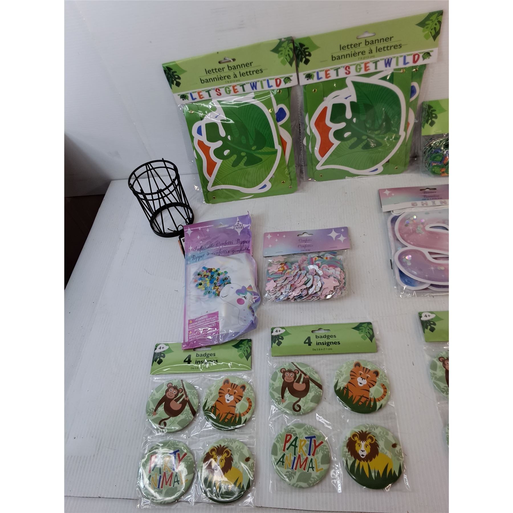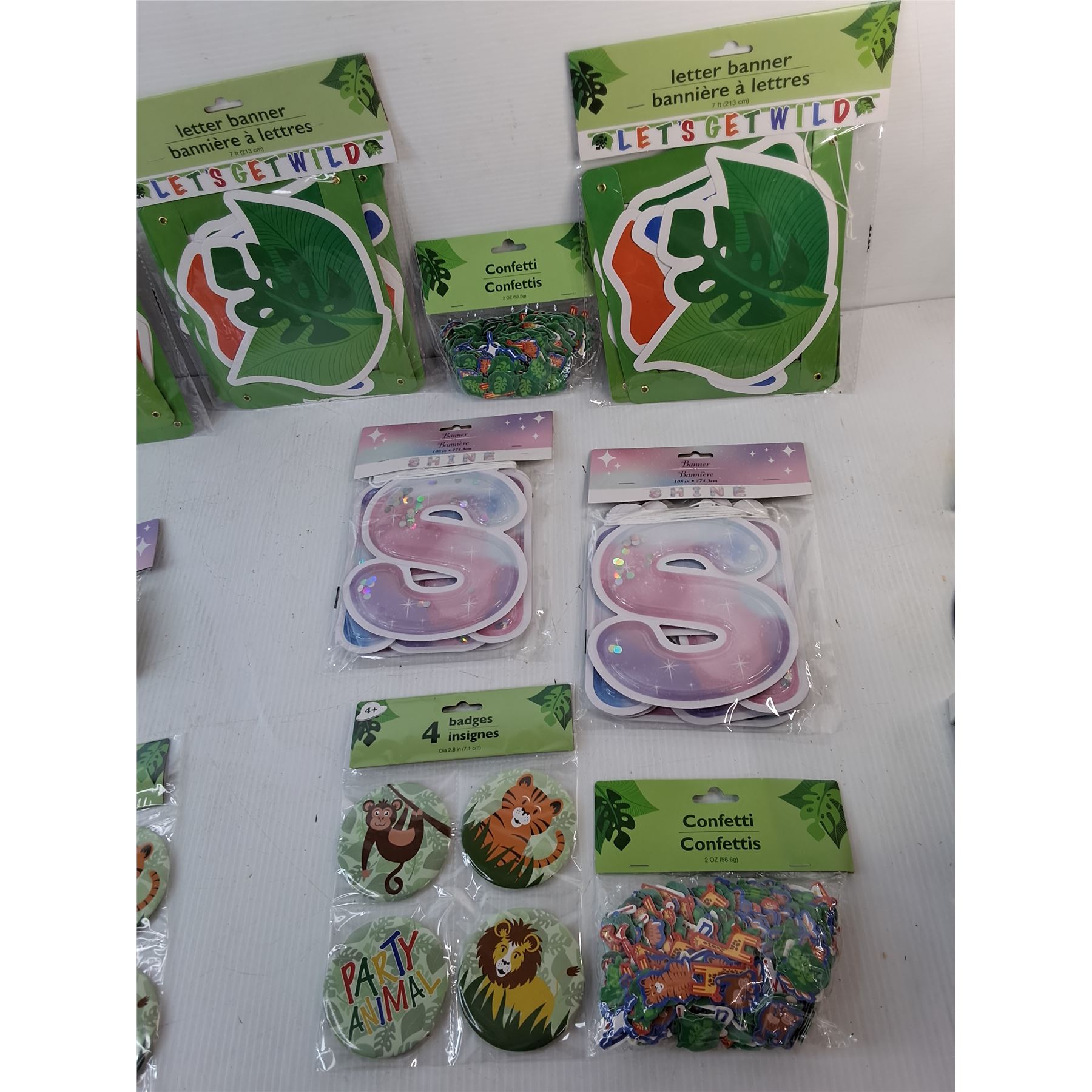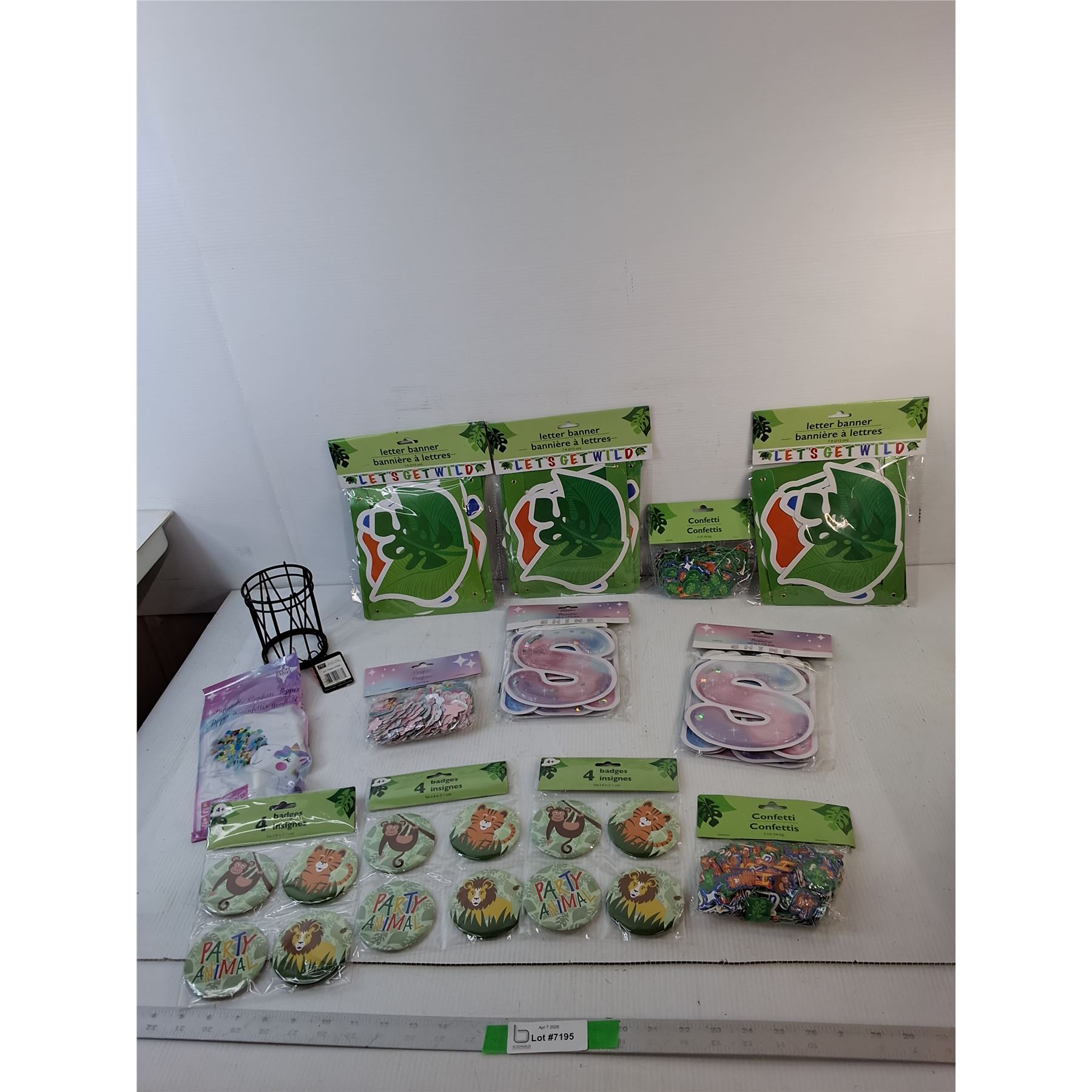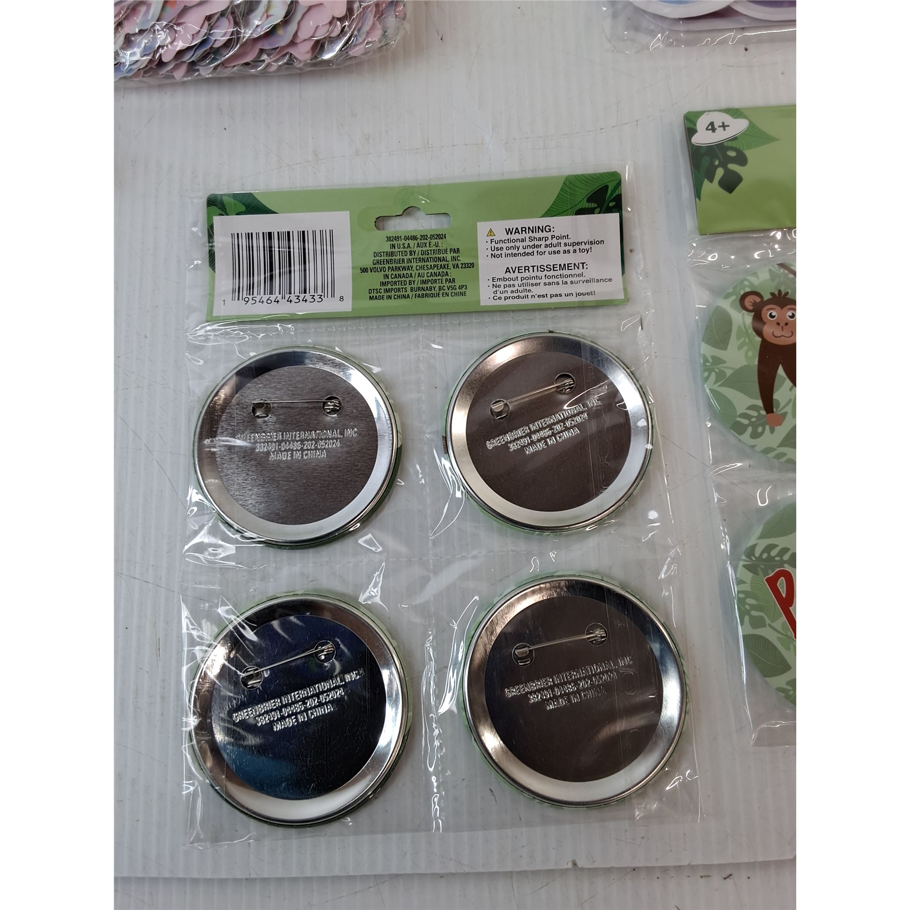 Lot 7195 Kids' Party Supplies- Banners, Confetti, Pins, Misc. Sealed