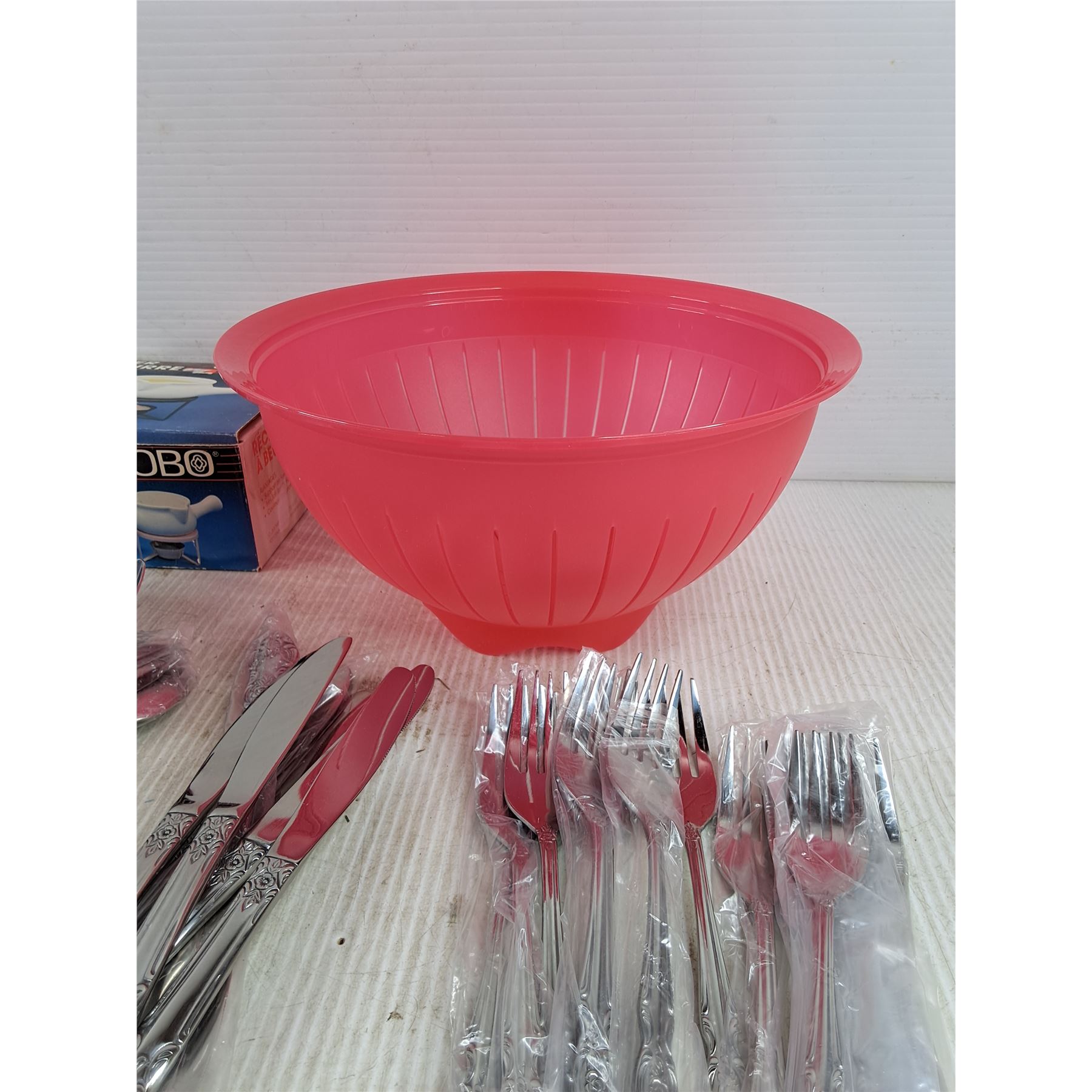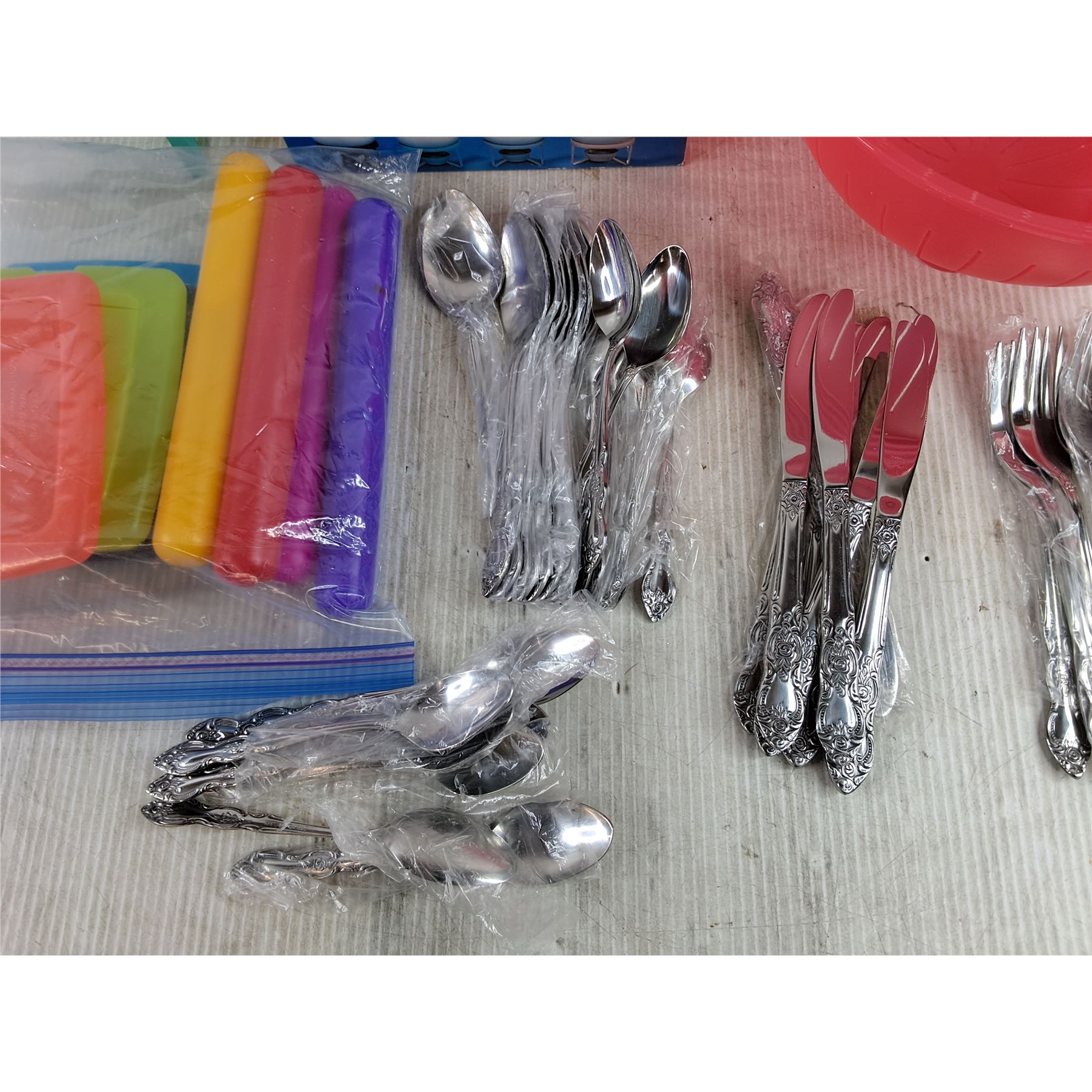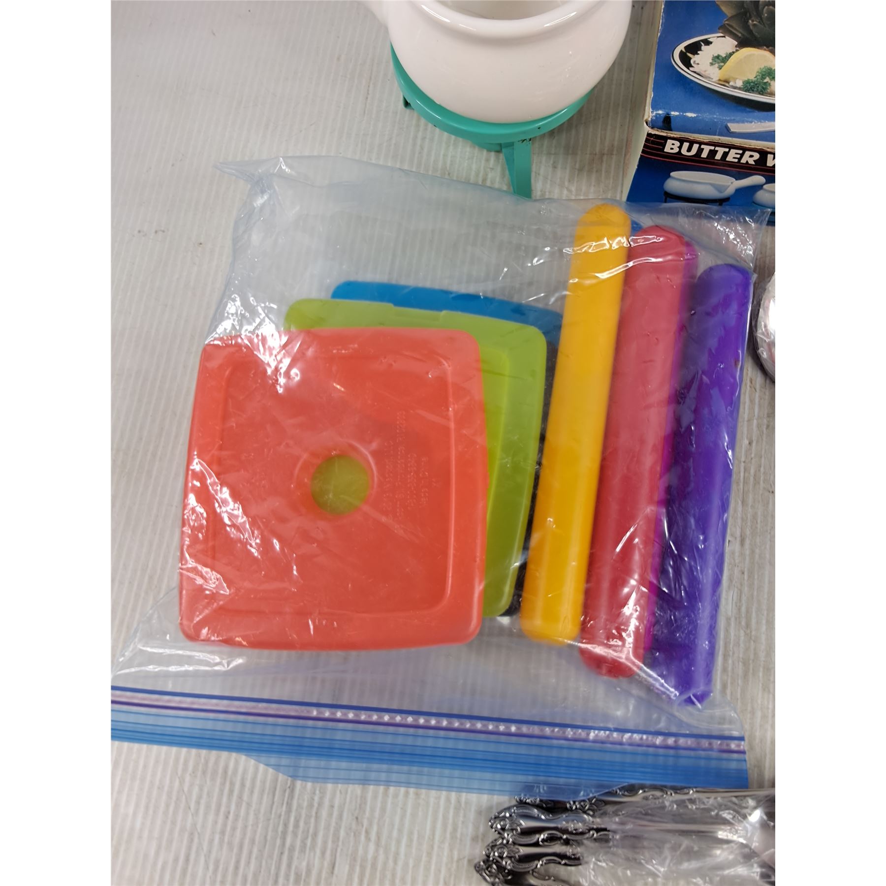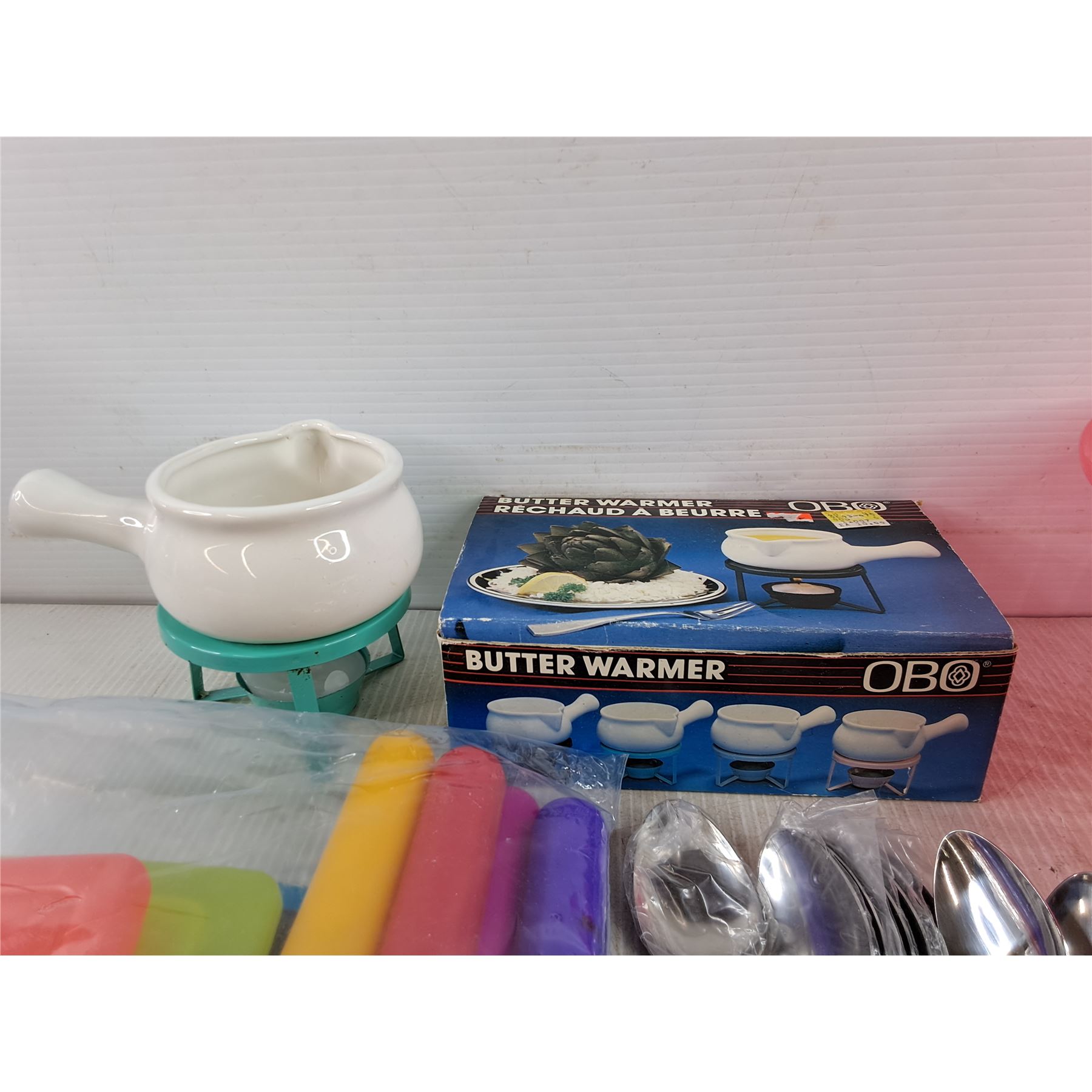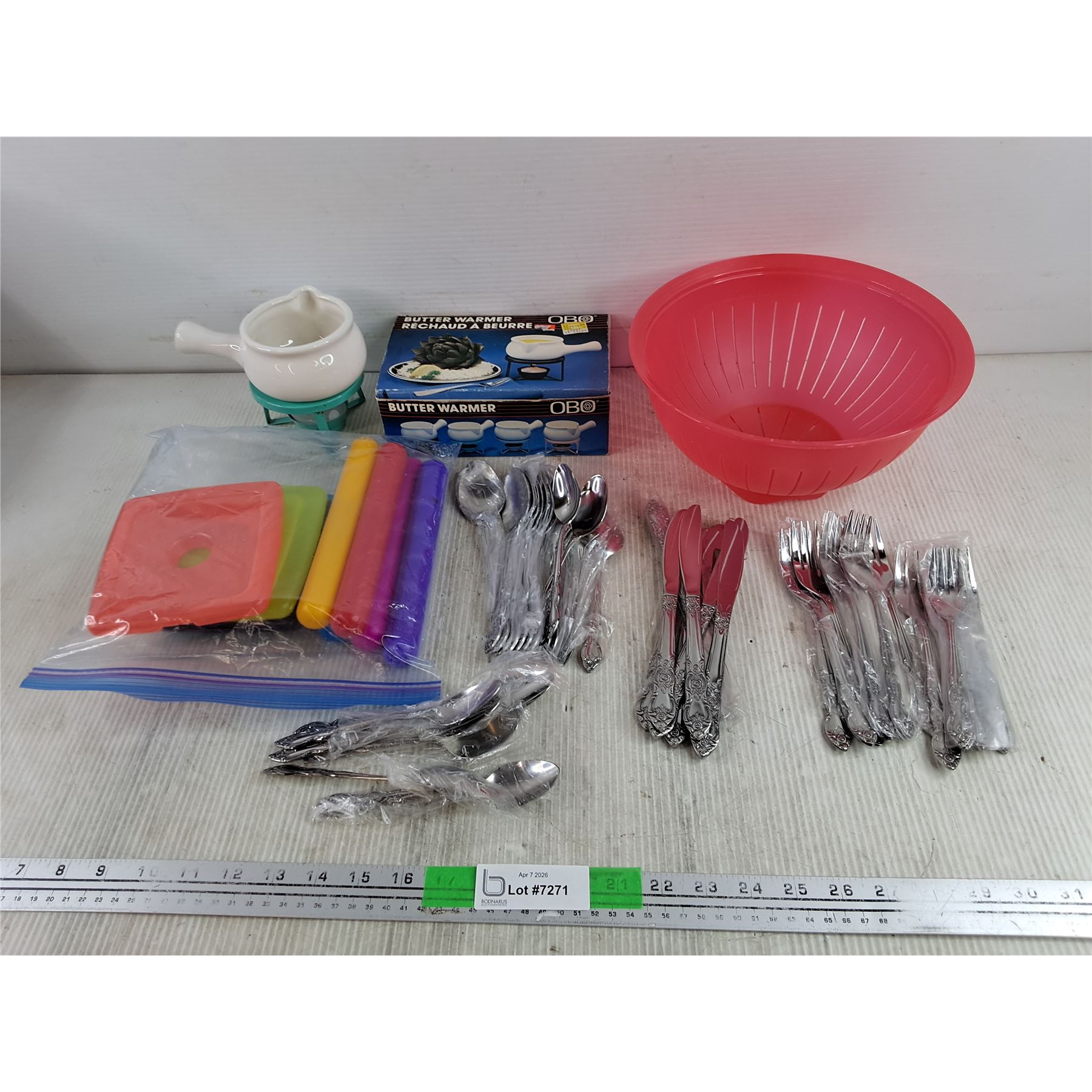 Lot 7271 Cutlery, Ice Packs, Obo Butter Warmer, Plastic Strainer
