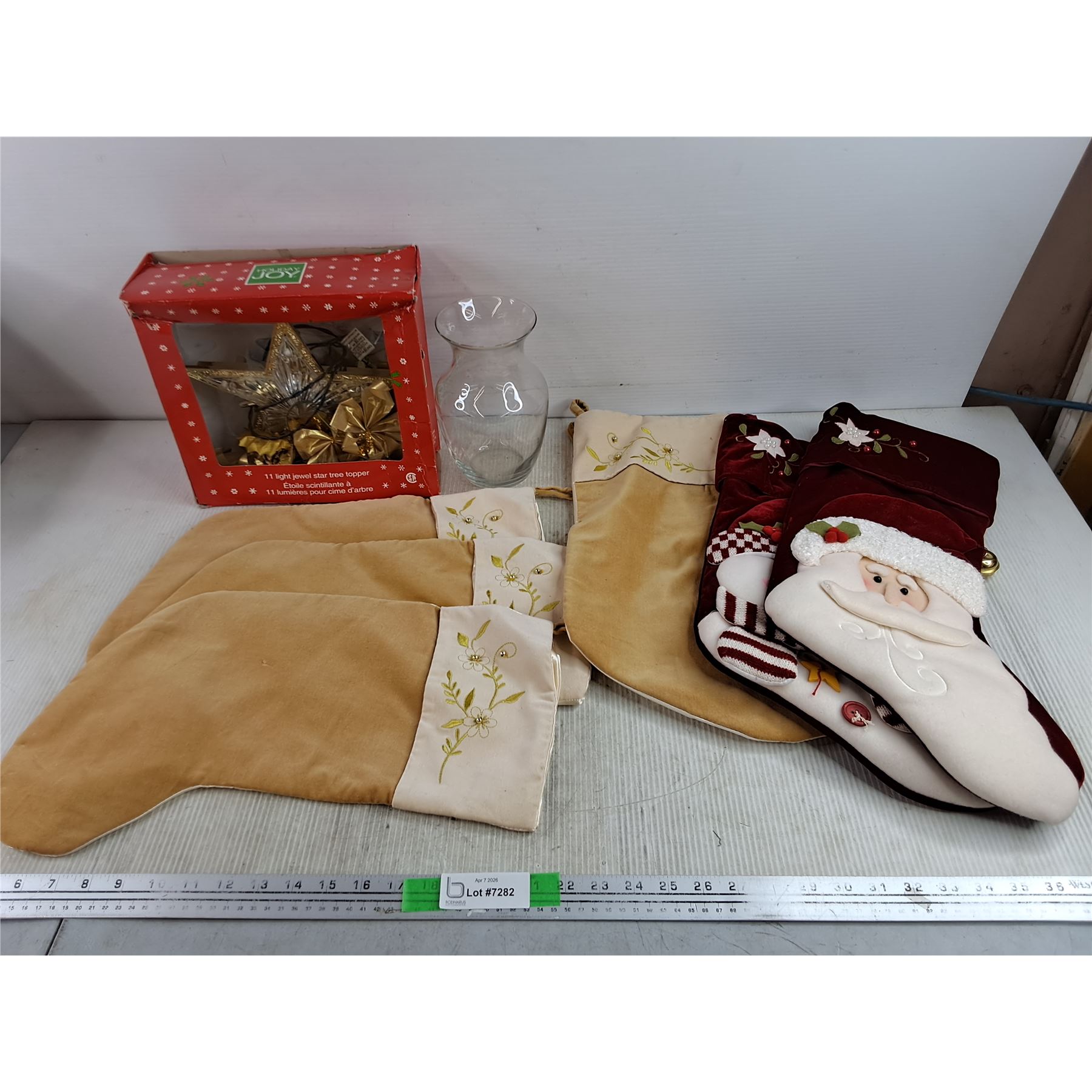 Lot 7282 11 Light Jewel Star Tree Topper, Powers On, As Is, Glass Vase & Christmas Gift Socks