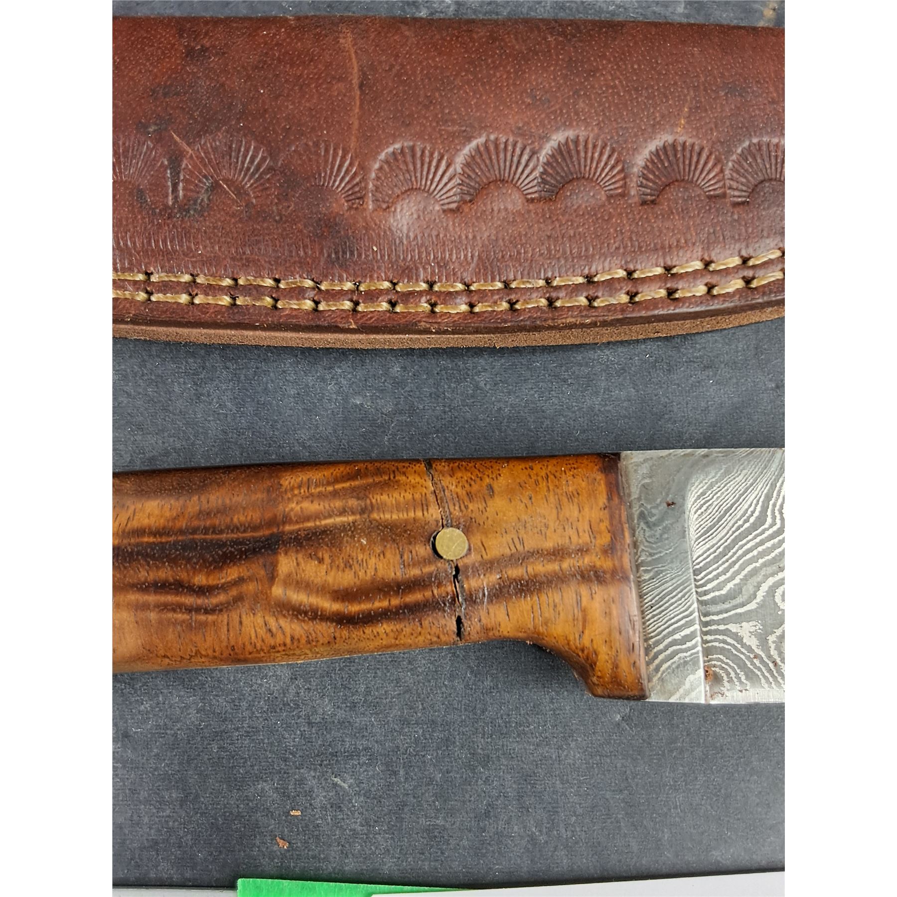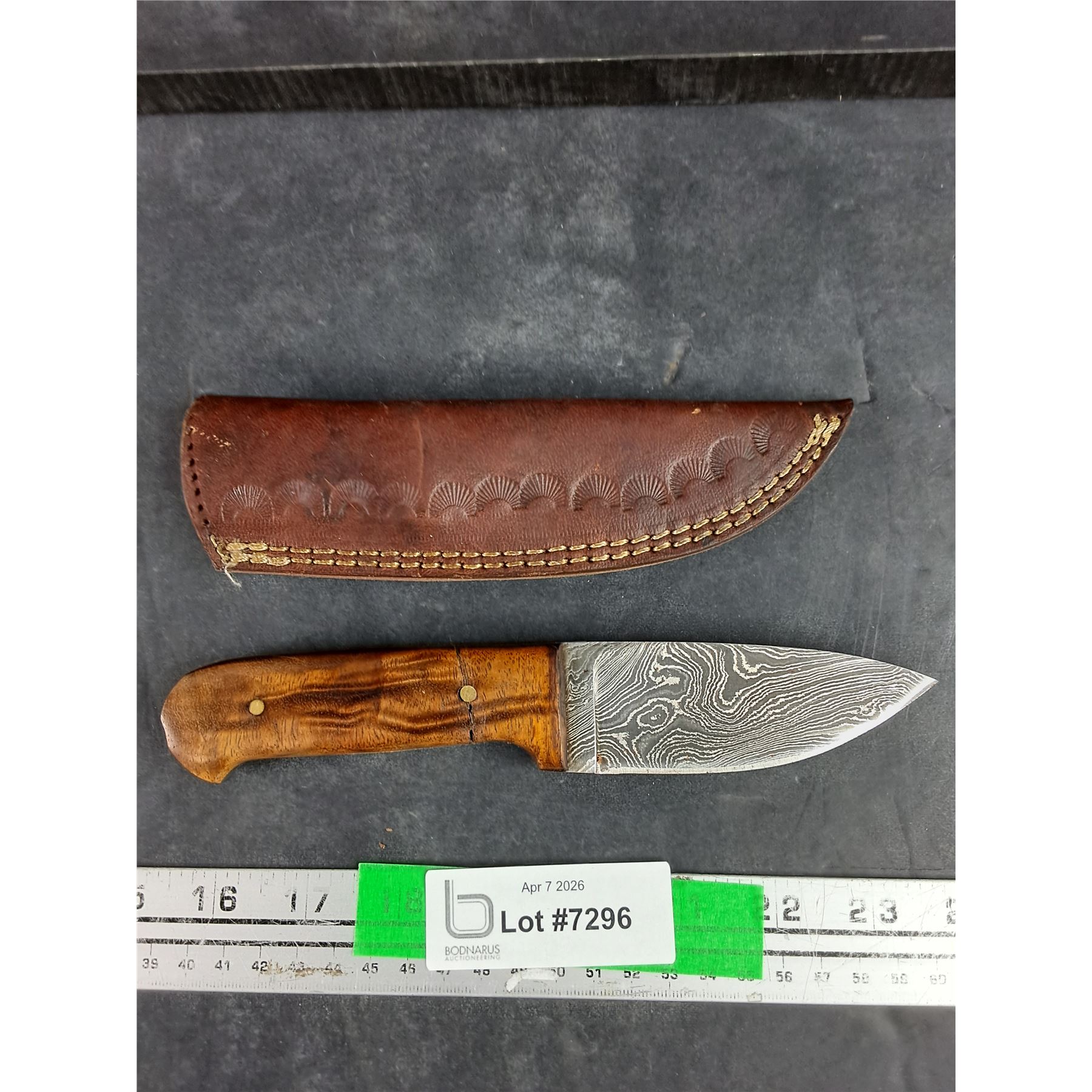 Lot 7296 4" Damascus Steel Knife w/Wooden Handle & Leather Sheath - Some Handle Damage
