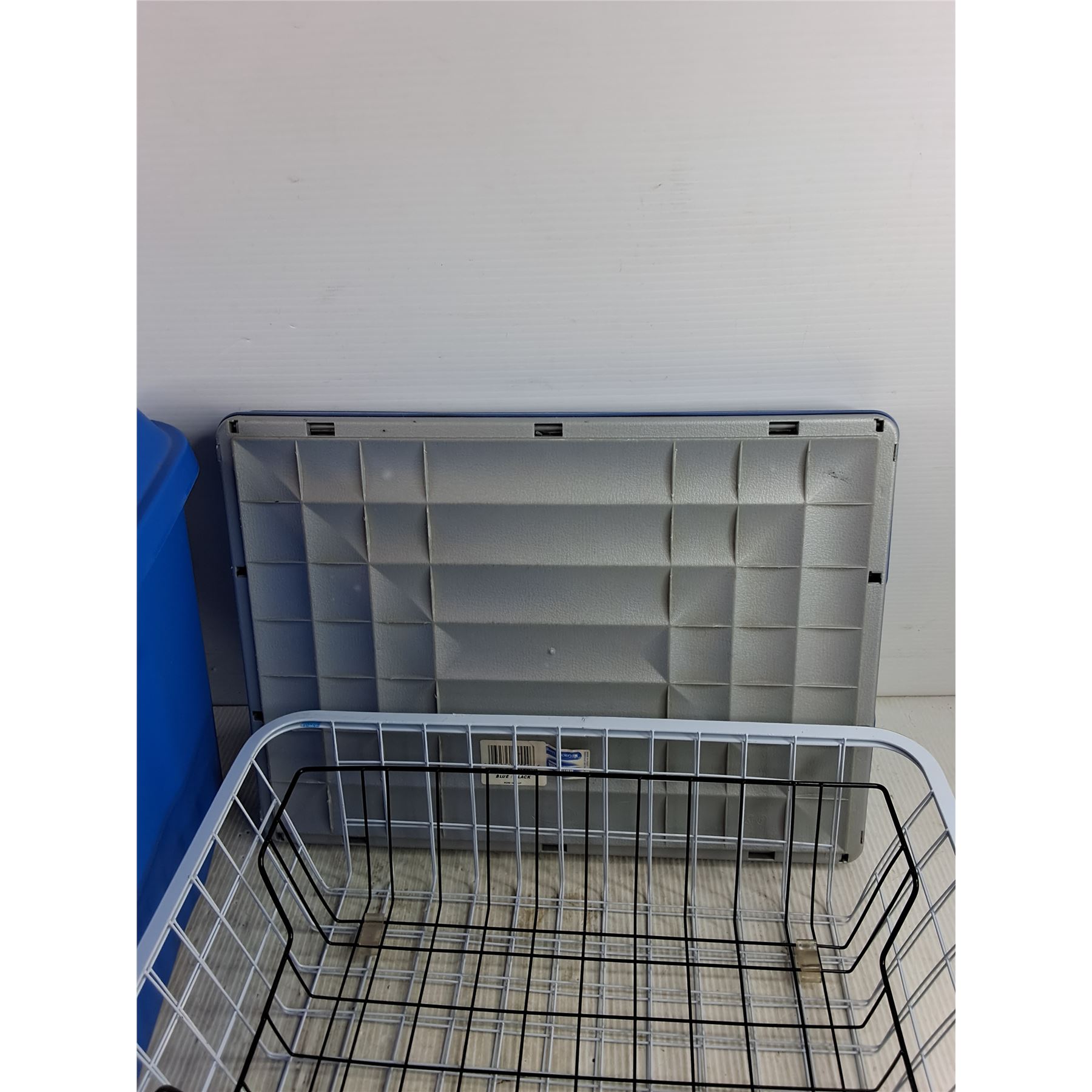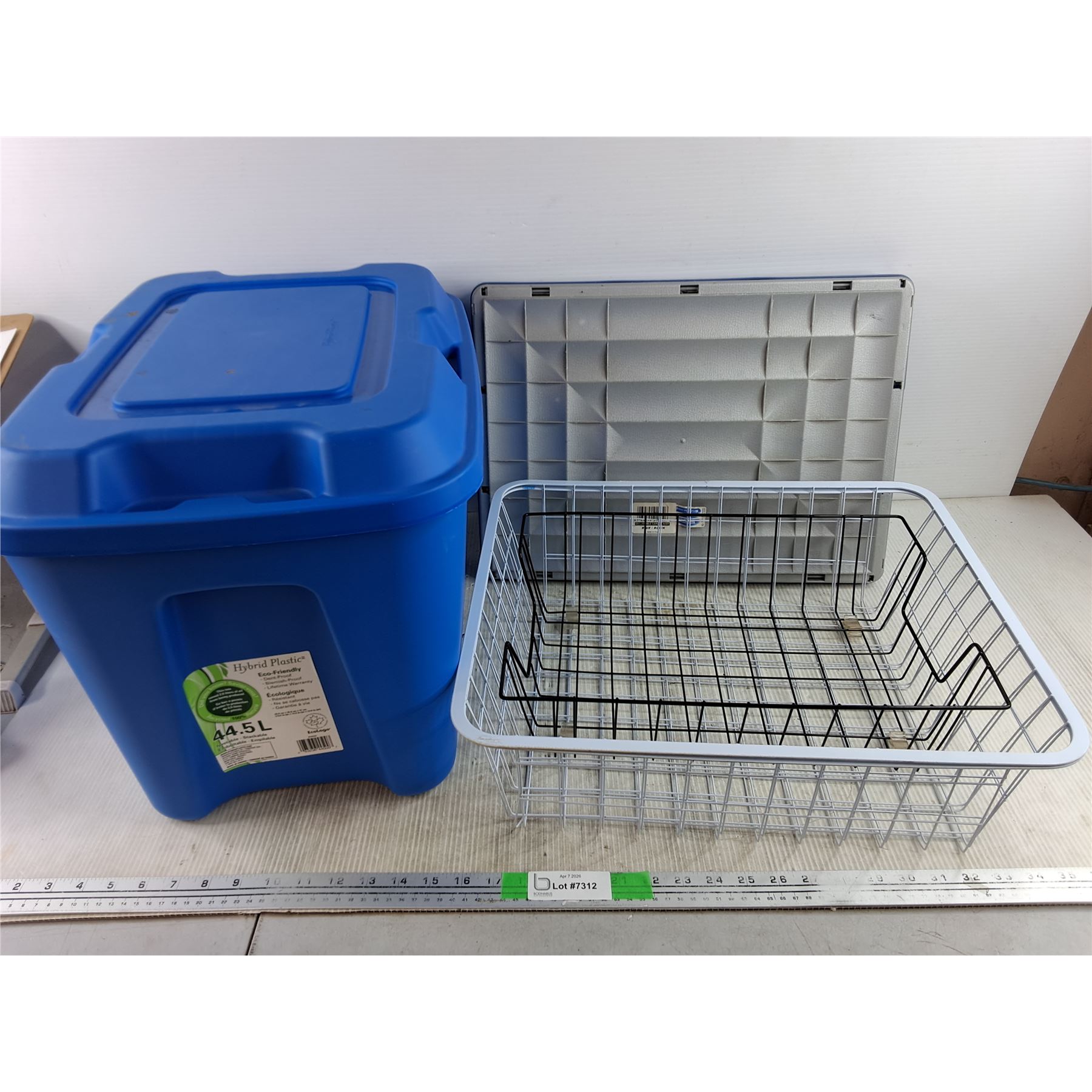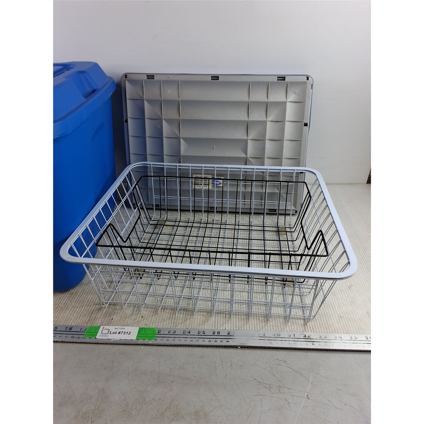 Lot 7312 *44.5L Plastic Tote w/Lid, Collapsible Cargo Caddy, (2) Wire Baskets, Cannot Ship