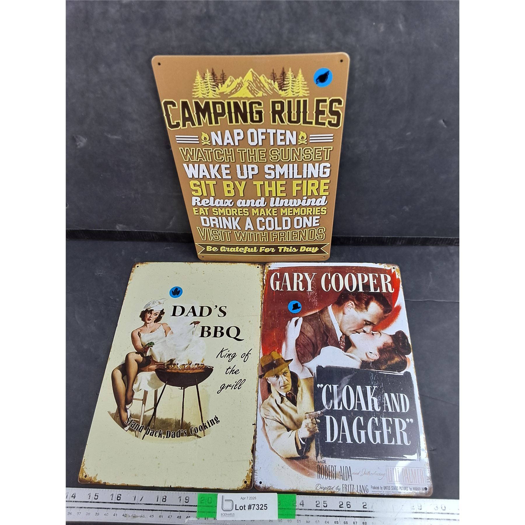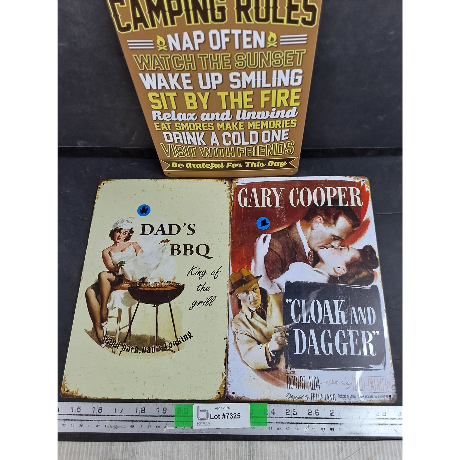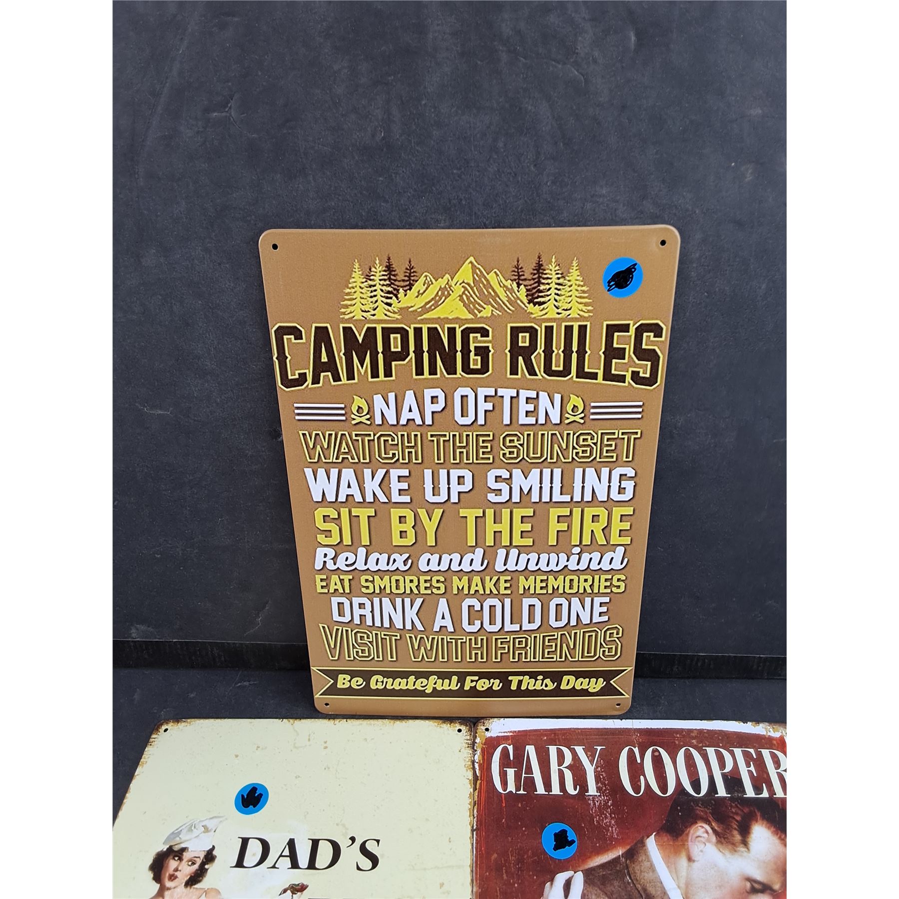 Lot 7325 (3) Metal Signs 12" x 8" - Dad's BBQ, Camping Rules, Gary Cooper