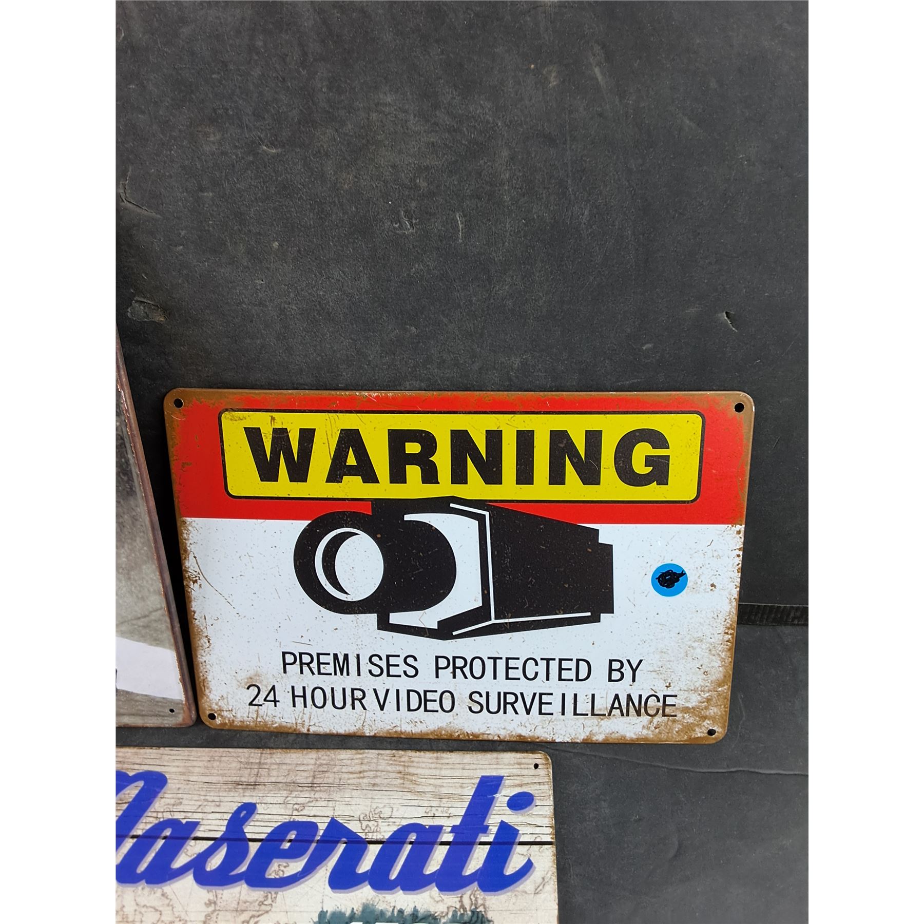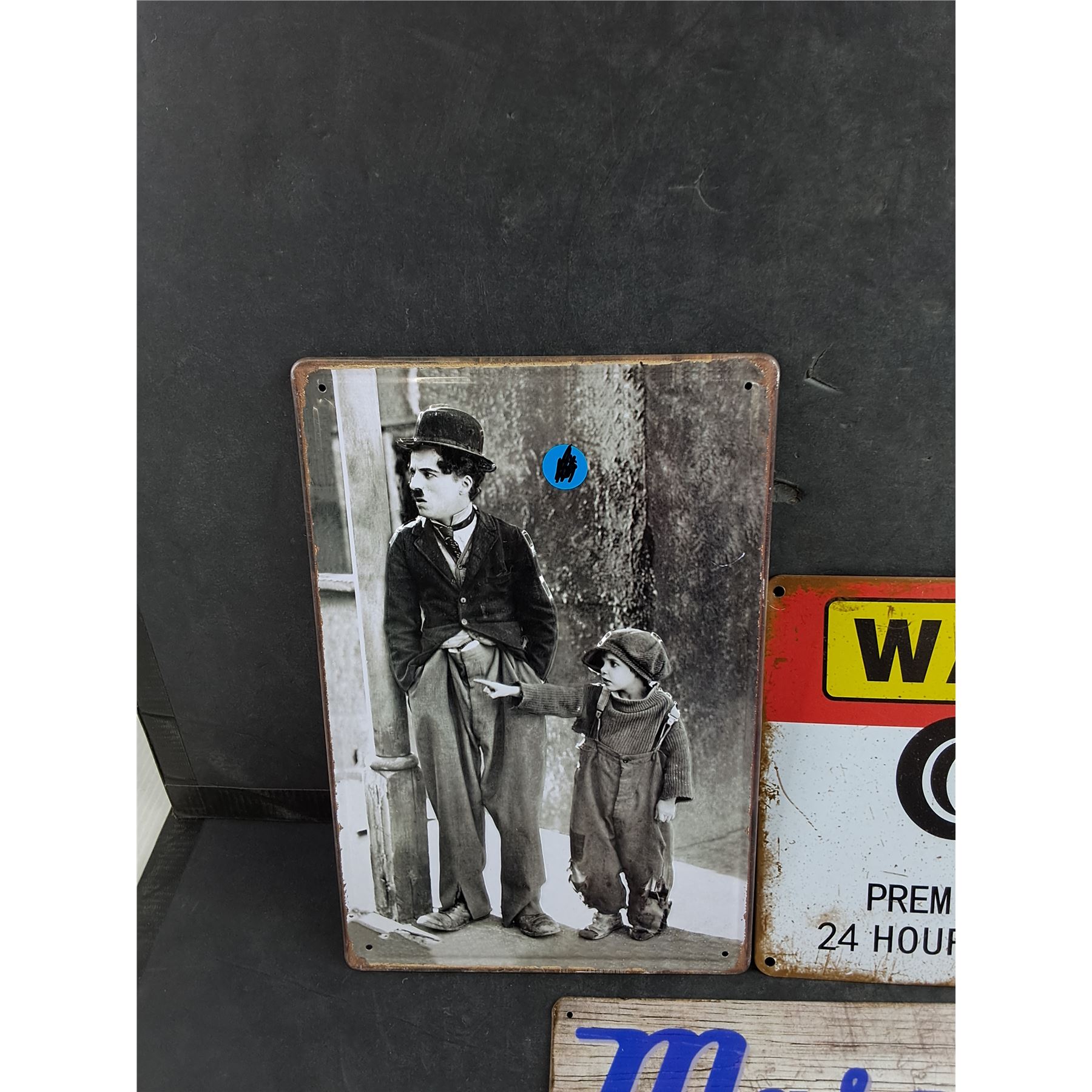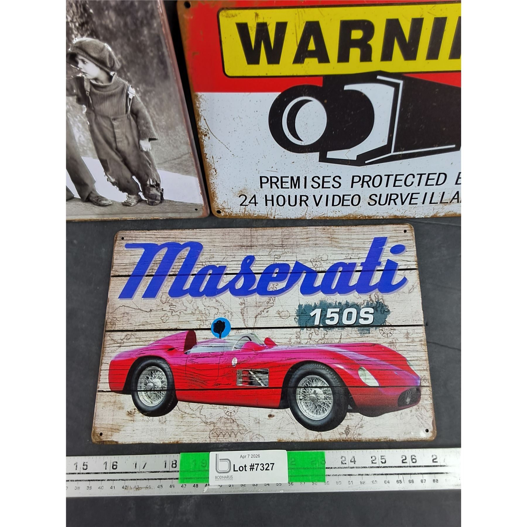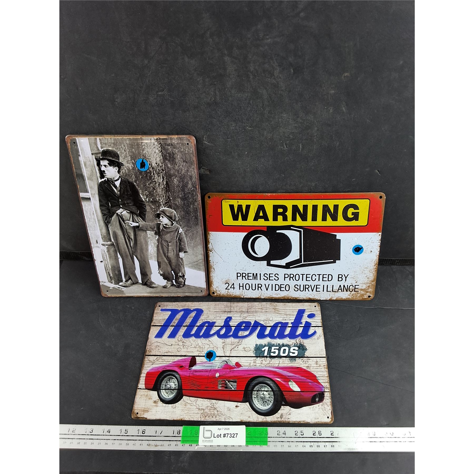 Lot 7327 (3) Metal Signs 12" x 8" - Warning, Maserati, Charlie Chaplin