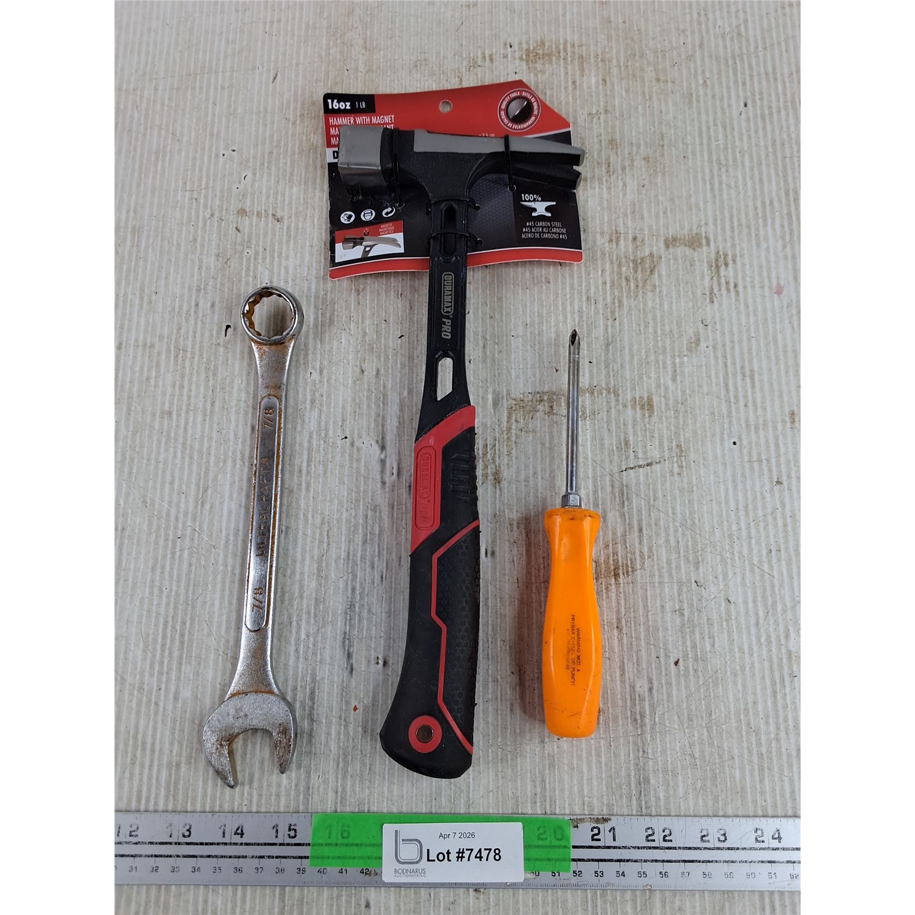 Lot 7478 16 oz Hammer w/ Magnet, Philips Screwdriver, Combination Wrench